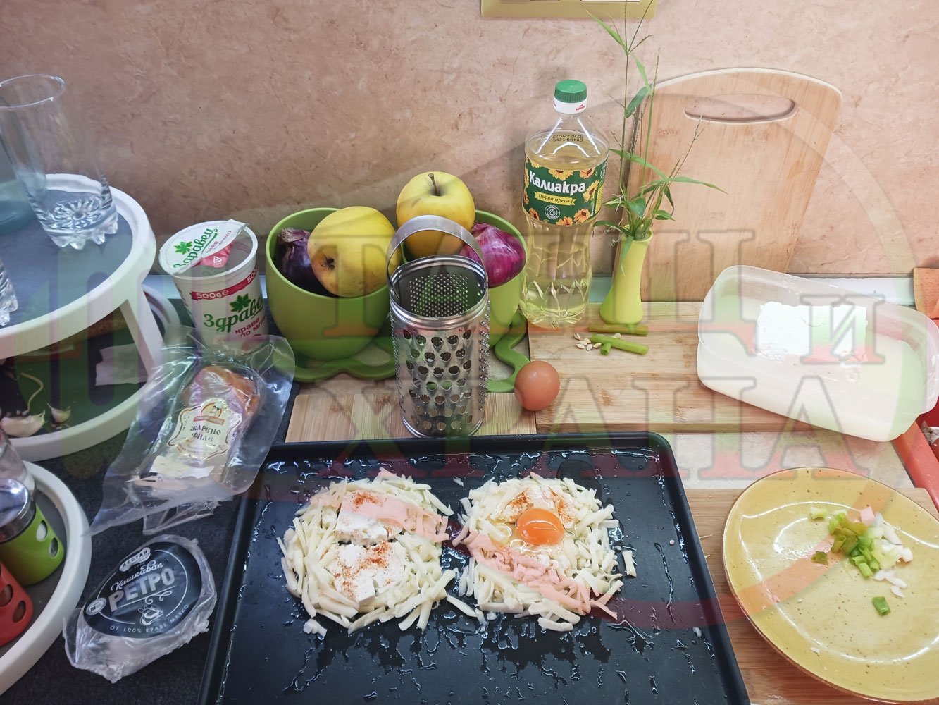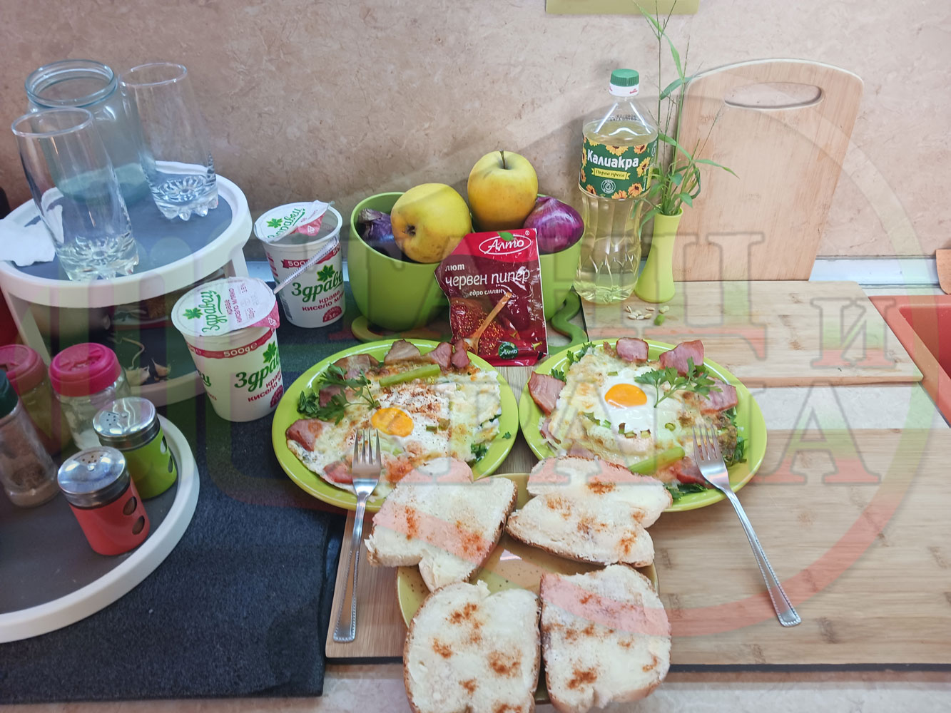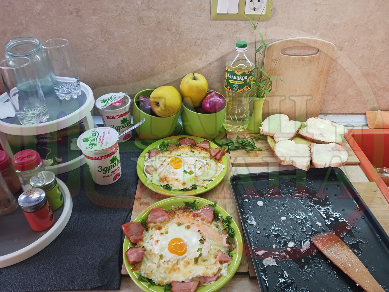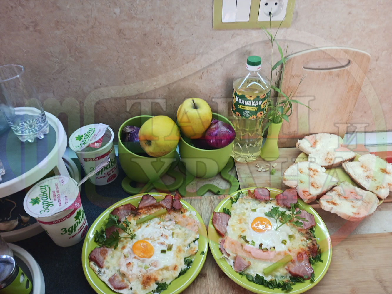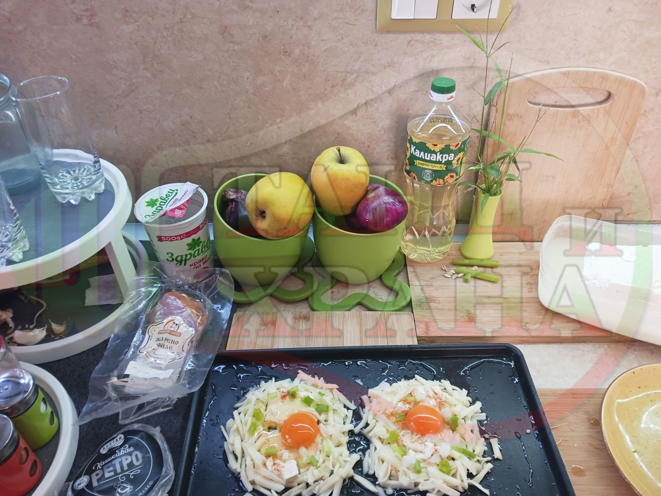 Яйца на очи "Кашкаваленояйчени филежаренови с БГсирене" запечени на фурна с млечен кашкавал, жарено филе, червен сладък пипер, пресен лук и краве бяло сирене (българско, саламурено) гарнирани с млечна основа от кисело мляко от България и магданоз