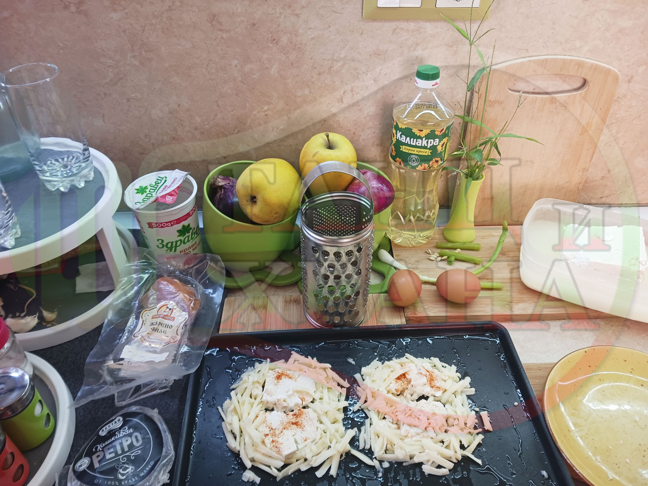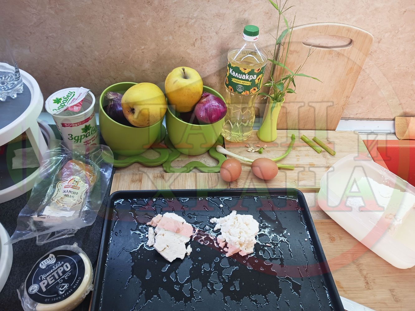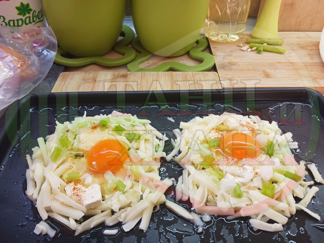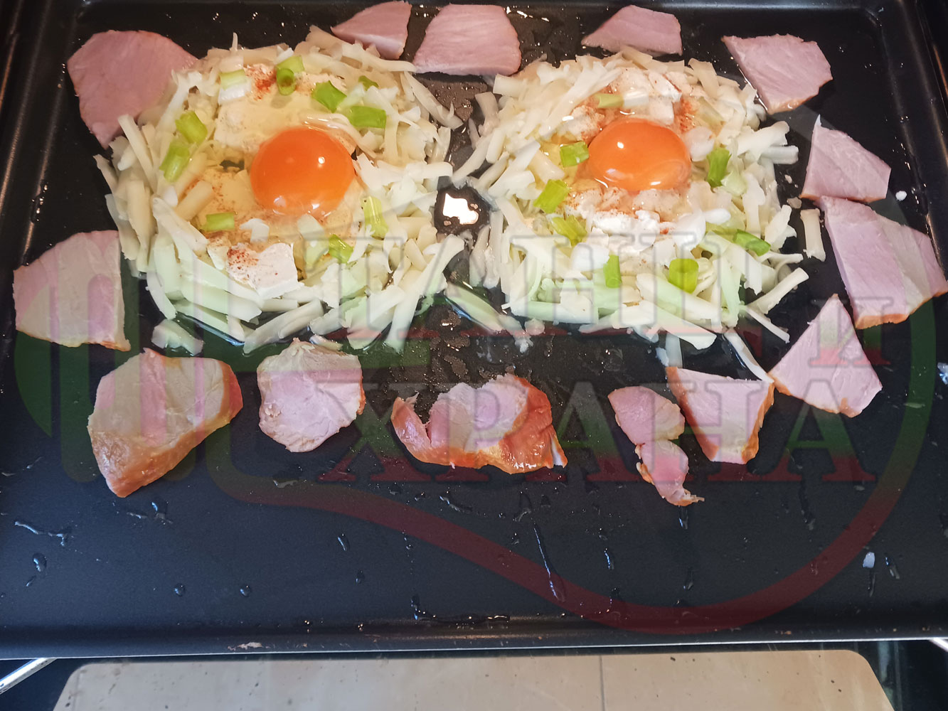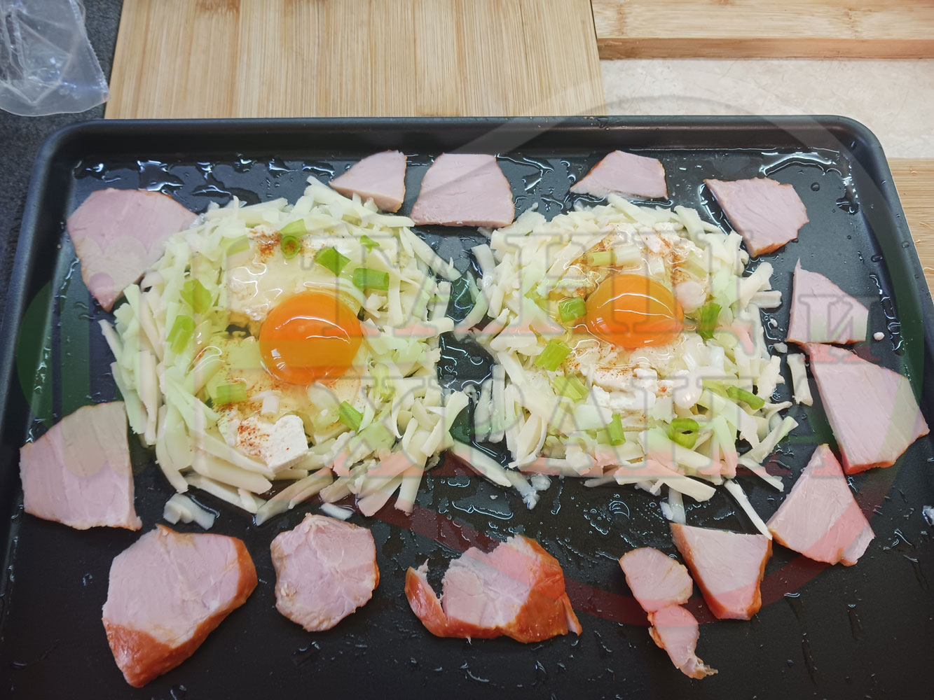 Яйца на очи "Кашкаваленояйчени филежаренови с БГсирене" запечени на фурна с млечен кашкавал, жарено филе, червен сладък пипер, пресен лук и краве бяло сирене (българско, саламурено) гарнирани с млечна основа от кисело мляко от България и магданоз