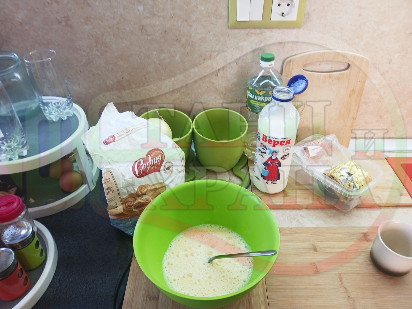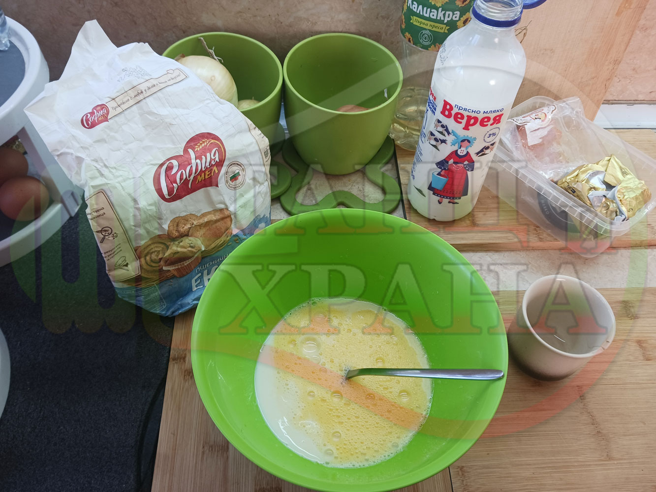 Разбийте яйцата със солта и захарта в купа. Сипете прясното мляко, разбъркайте и добавете брашното. Отново разбийте продуктите до образуване на средно гъсто бухтено, хомогенизирано тесто.