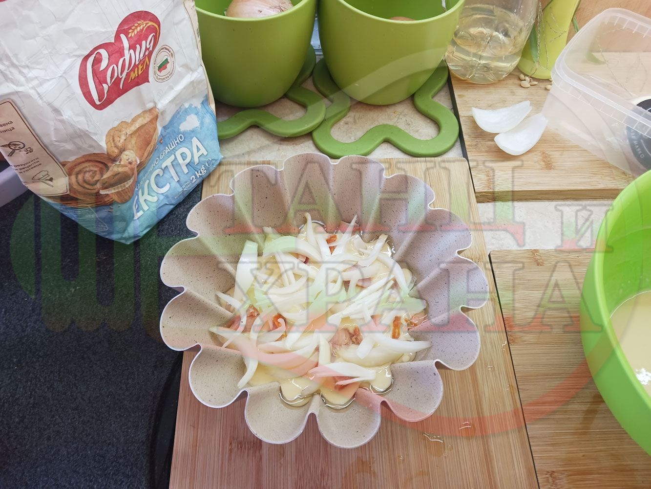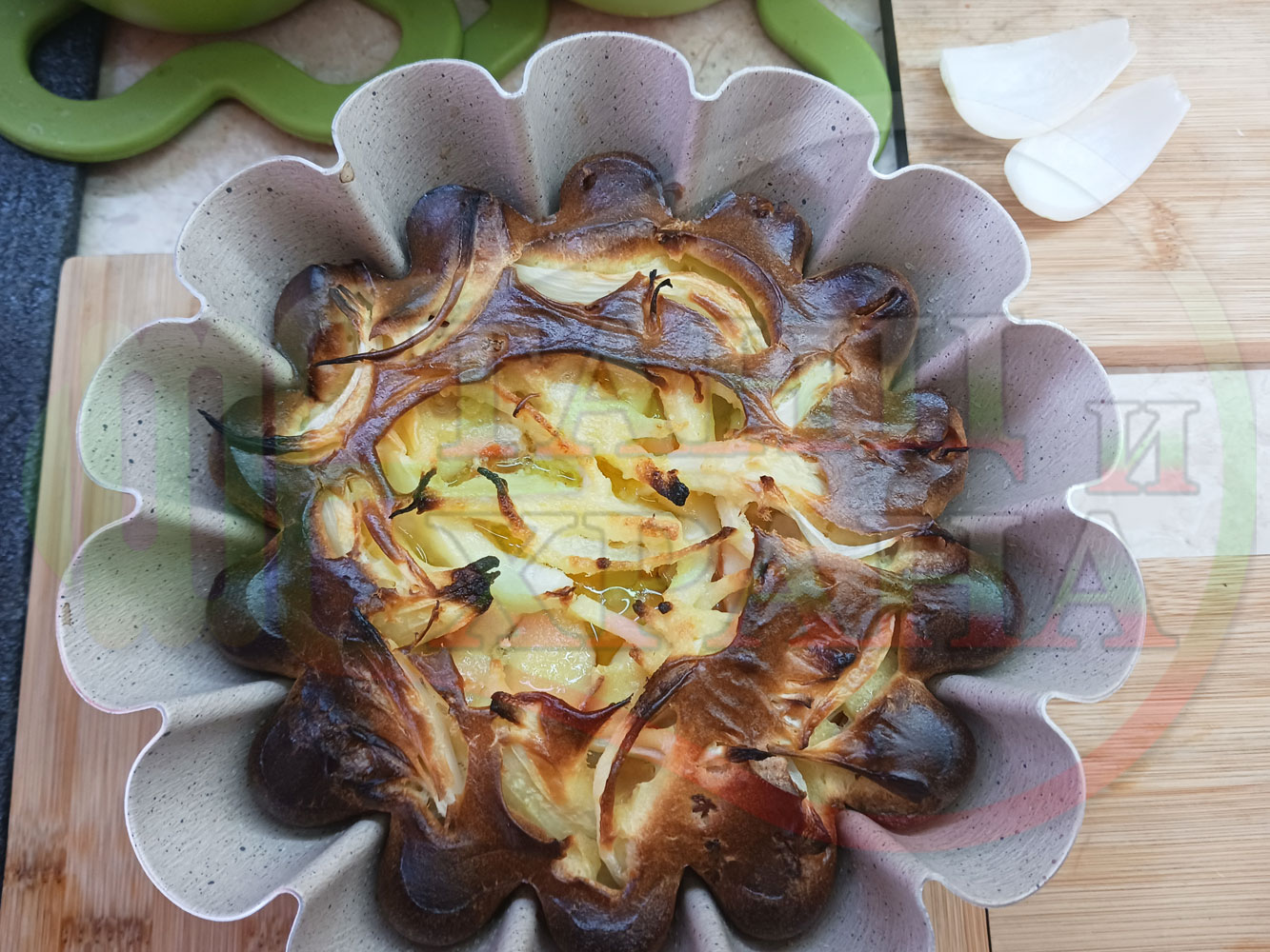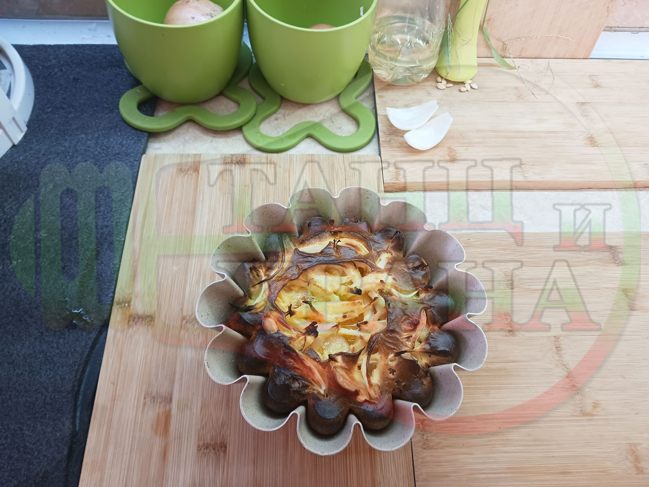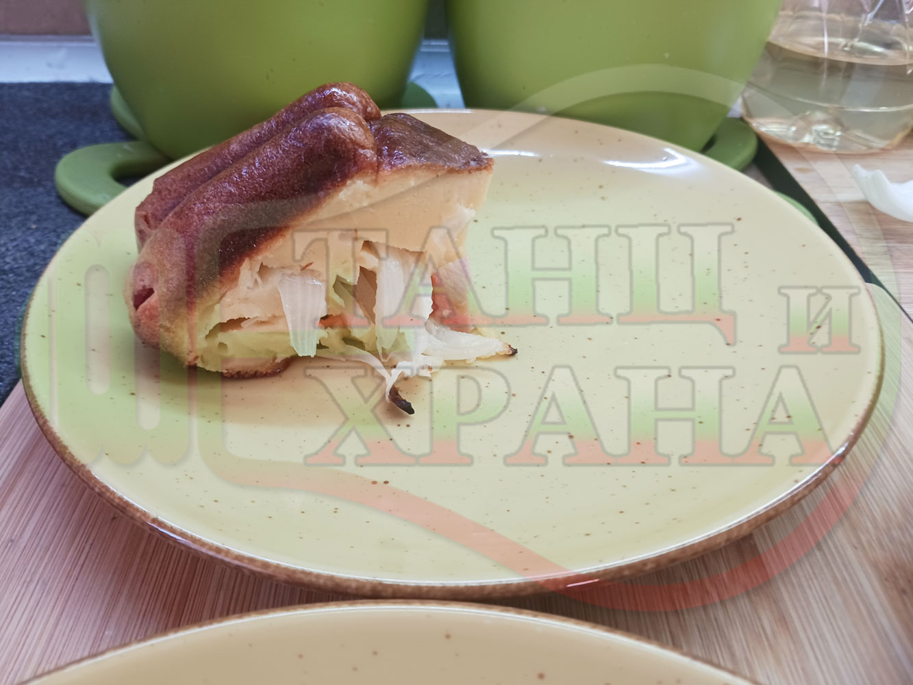 Бухтена солена торта "Филежаренова кромидлучена" запечена на фурна с плънка от жарено филе, кромид лук и краве масло омесена с прясно мляко, брашно и яйца