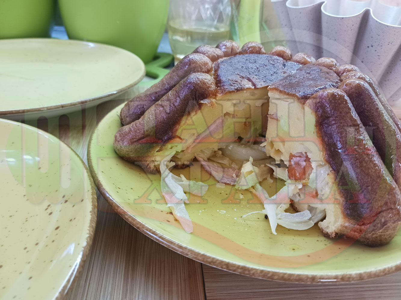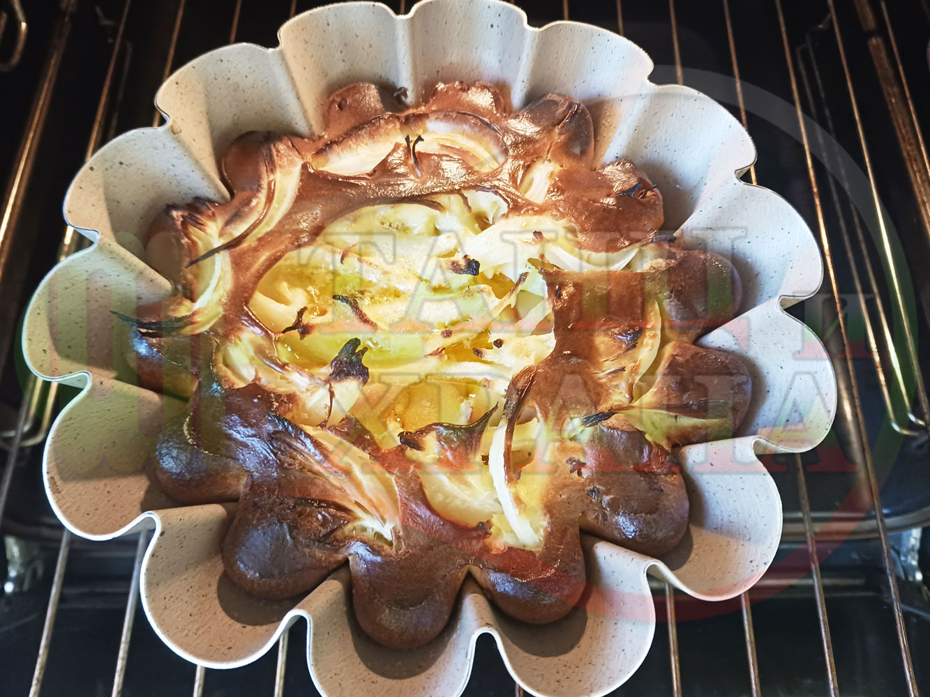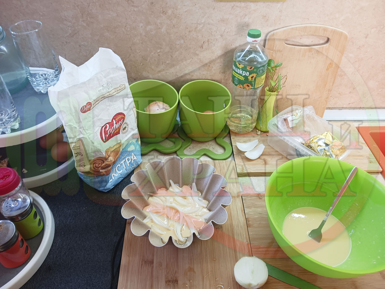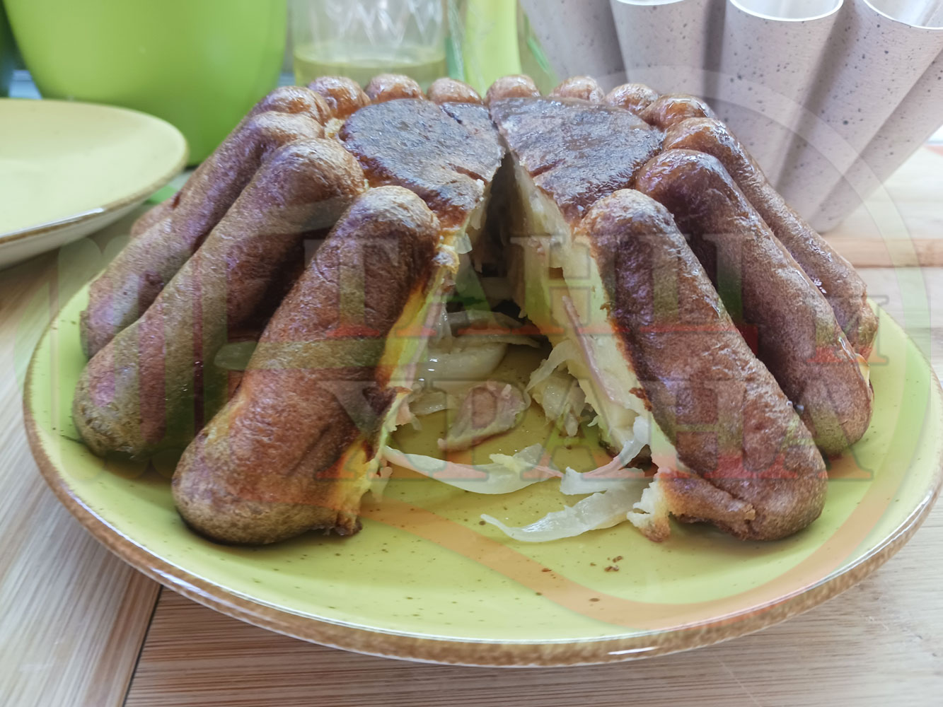 Бухтена солена торта "Филежаренова кромидлучена" запечена на фурна с плънка от жарено филе, кромид лук и краве масло омесена с прясно мляко, брашно и яйца