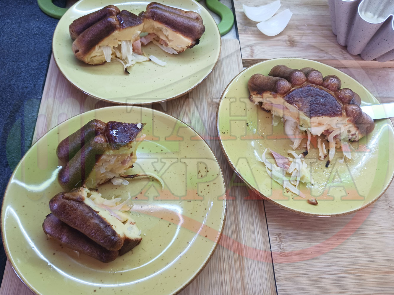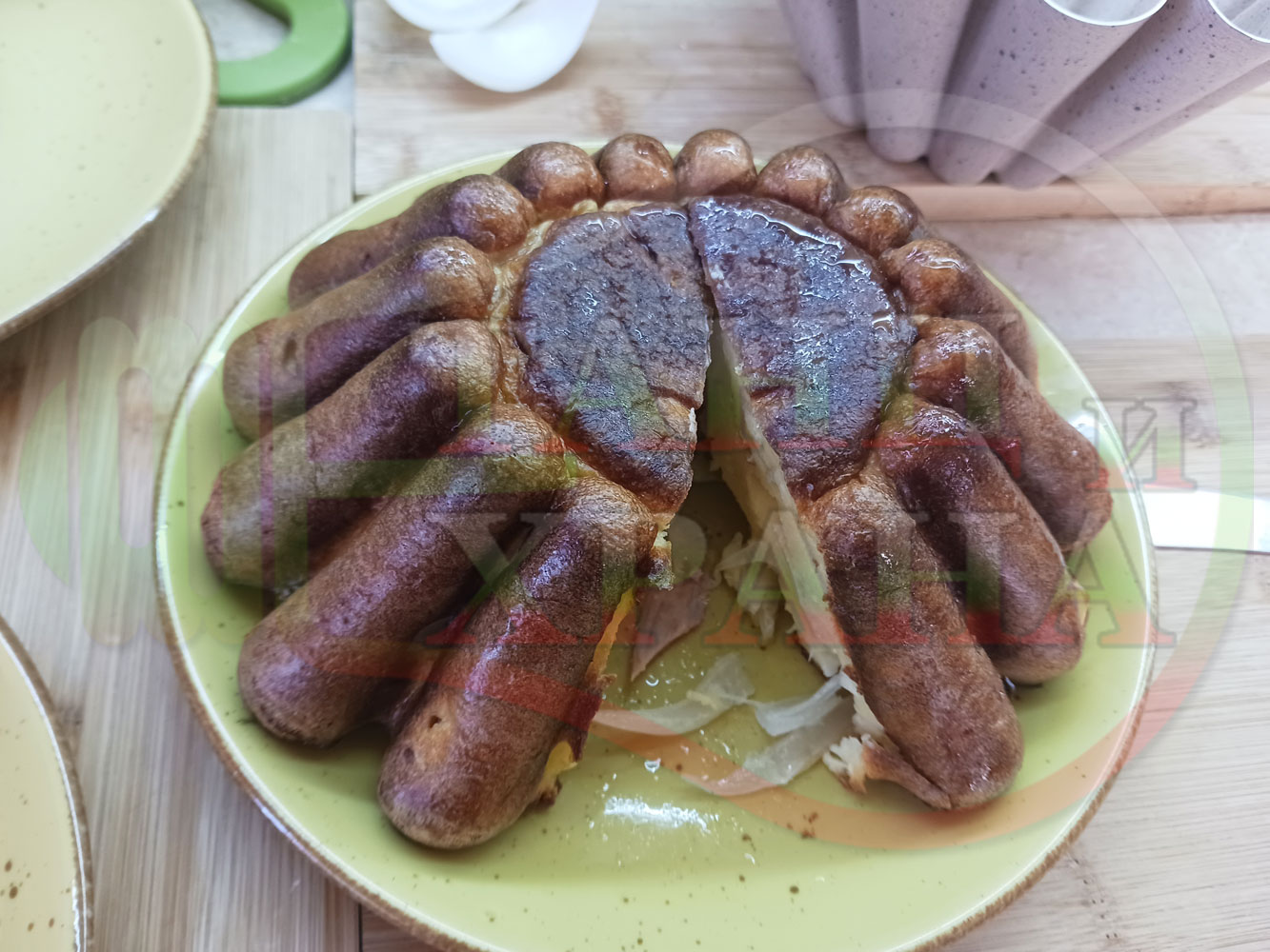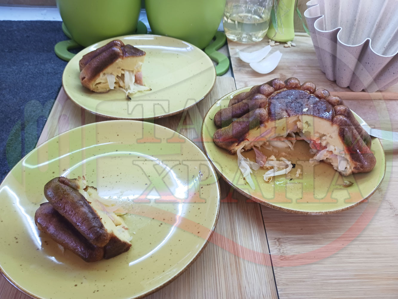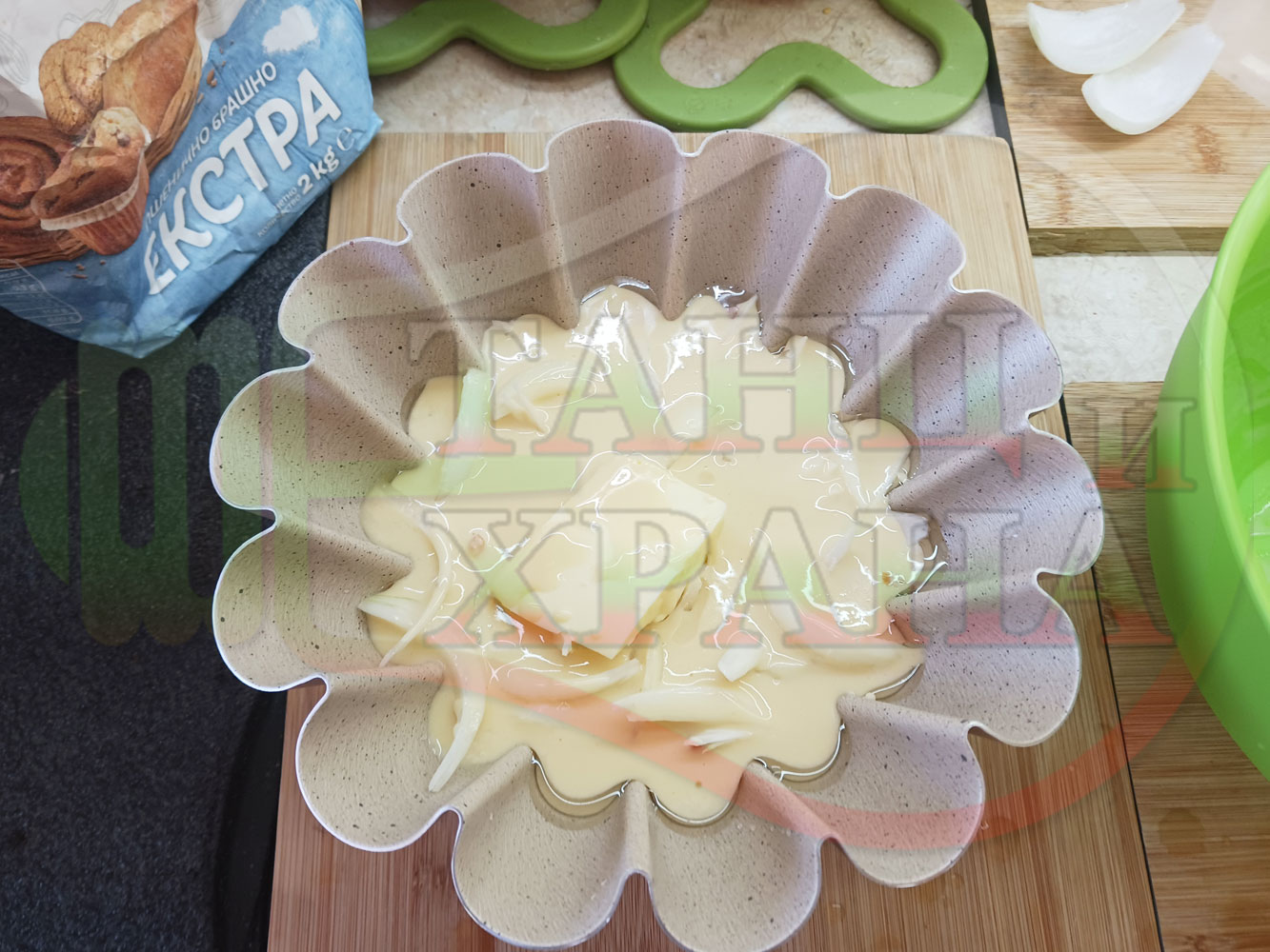 Бухтена солена торта "Филежаренова кромидлучена" запечена на фурна с плънка от жарено филе, кромид лук и краве масло омесена с прясно мляко, брашно и яйца