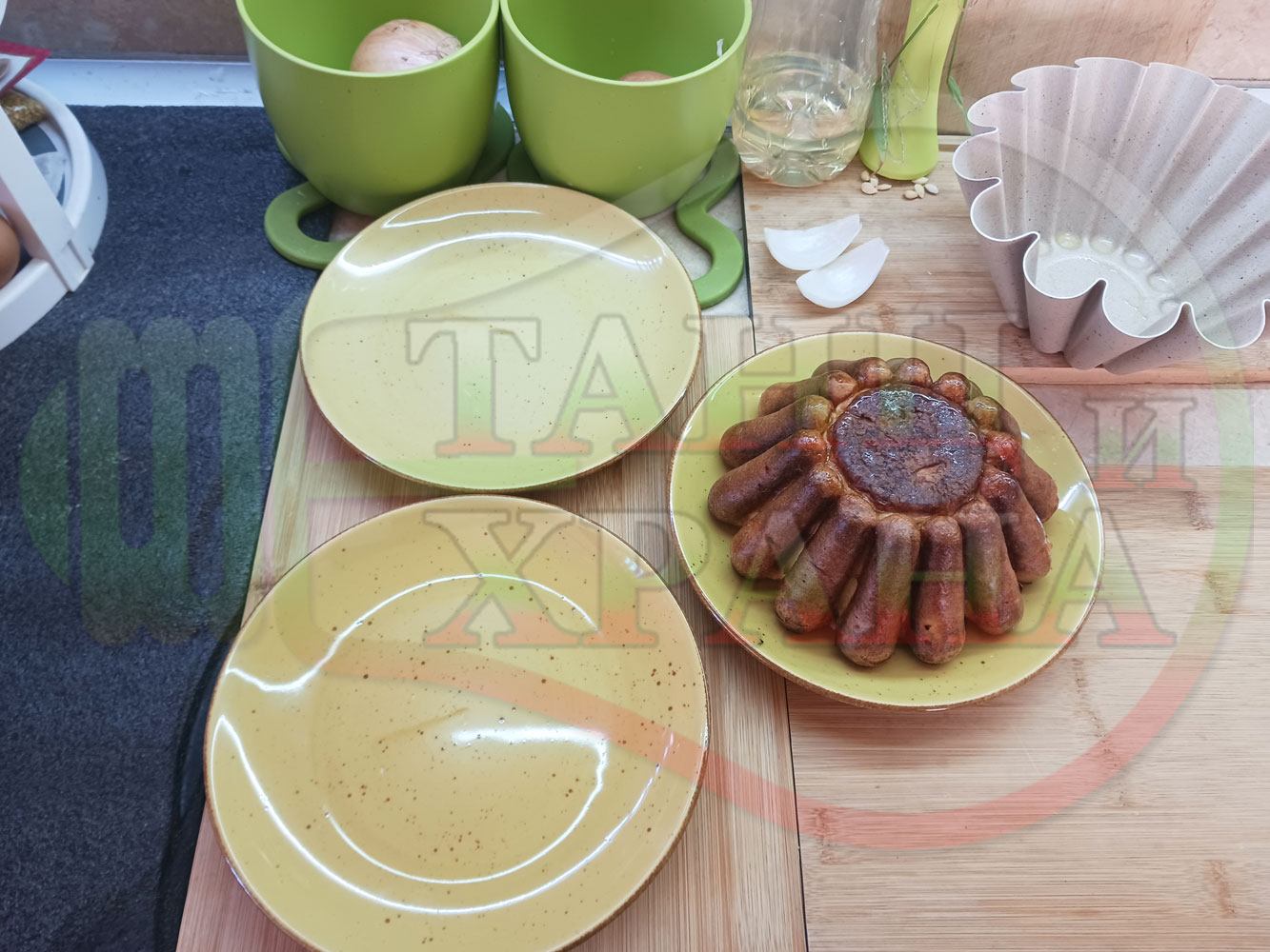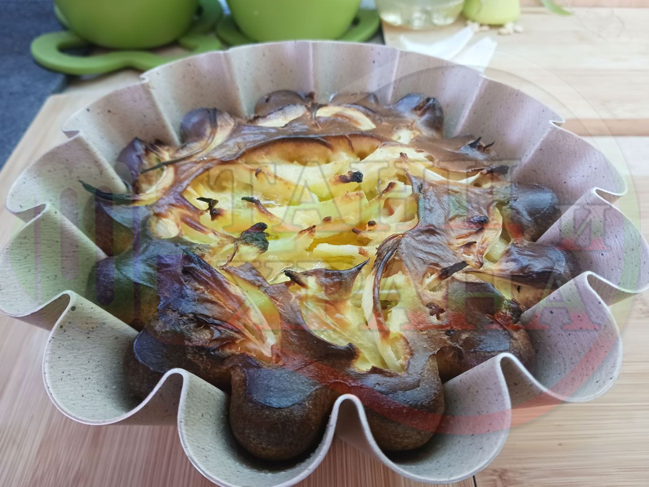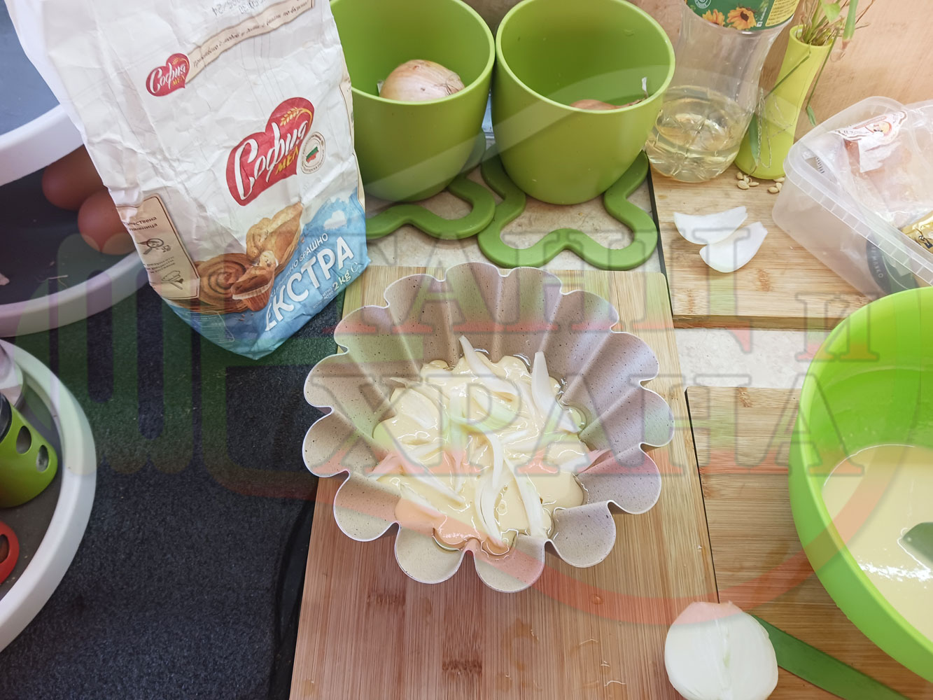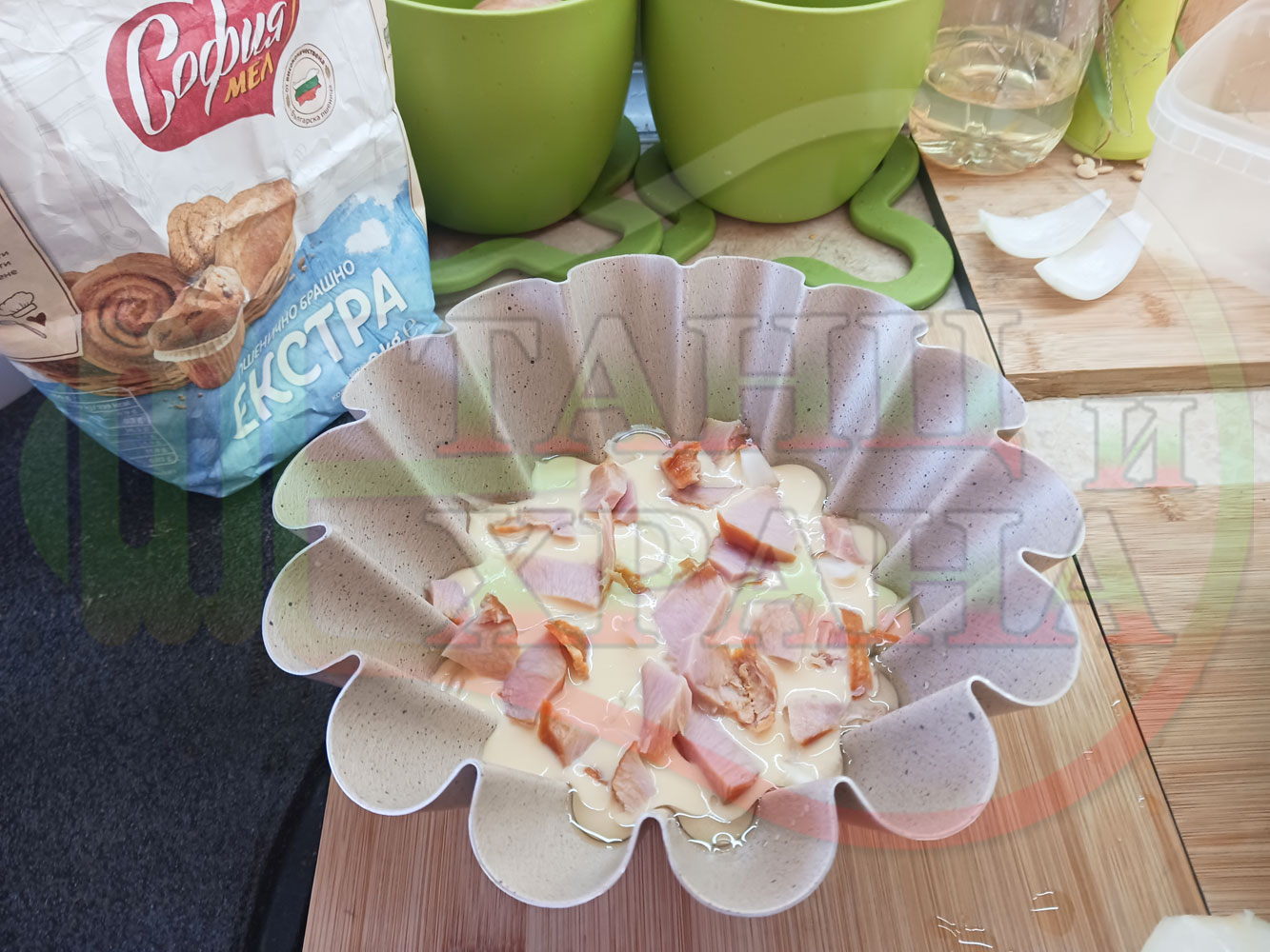 Бухтена солена торта "Филежаренова кромидлучена" запечена на фурна с плънка от жарено филе, кромид лук и краве масло омесена с прясно мляко, брашно и яйца
