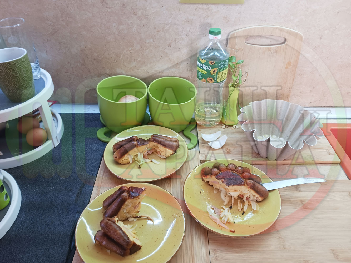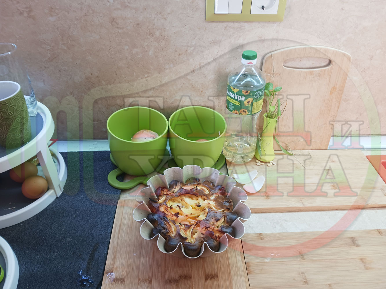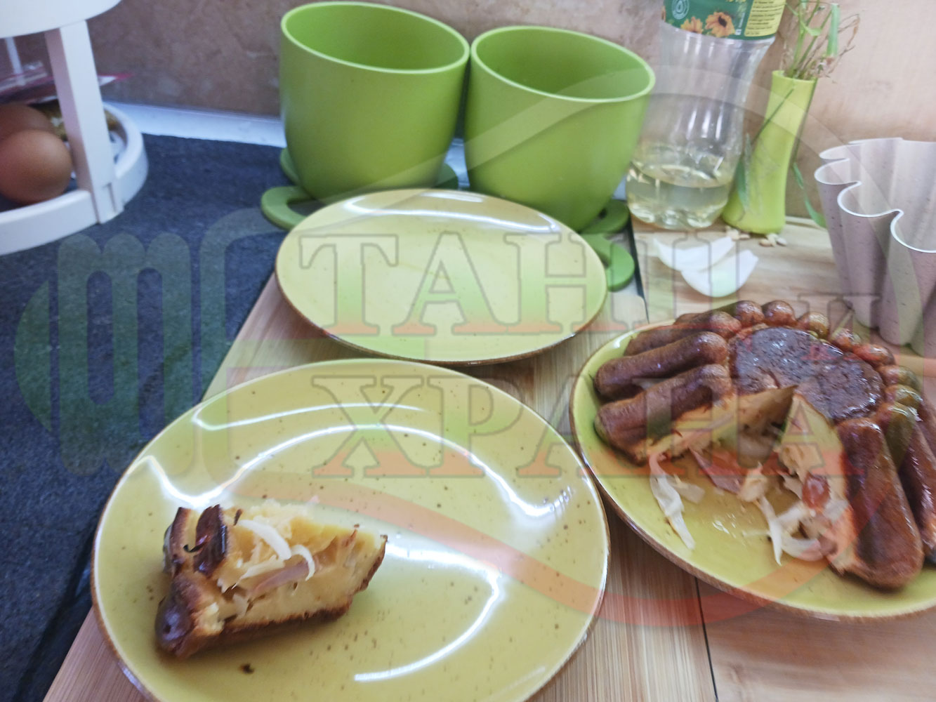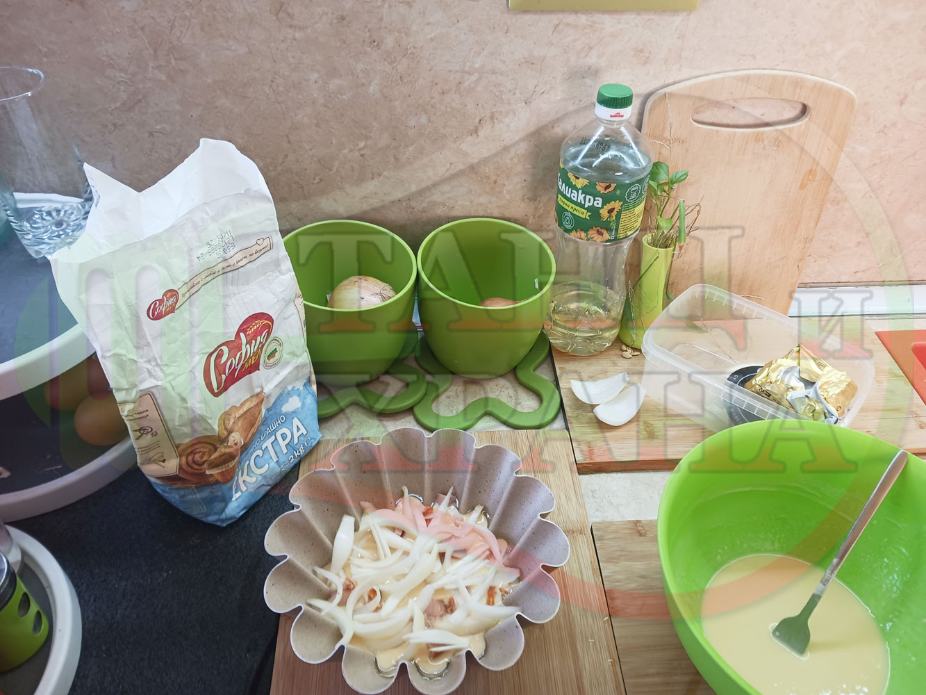 Вкусна бухтена торта омесена с прясно мляко, брашно и яйца, запечена с плънка от жарено филе и кромид лук. Ухание на масло, запечен сладък карамелизиран лук и филе се разнася из кухнята. Получи се голяма вкусно, вкусна, вкусотия (вкуснотия), която си хапнахме за закуска... laughing