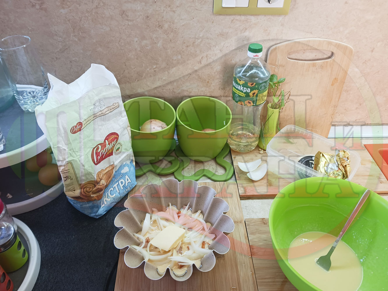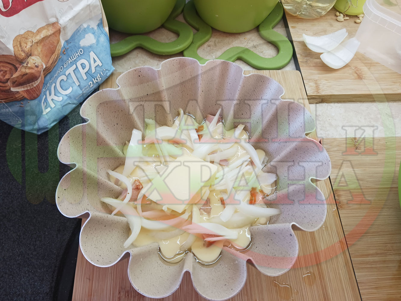 Разпределете бухтеното тесто на две неравни части (голяма и по-малка). Изсипете по-голямата част от бухтеното тесто в намазана със слънчогледово олио форма за печене. Обелете, измийте, нарежете лука на ивички и разпределете по-голямата част от лука върху бухтеното тесто (заделете вътрешната част на лука за украса). Нарежете филето на средни по големина парченца и ги разпределете върху кромид лука. Поставете кравето масло в средата на бухтеното тесто и изсипете втората по-малка част от тестото, така че да покрие почти напълно плънката. Поставете формата за печене в предварително загрятата фурна (загрейте я за поне 5 минути). Запечете на фурна без вентилатор на 180 градуса за около 35 минути.