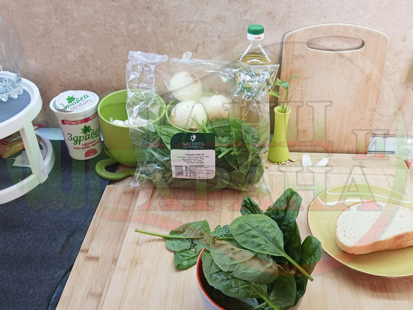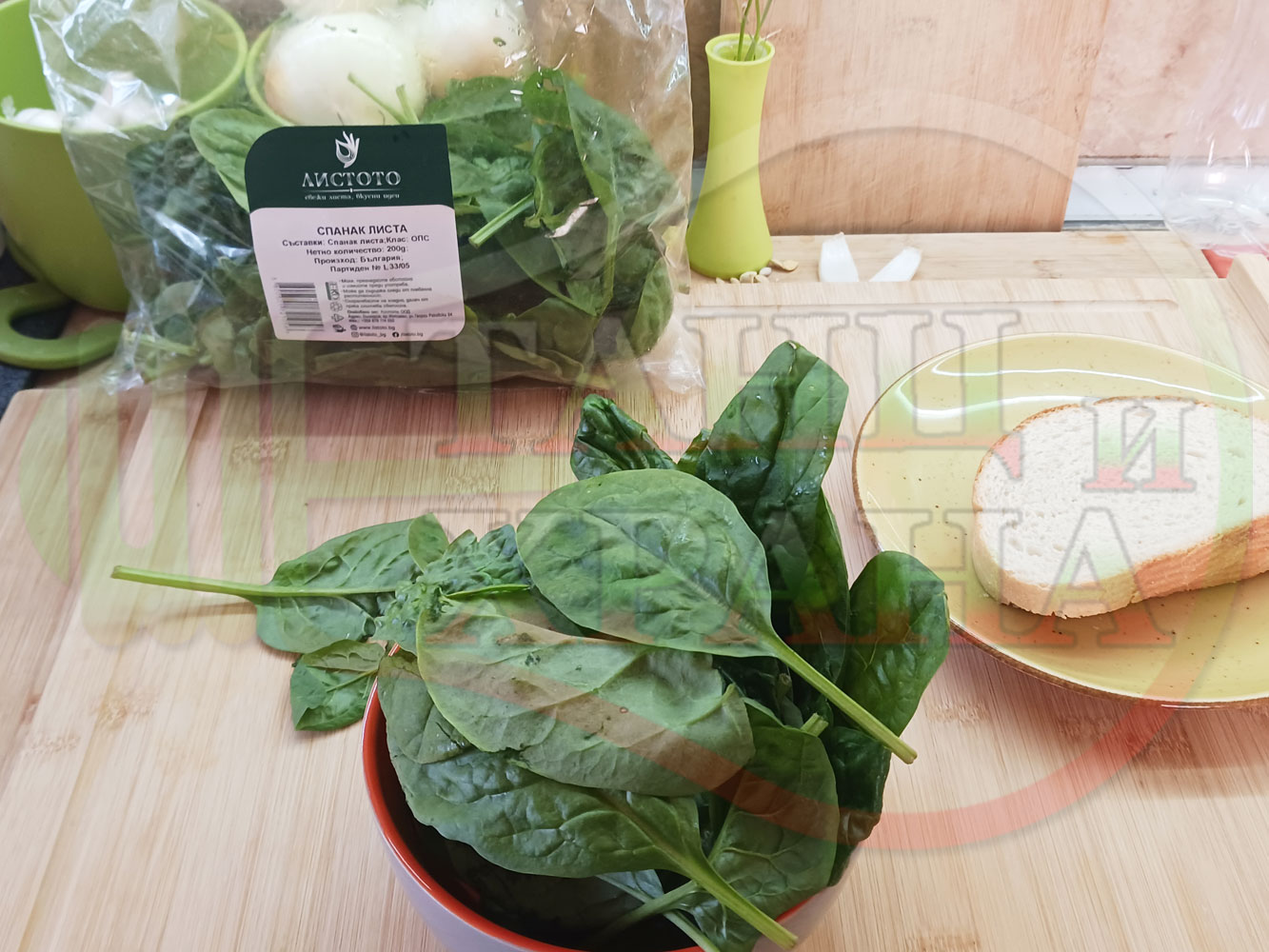 Измийте спанака, нарежете го на едро в купа и добавете обеления и нарязан на едро чесън и кравето бяло сирене (заделете част от листата на спанака за украса). Разбъркайте и намачкайте с вилица до образуване на гъст сиреново спаначен, хомогенен крем с чесън (сиренов крем).