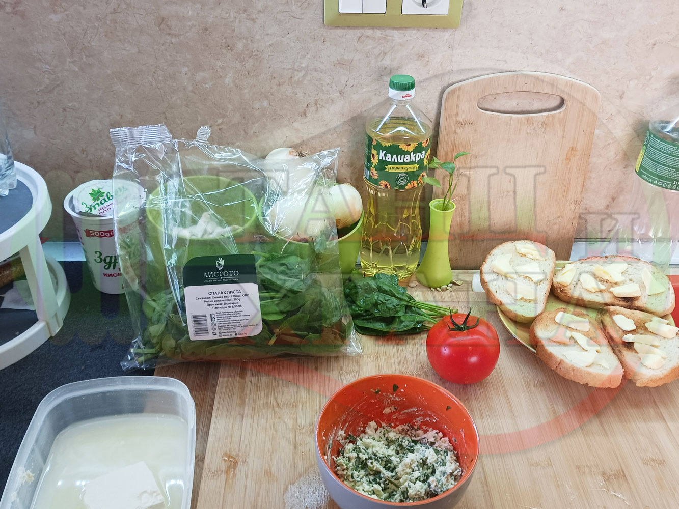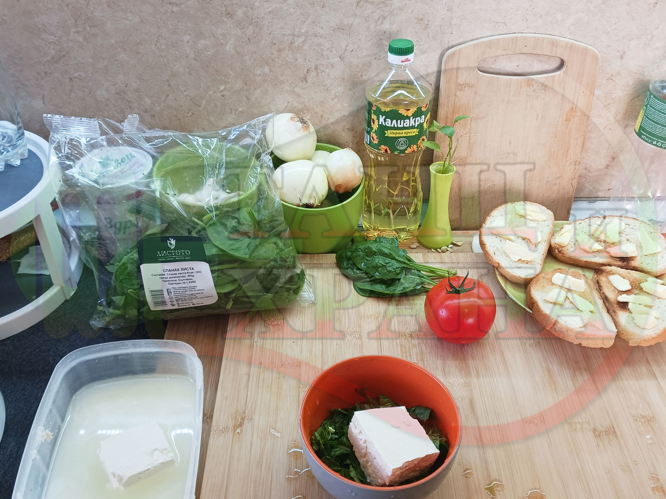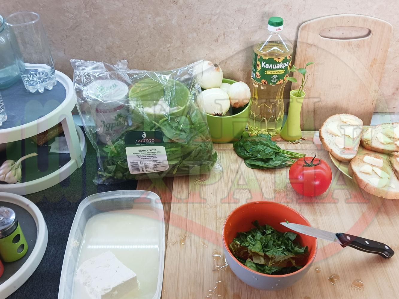 ПРОДУКТИ: Приблизителни количества за българска доматена студена супа "Доматеноспаначена с БГсирене" приготвена от свеж спанак, чесън и краве бяло сирене (българско, саламурено) оформена като кладенчета напълнени с пресни домати - двукомпонентна