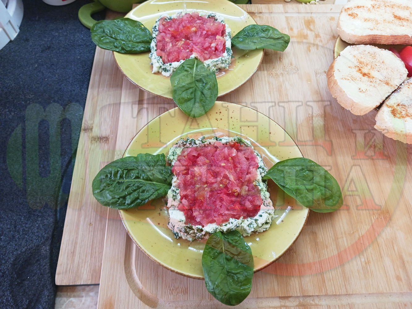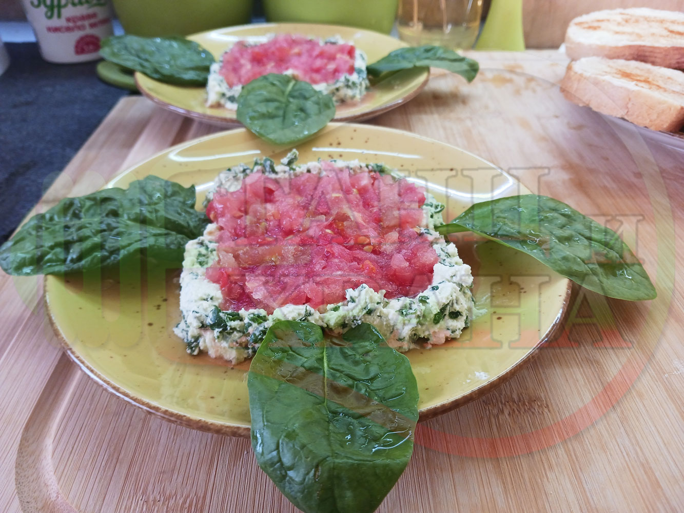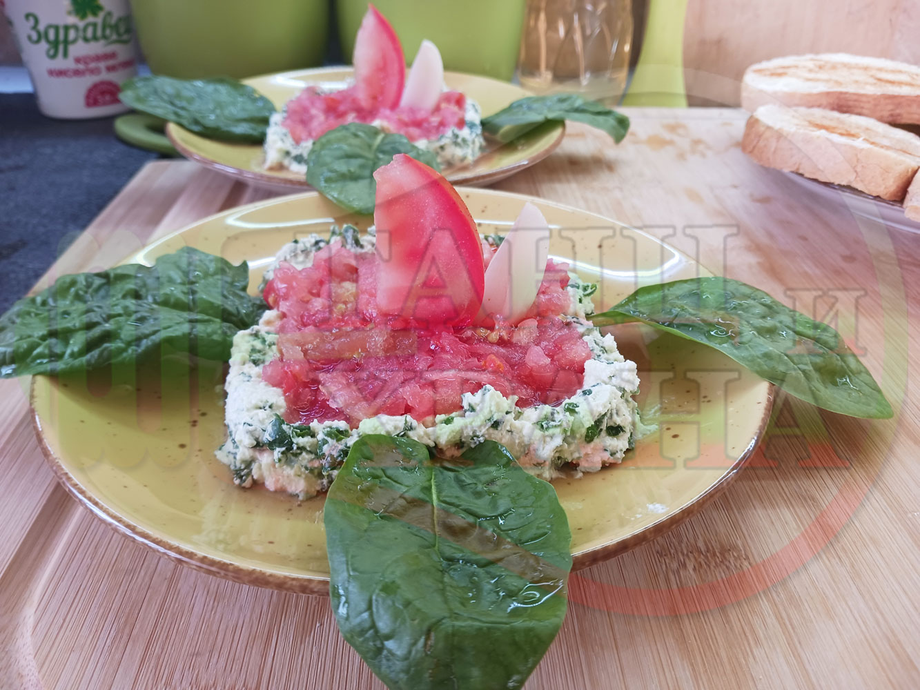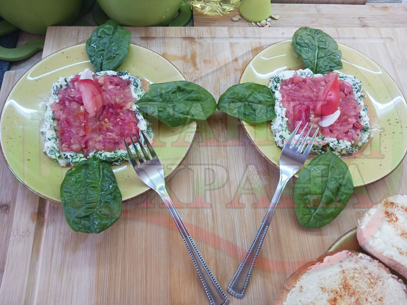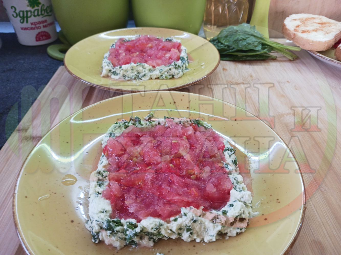 Разпределете равномерно сиреновия спаначен крем в чиниите и с ръце оформете широки "кладенчета" със средно високи стени и плътно дъно, така че да задържат доматения сок и каша. Настържете домата на едро, разпределете го равномерно в кладенчетата и загладете доматена смес. Украсете порциите с по 3 спаначени листа и с резенчета домати (Украсете по ваше желание и усмотрение).