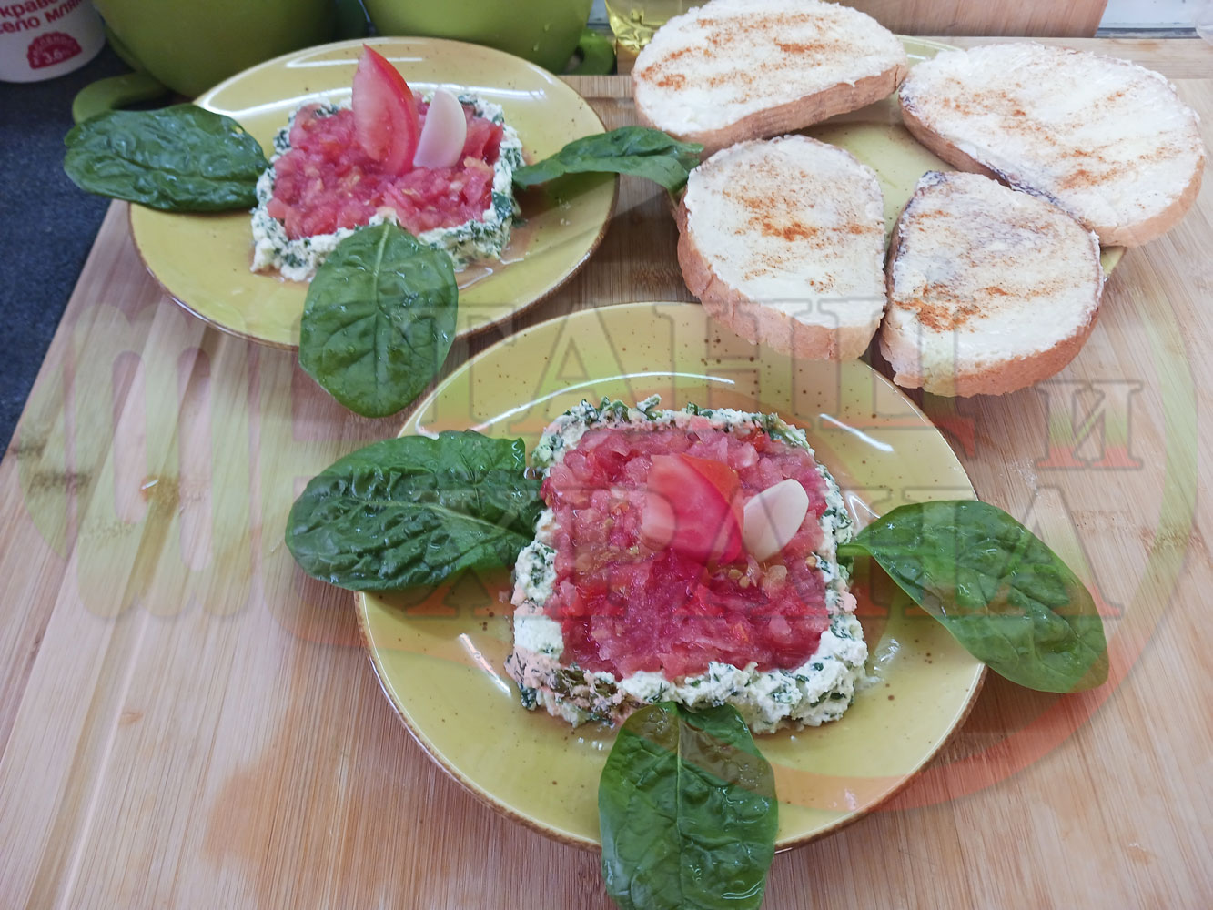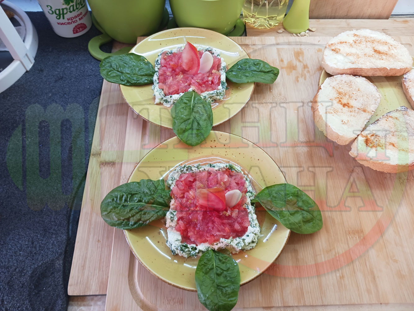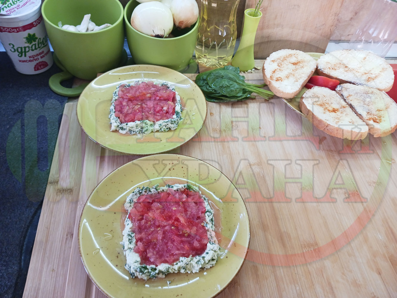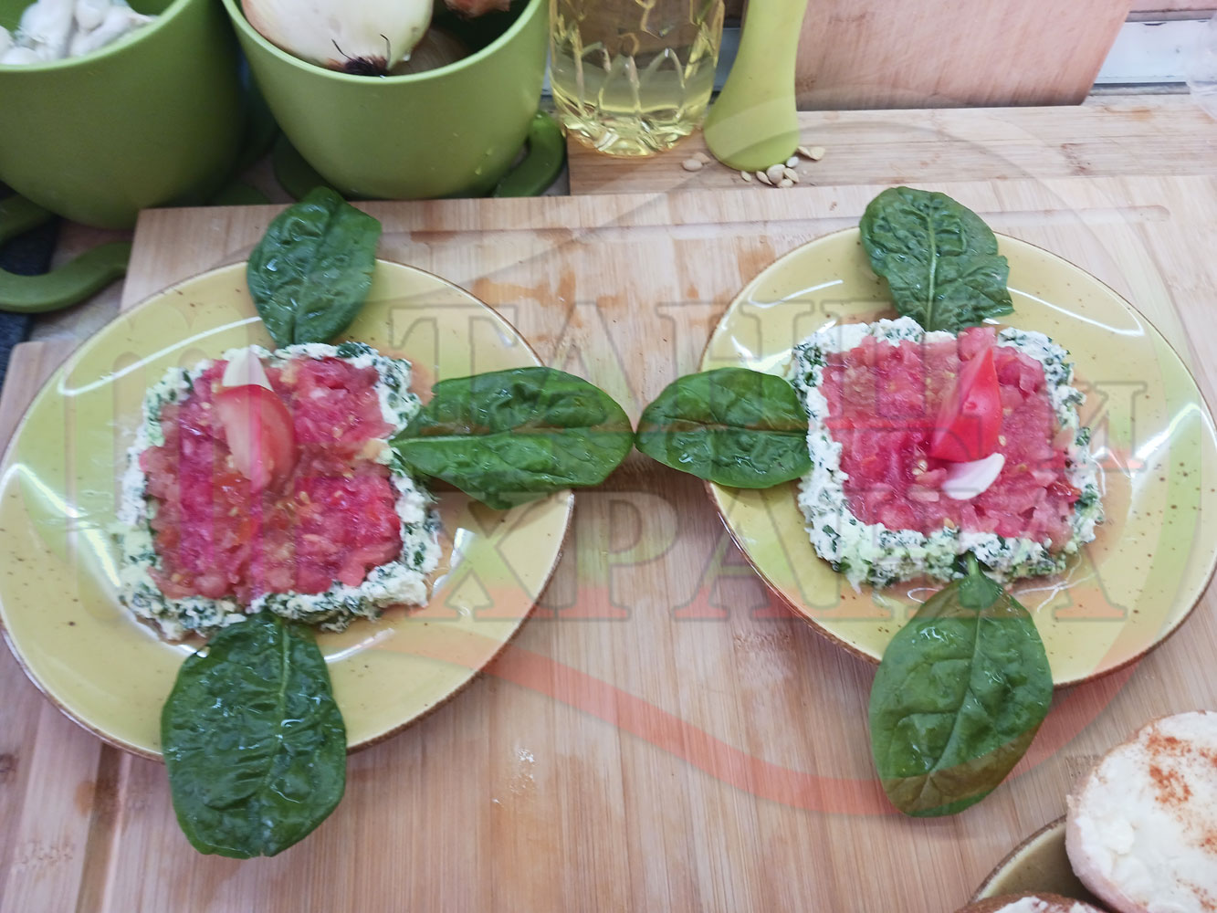 Разпределете равномерно сиреновия спаначен крем в чиниите и с ръце оформете широки "кладенчета" със средно високи стени и плътно дъно, така че да задържат доматения сок и каша. Настържете домата на едро, разпределете го равномерно в кладенчетата и загладете доматена смес. Украсете порциите с по 3 спаначени листа и с резенчета домати (Украсете по ваше желание и усмотрение).