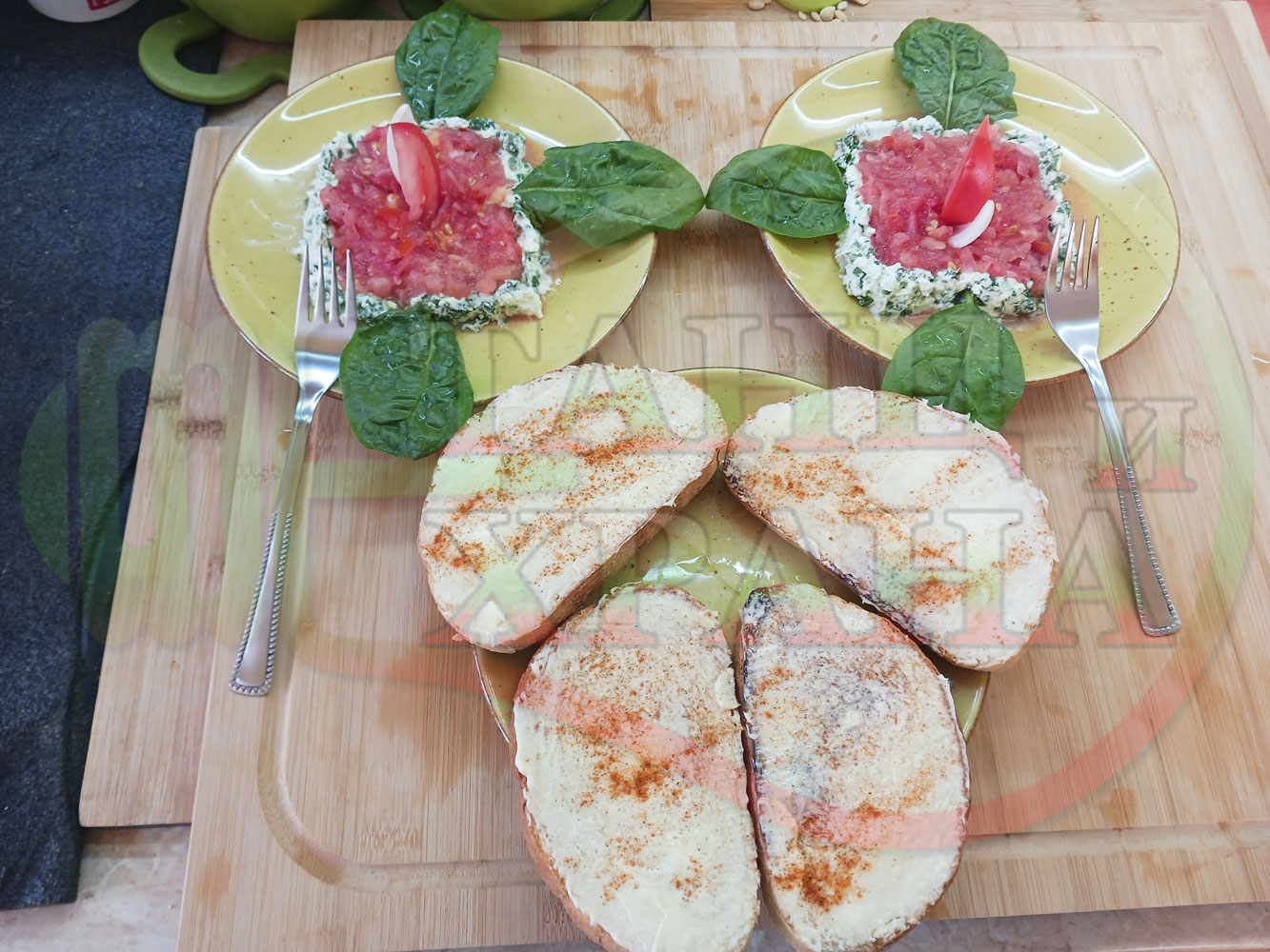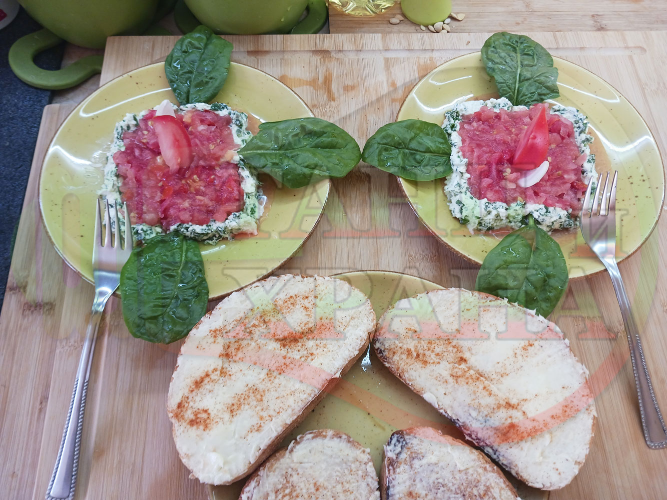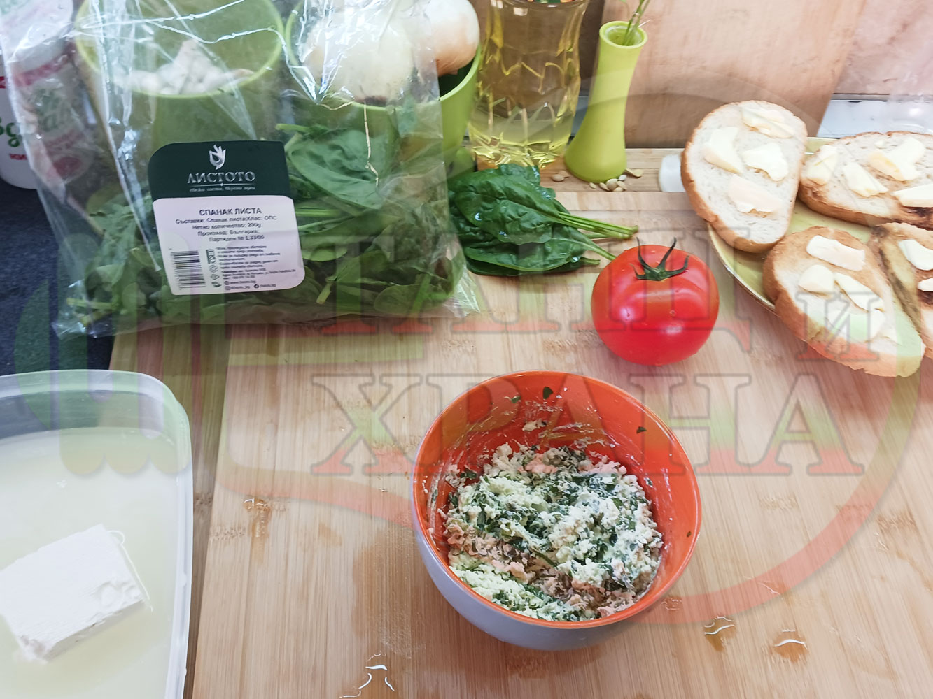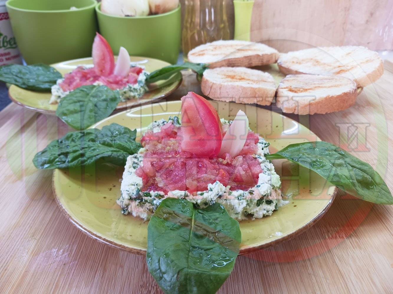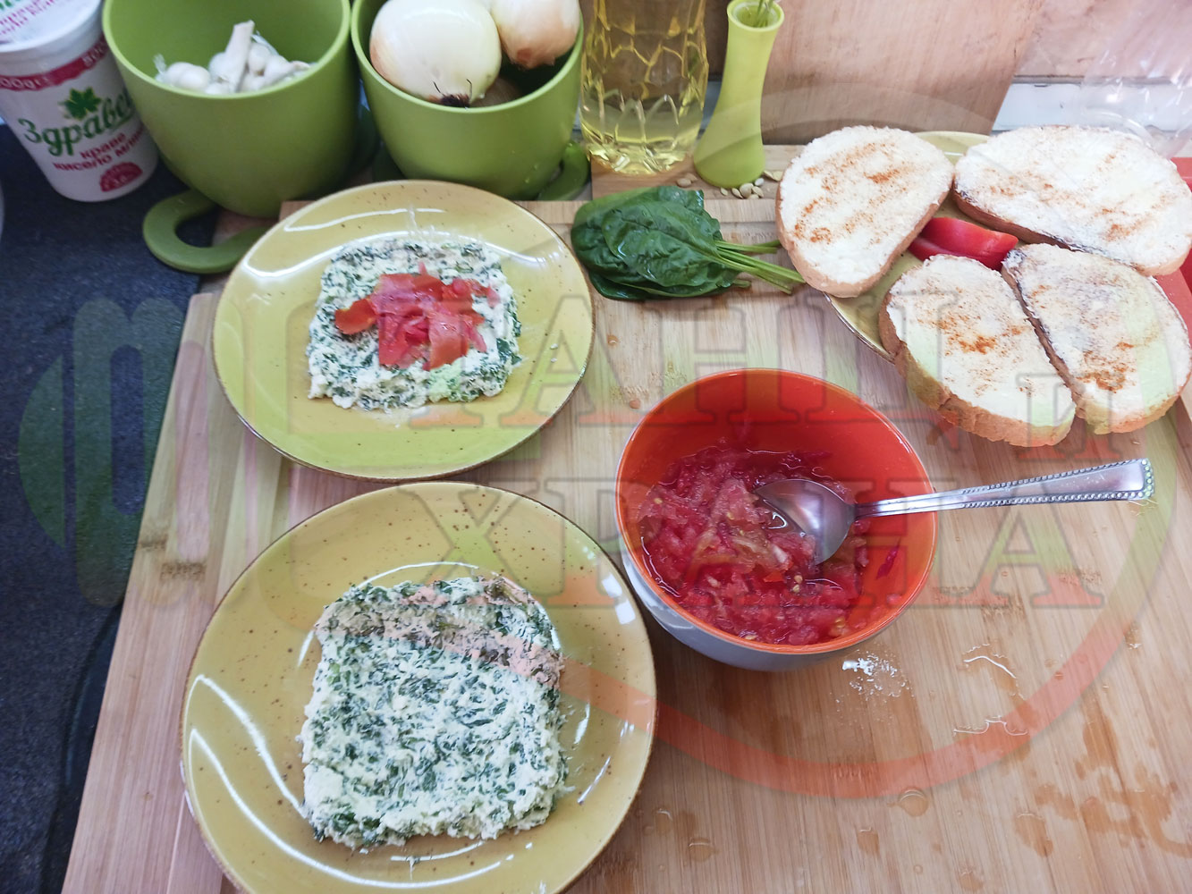 Разпределете равномерно сиреновия спаначен крем в чиниите и с ръце оформете широки "кладенчета" със средно високи стени и плътно дъно, така че да задържат доматения сок и каша. Настържете домата на едро, разпределете го равномерно в кладенчетата и загладете доматена смес. Украсете порциите с по 3 спаначени листа и с резенчета домати (Украсете по ваше желание и усмотрение).