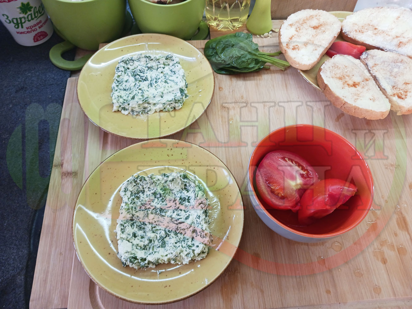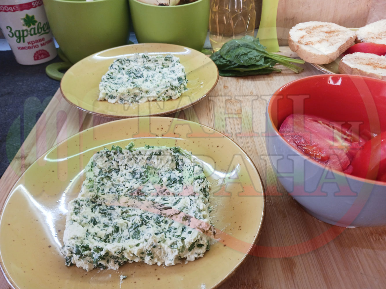Добавете червен лют и/или сладък пипер при приготвянето на сиреново спаначения крем и/или поръсете готовите порции на вкус. Поднесете порциите с препечени на тостер филийки, намазани с краве масло и поръсени с червен сладък пипер и/или шарена сол.
