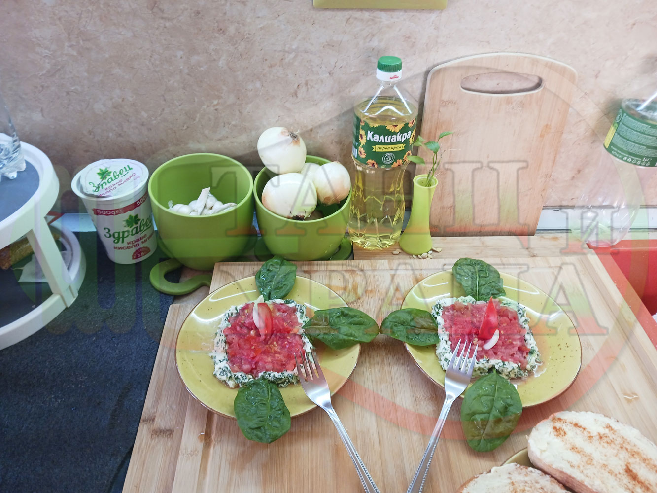 Българска доматена студена супа "Доматеноспаначена с БГсирене" приготвена от свеж спанак, чесън и краве бяло сирене (българско, саламурено) оформена като кладенчета напълнени с пресни домати - двукомпонентна