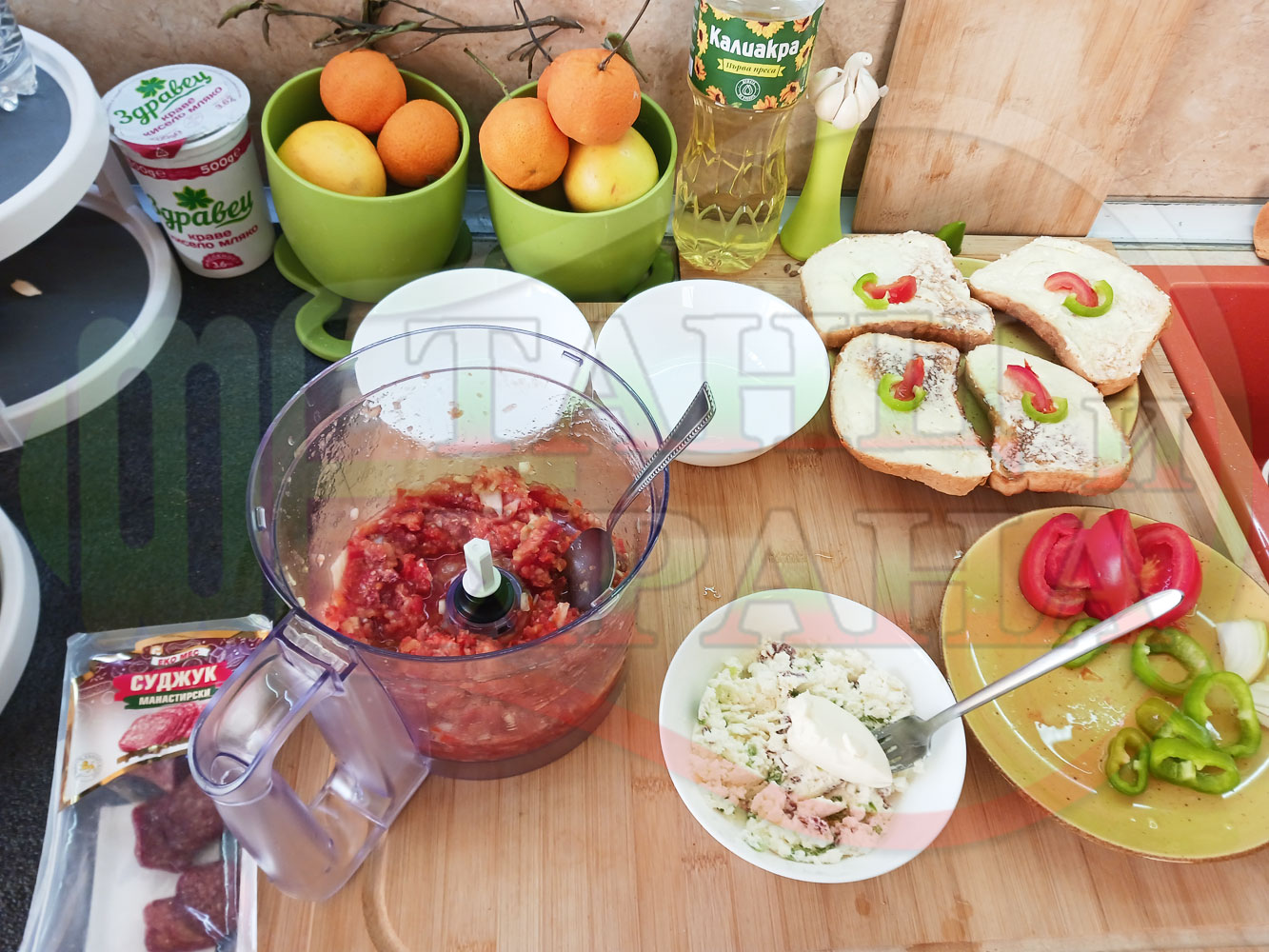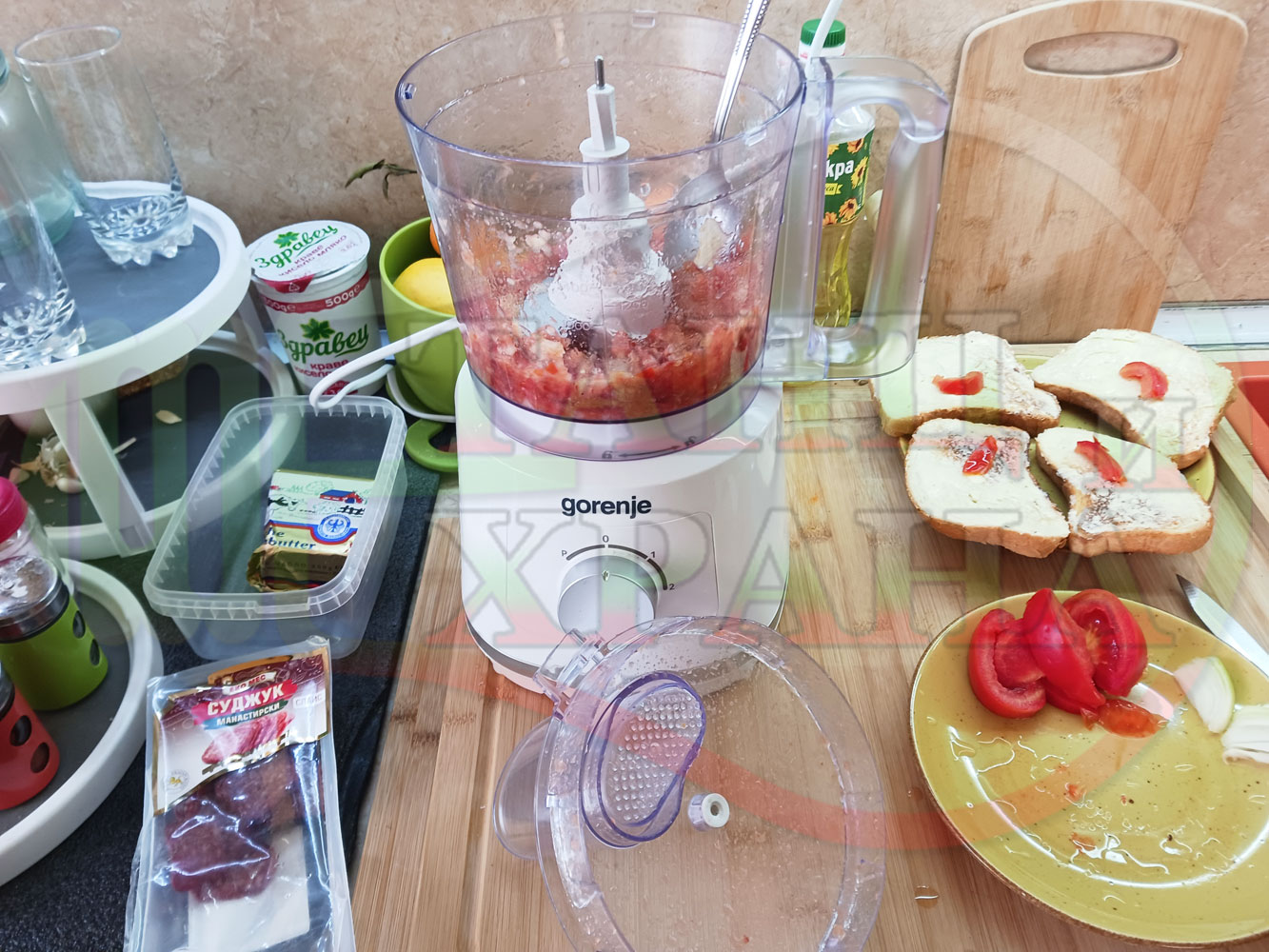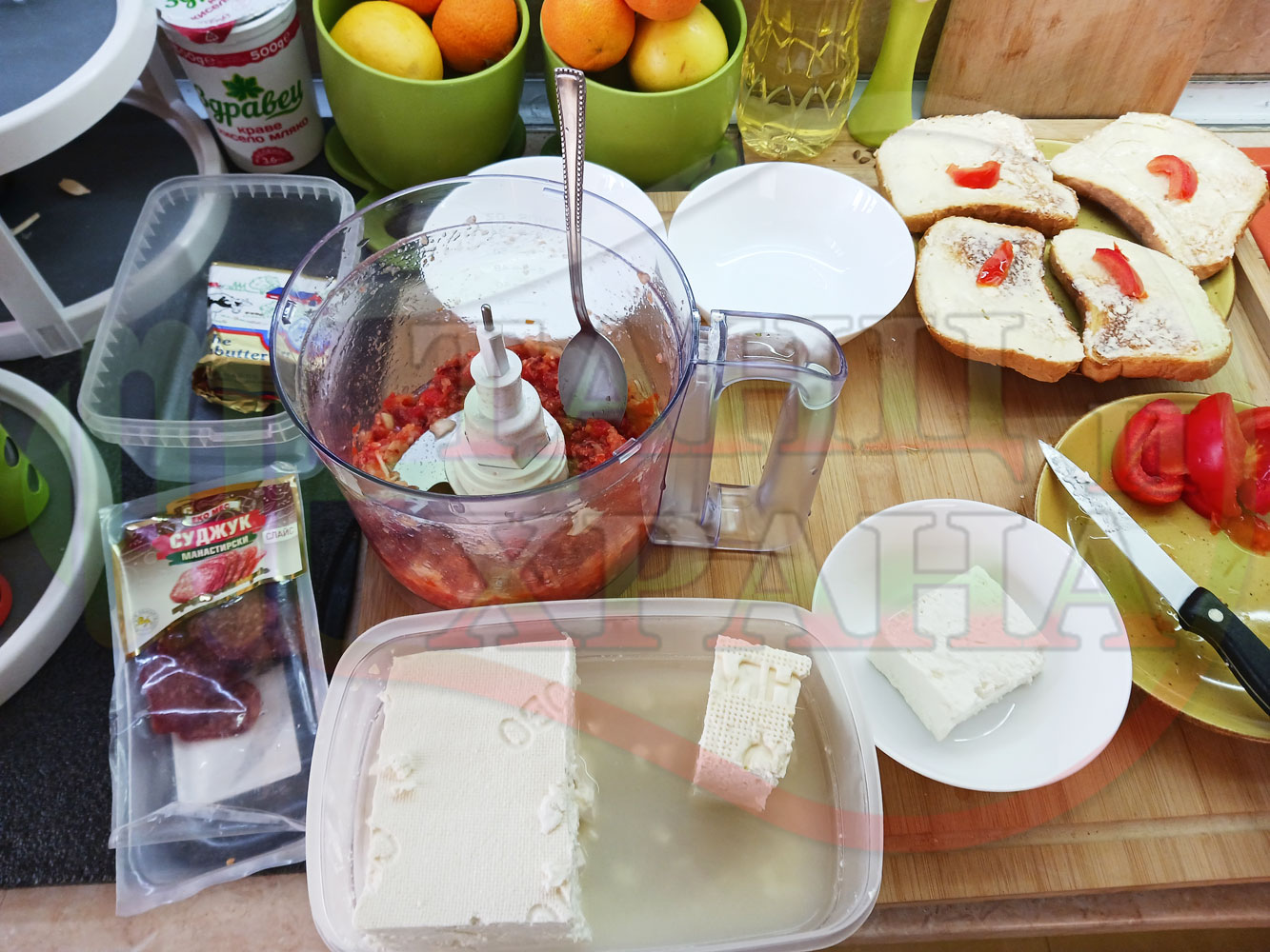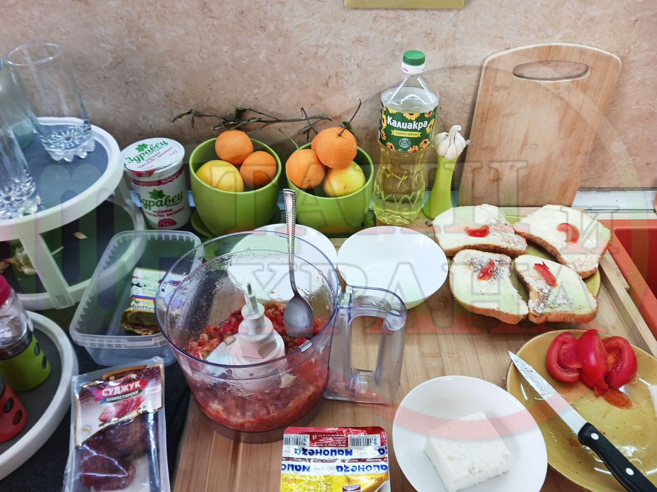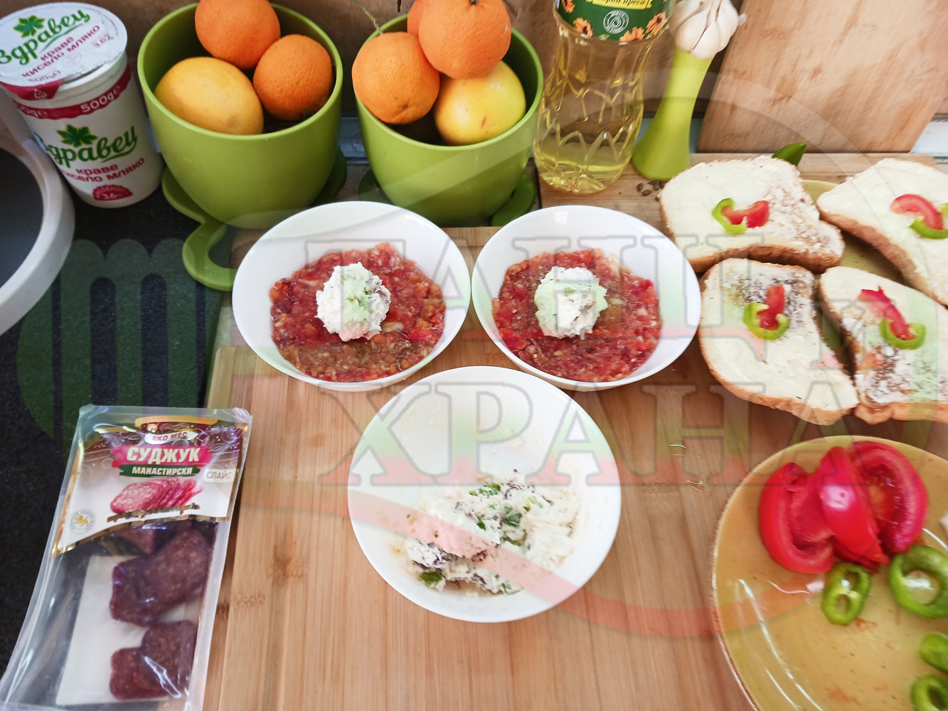 ПРОДУКТИ: Приблизителни количества за българска доматена студена сурова супа "Доматенолучена суджуковозеленочушкова майонезена с БГсирене" приготвена с пресни домати и кромид лук гарнирана с топчета от сиренов крем от зелени чушки, суджук, майонеза и краве бяло сирене - двукомпонентна