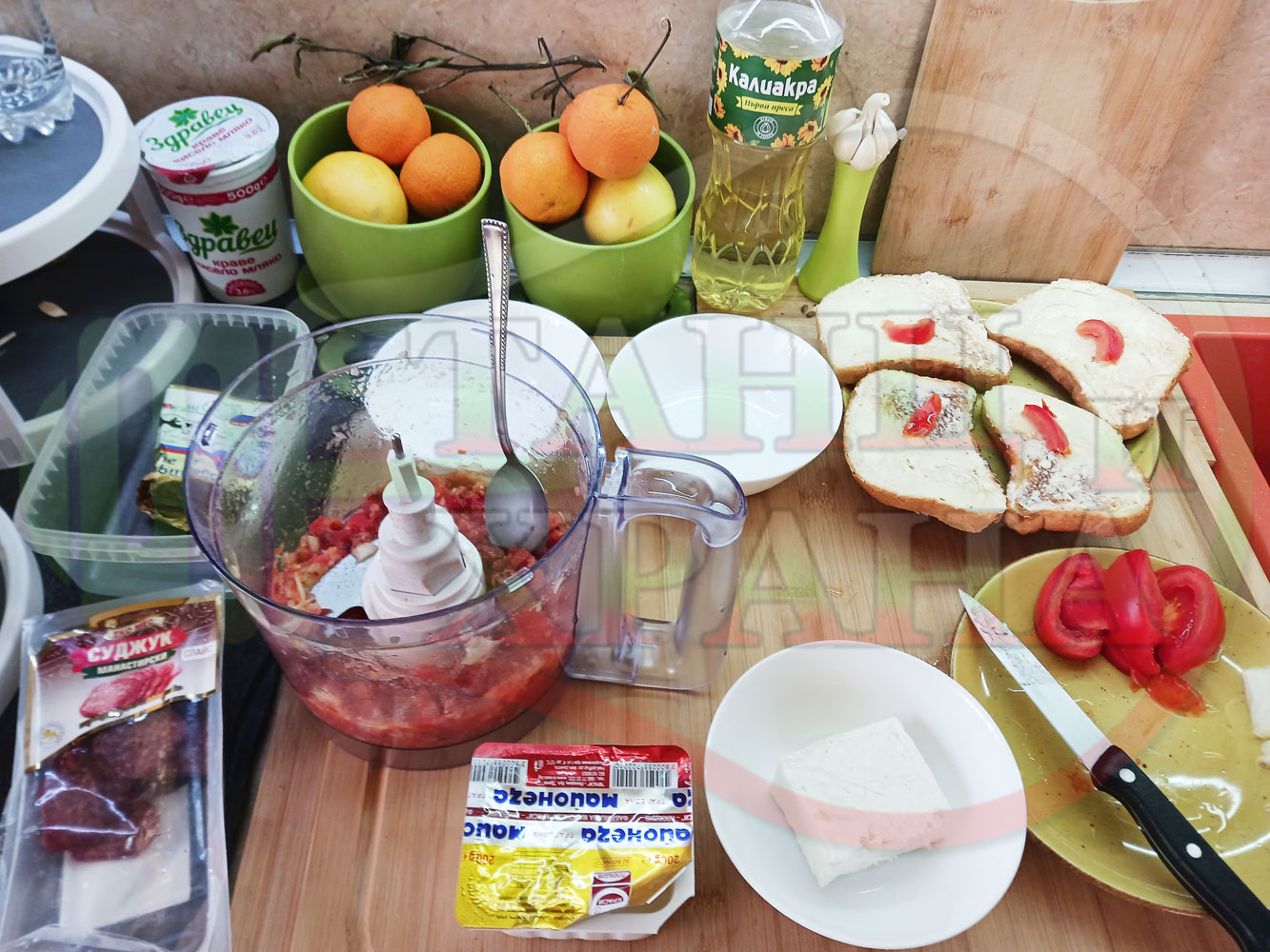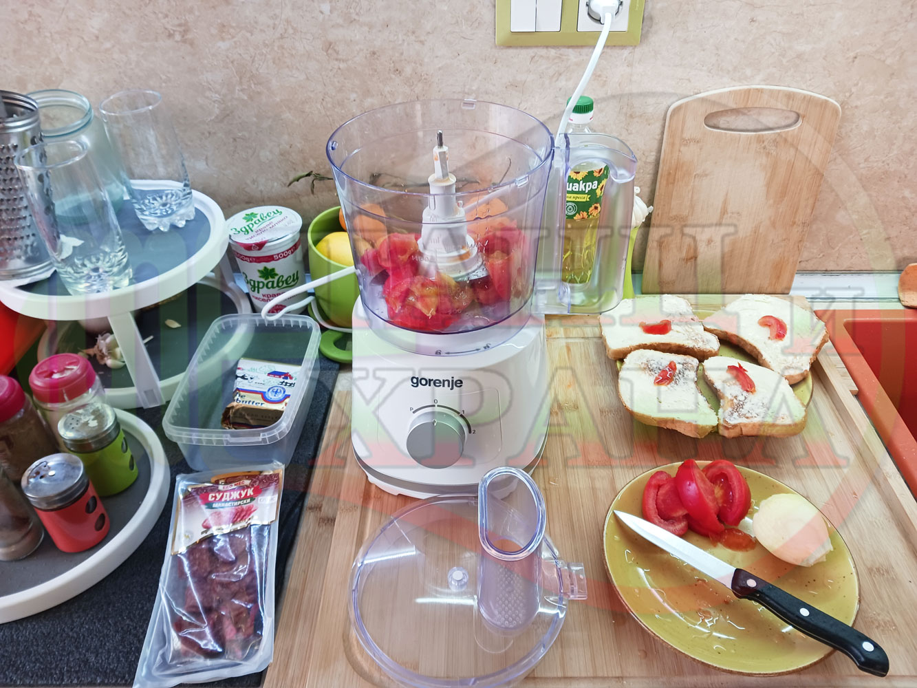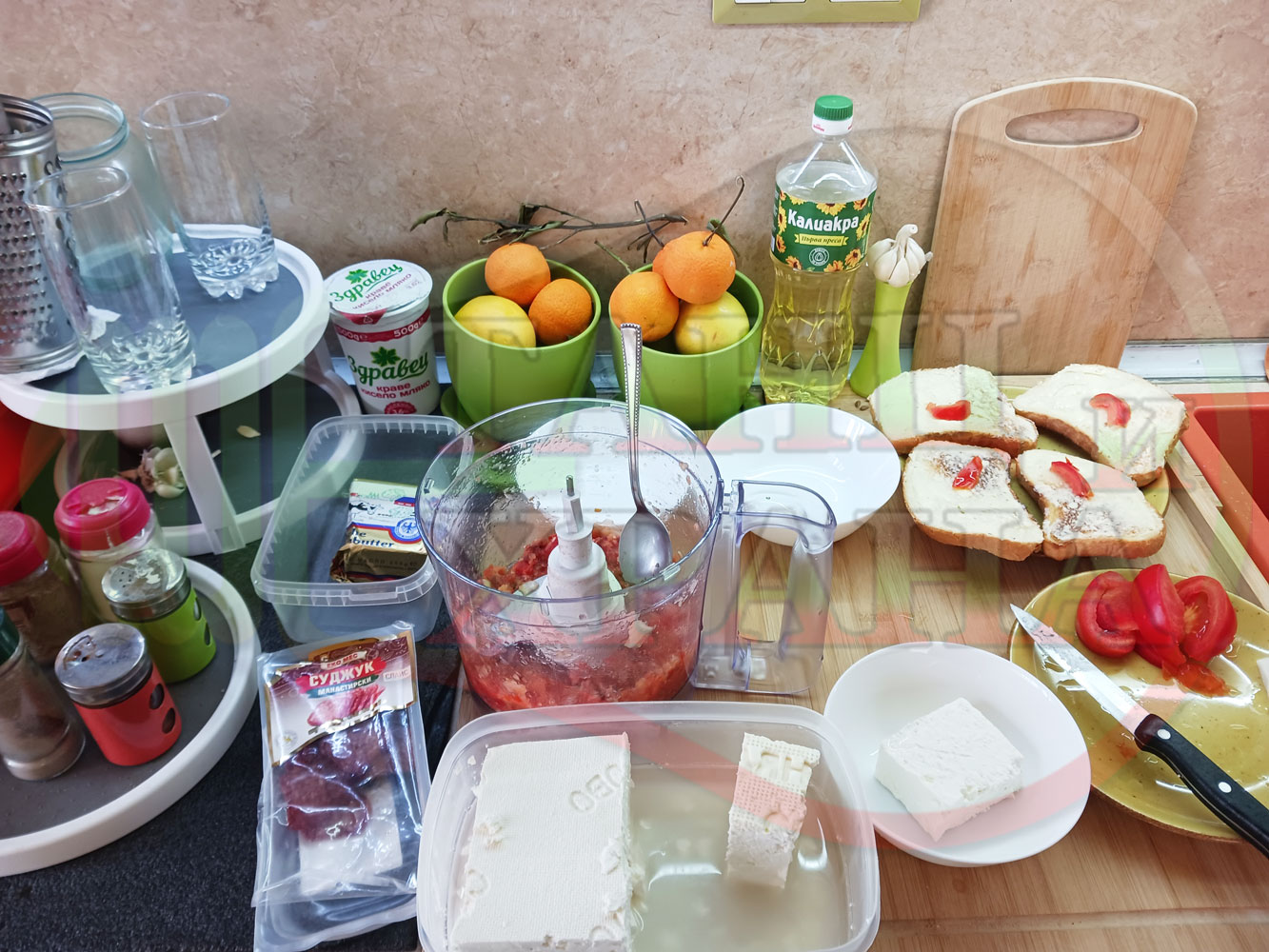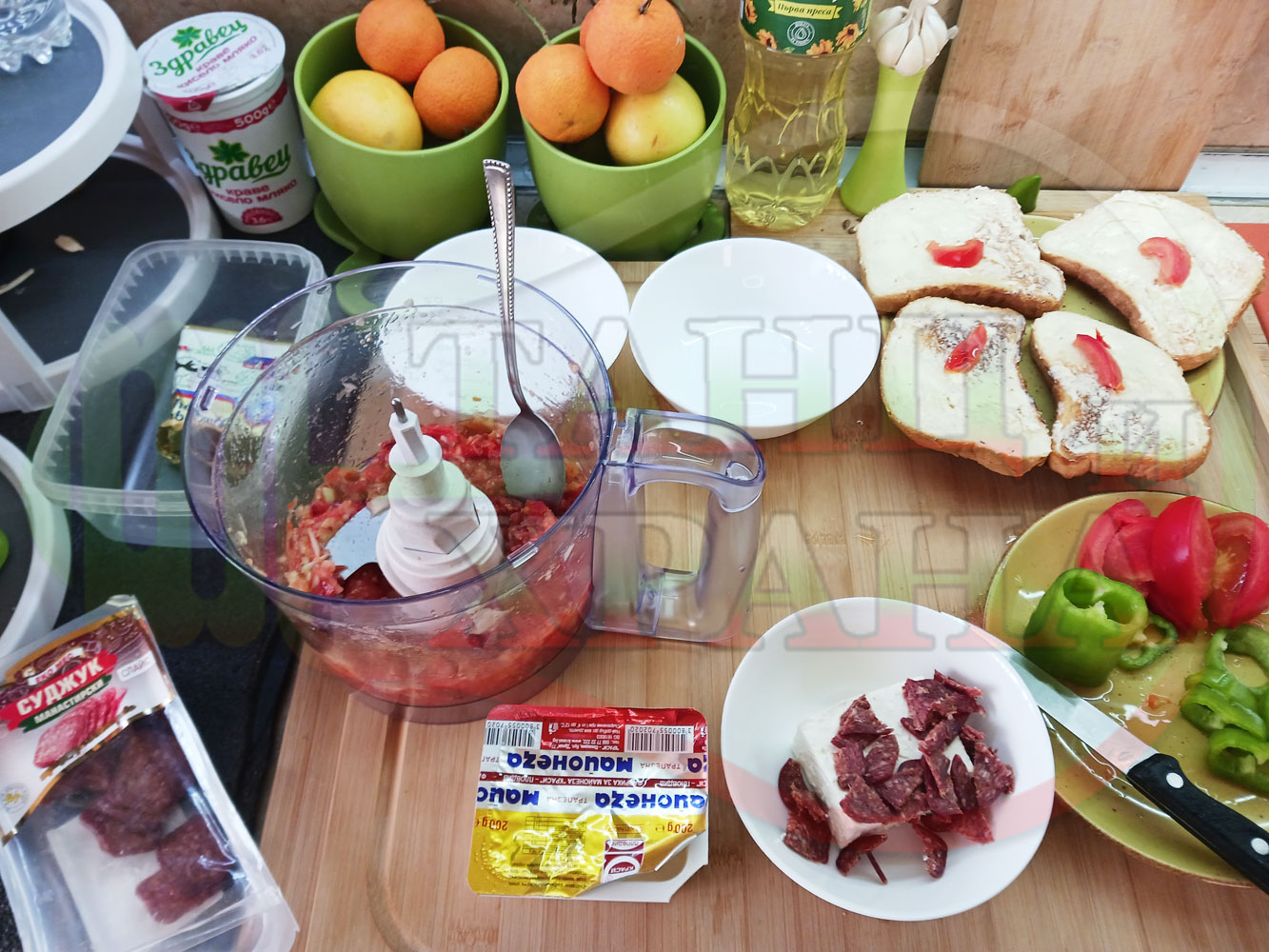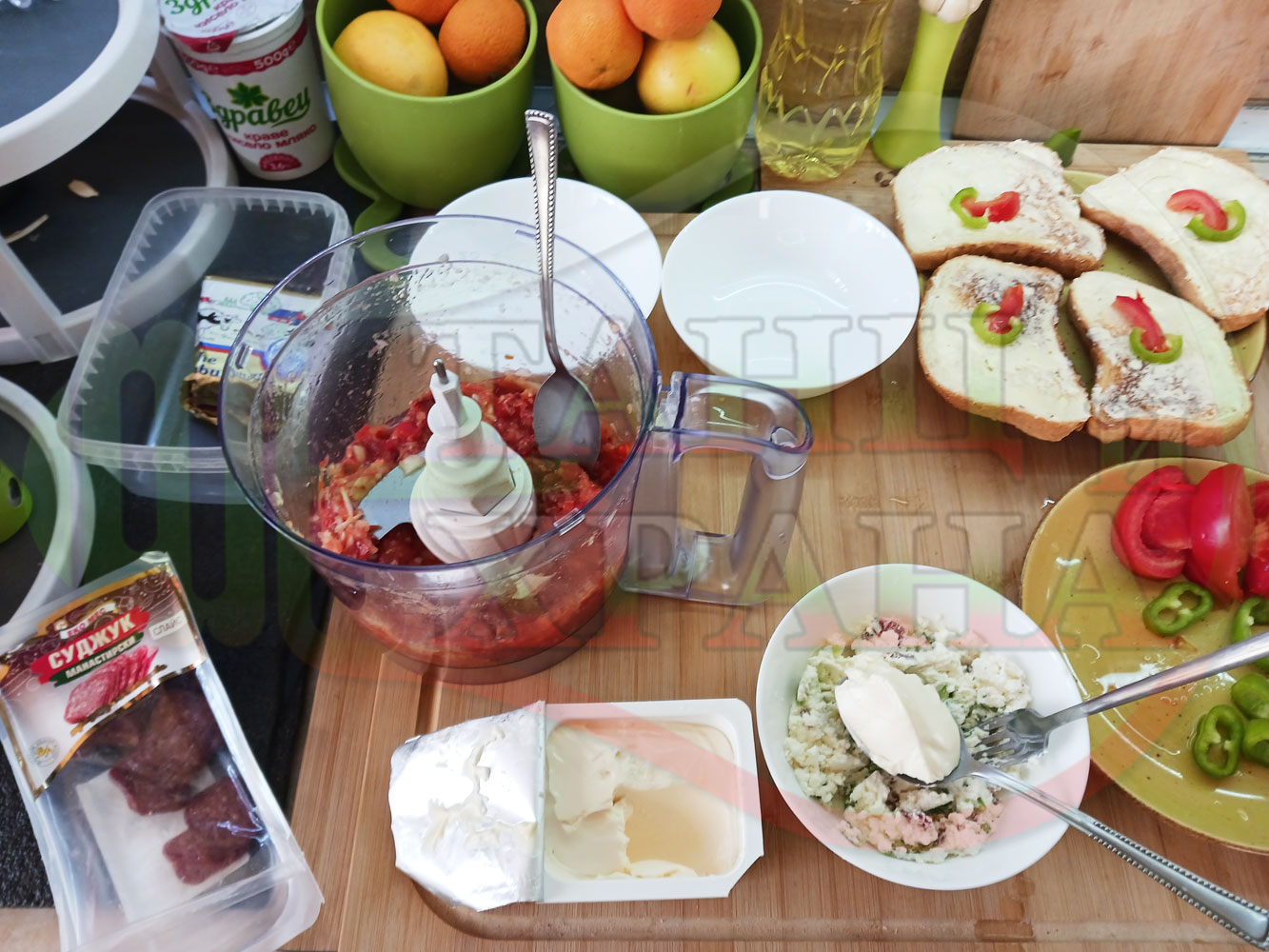 ПРОДУКТИ: Приблизителни количества за българска доматена студена сурова супа "Доматенолучена суджуковозеленочушкова майонезена с БГсирене" приготвена с пресни домати и кромид лук гарнирана с топчета от сиренов крем от зелени чушки, суджук, майонеза и краве бяло сирене - двукомпонентна