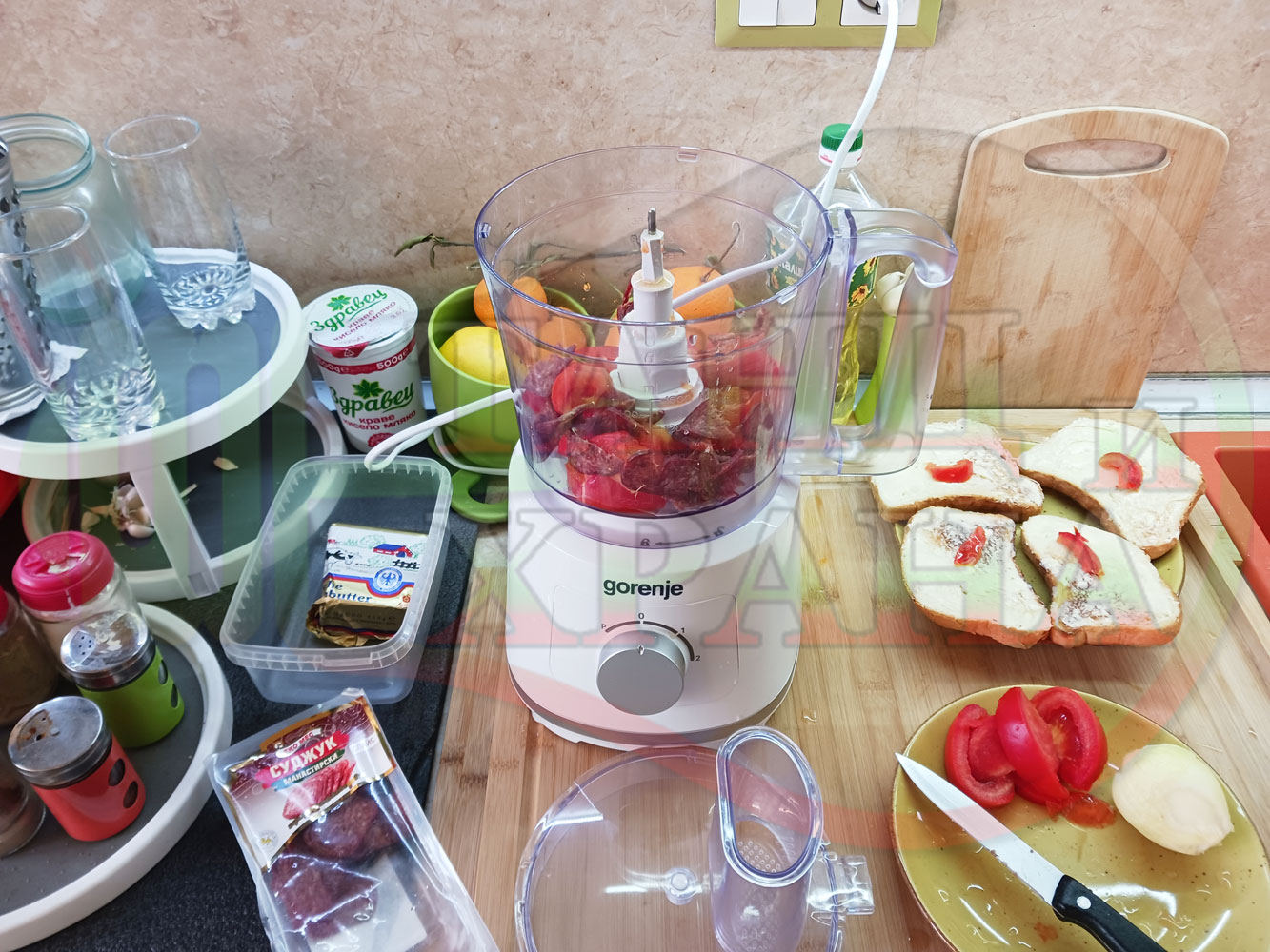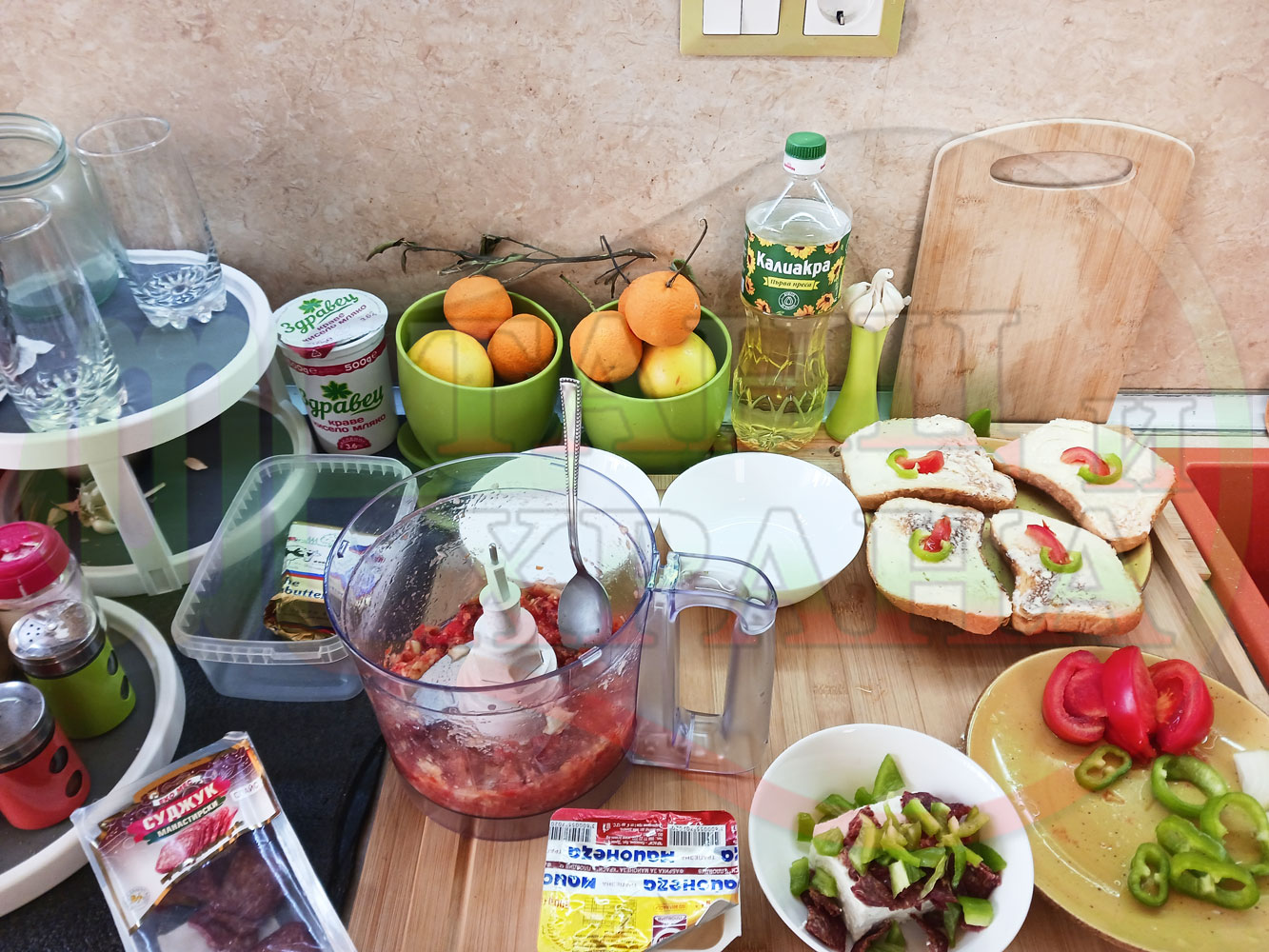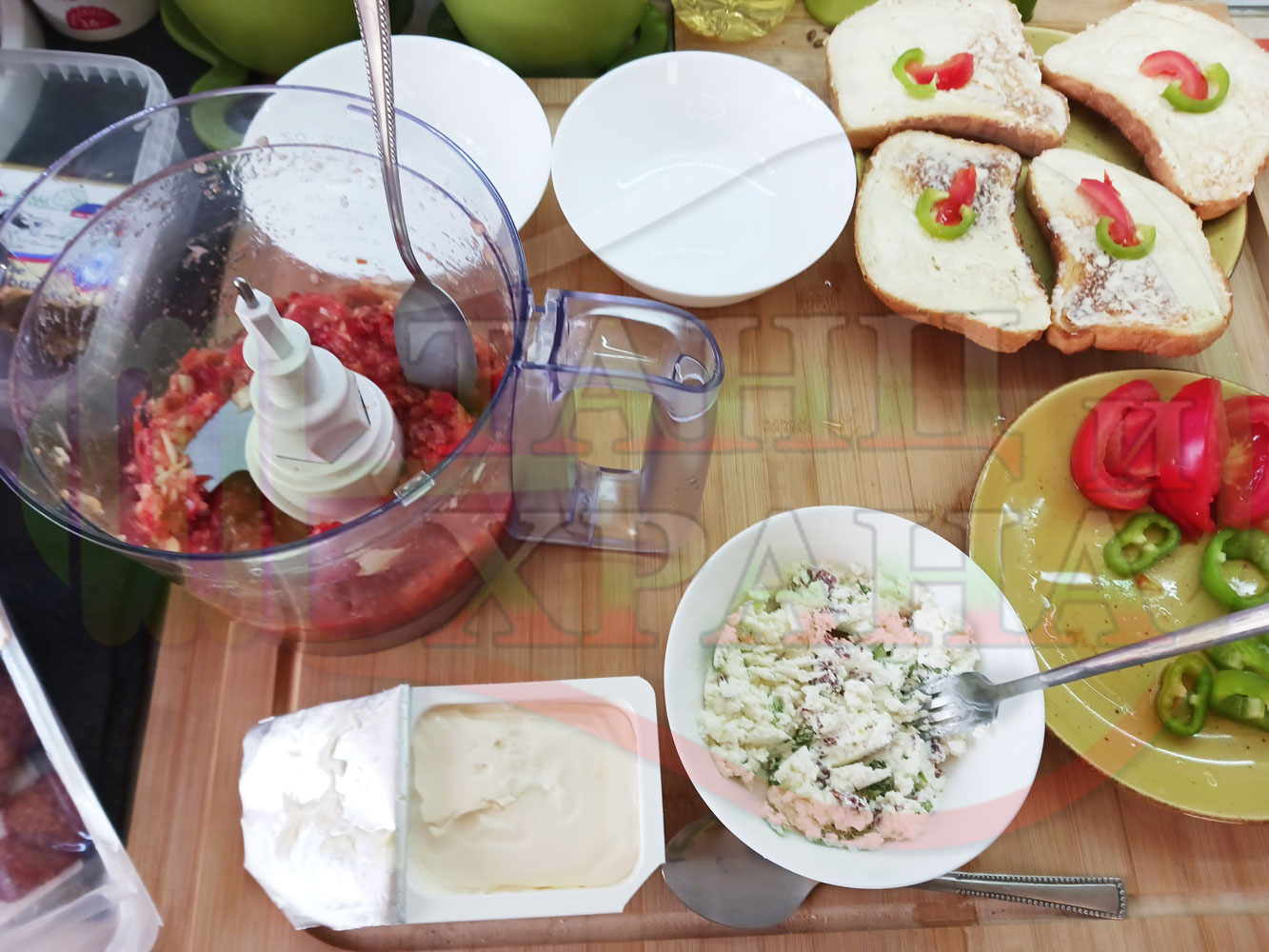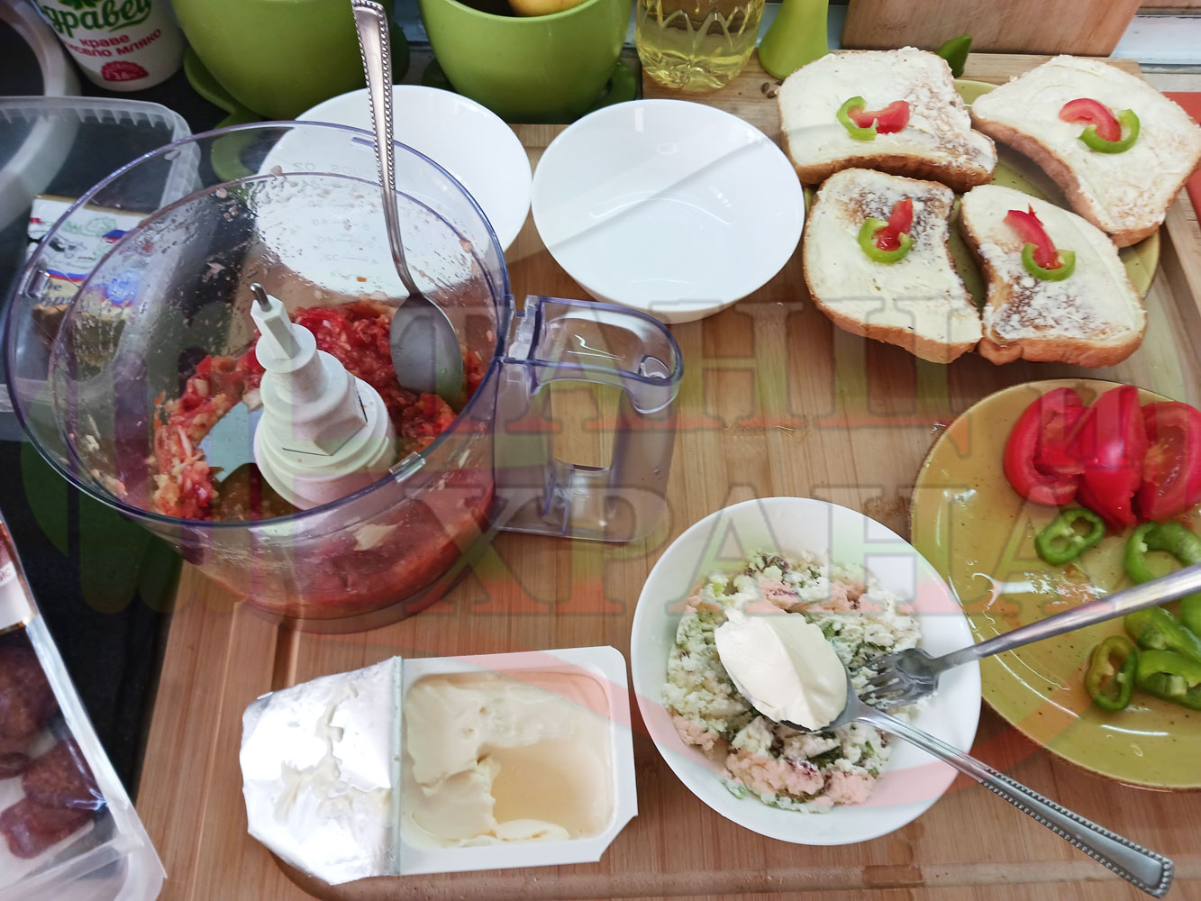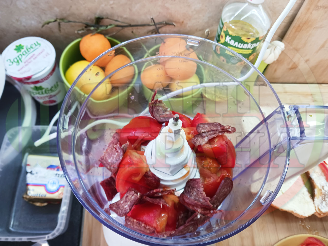 ПРОДУКТИ: Приблизителни количества за българска доматена студена сурова супа "Доматенолучена суджуковозеленочушкова майонезена с БГсирене" приготвена с пресни домати и кромид лук гарнирана с топчета от сиренов крем от зелени чушки, суджук, майонеза и краве бяло сирене - двукомпонентна