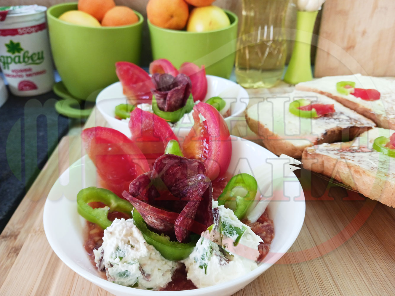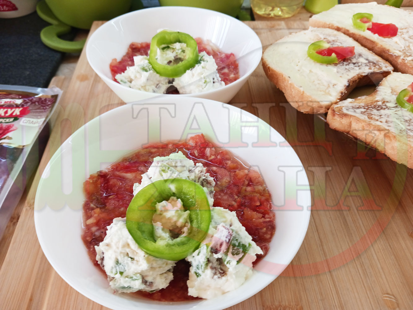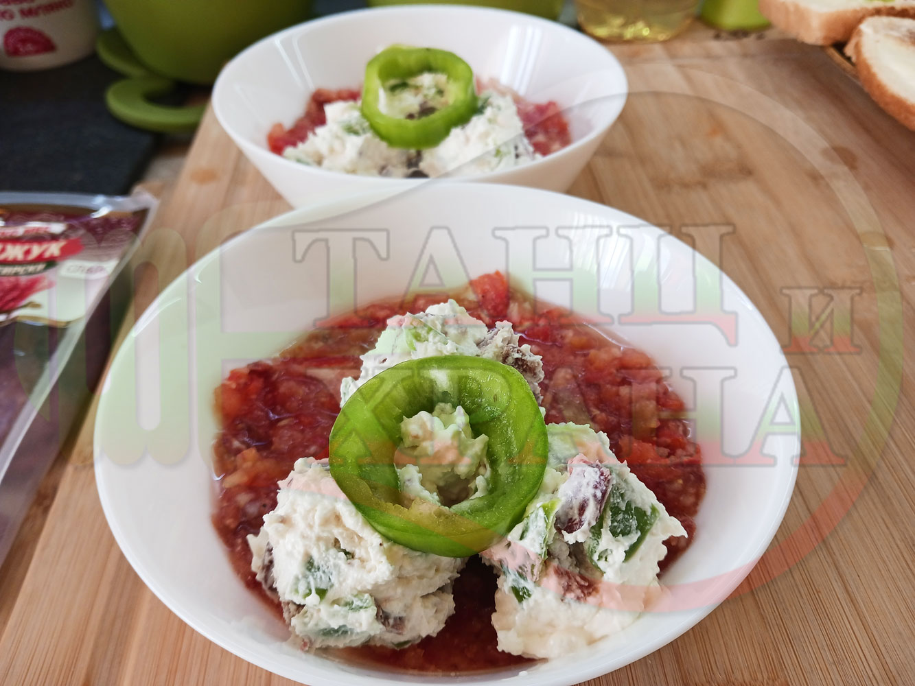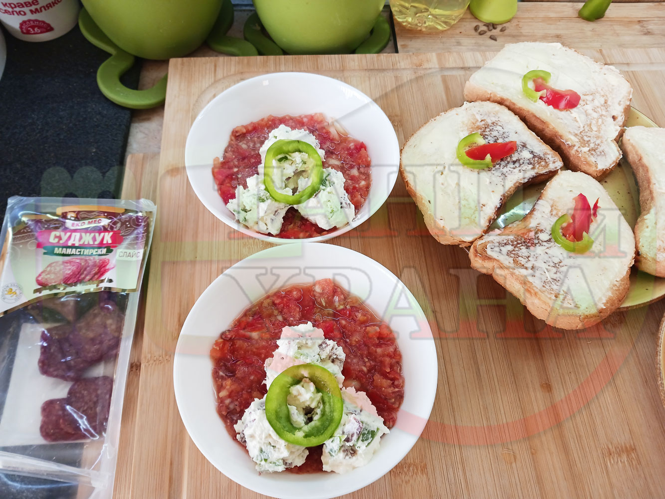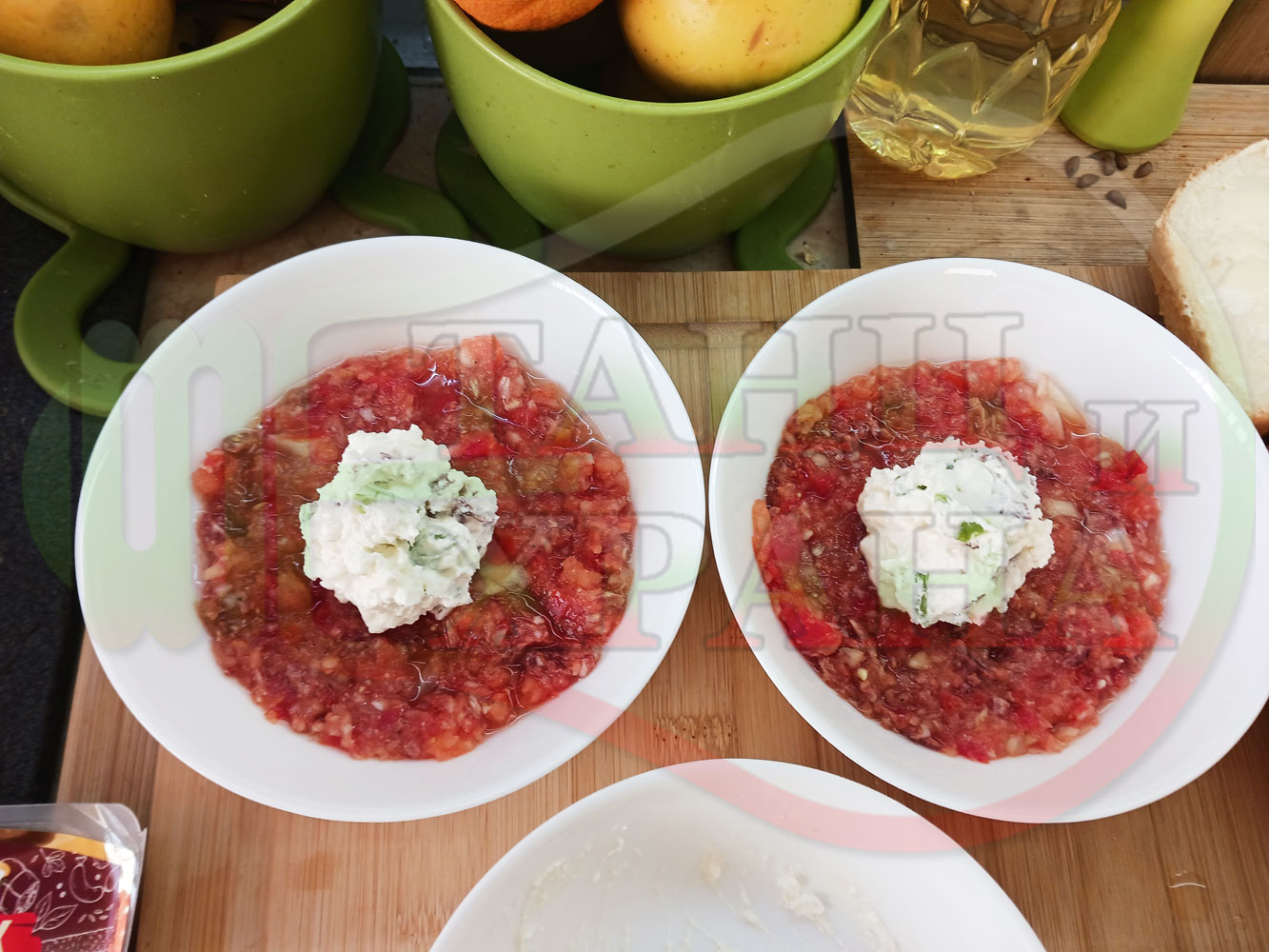 Българска доматена студена сурова супа "Доматенолучена суджуковозеленочушкова майонезена с БГсирене" приготвена с пресни домати и кромид лук гарнирана с топчета от сиренов крем от зелени чушки, суджук, майонеза и краве бяло сирене - двукомпонентна