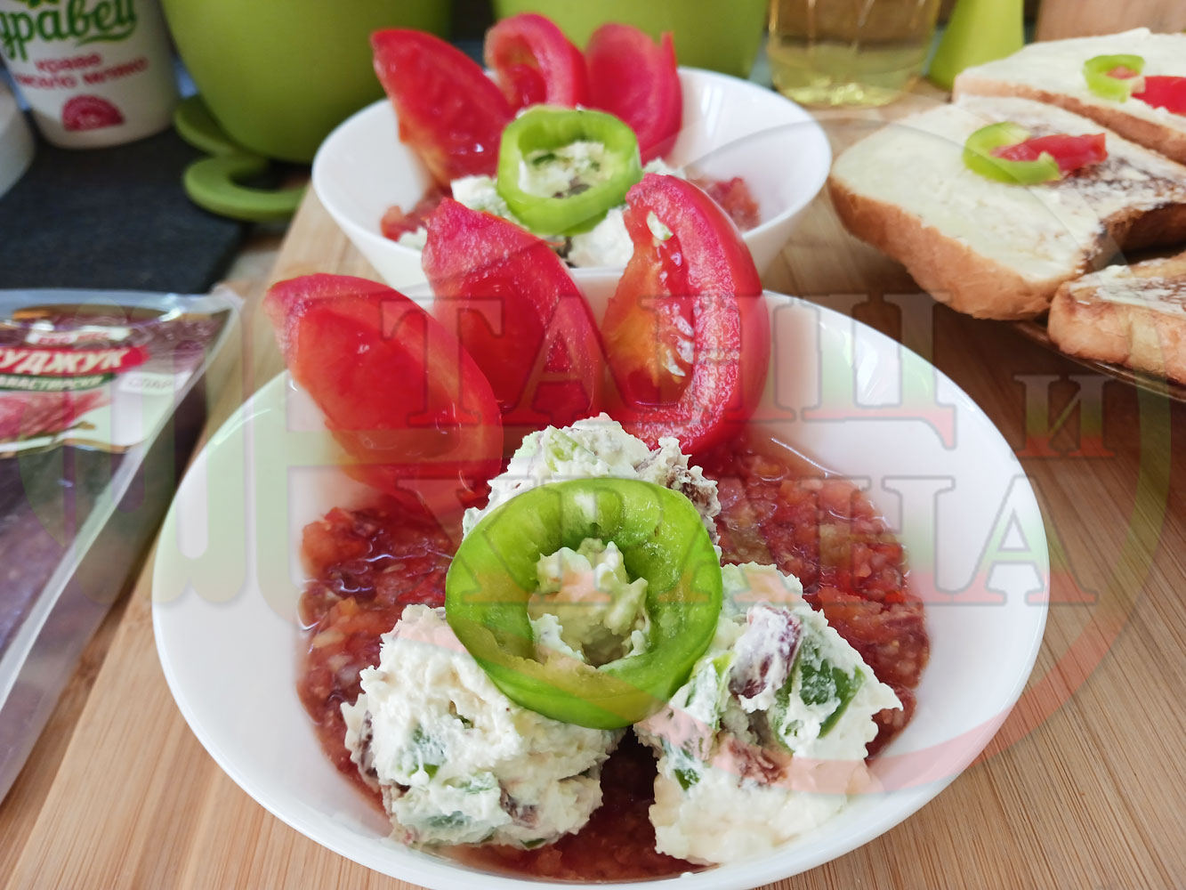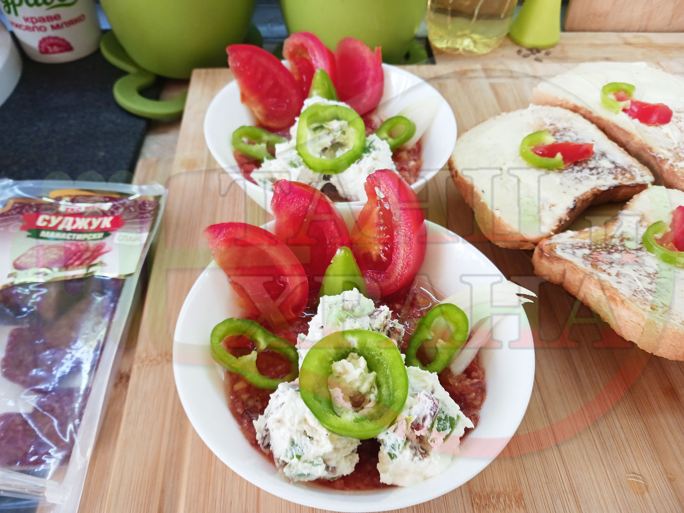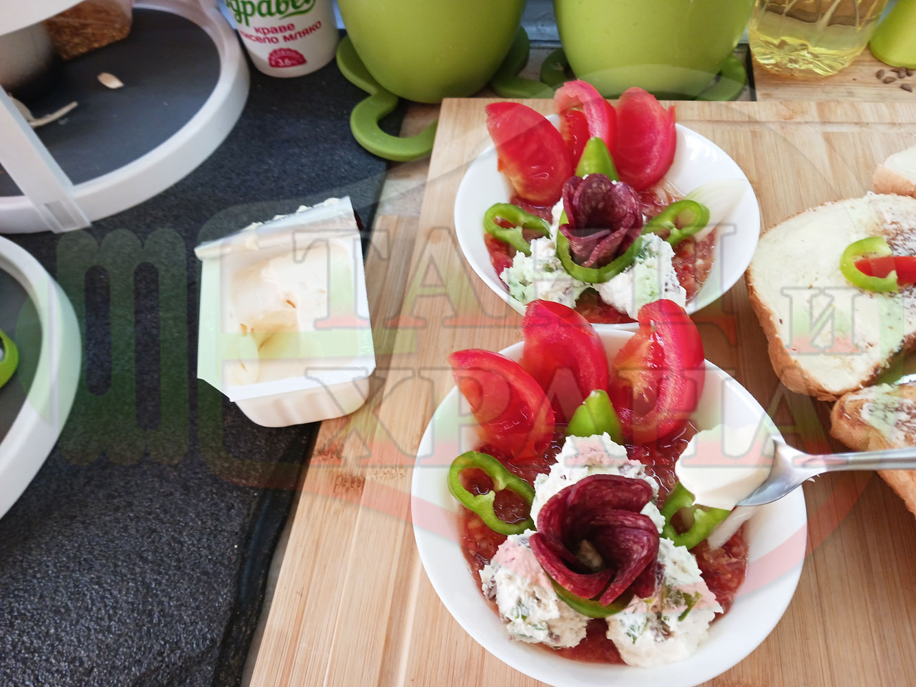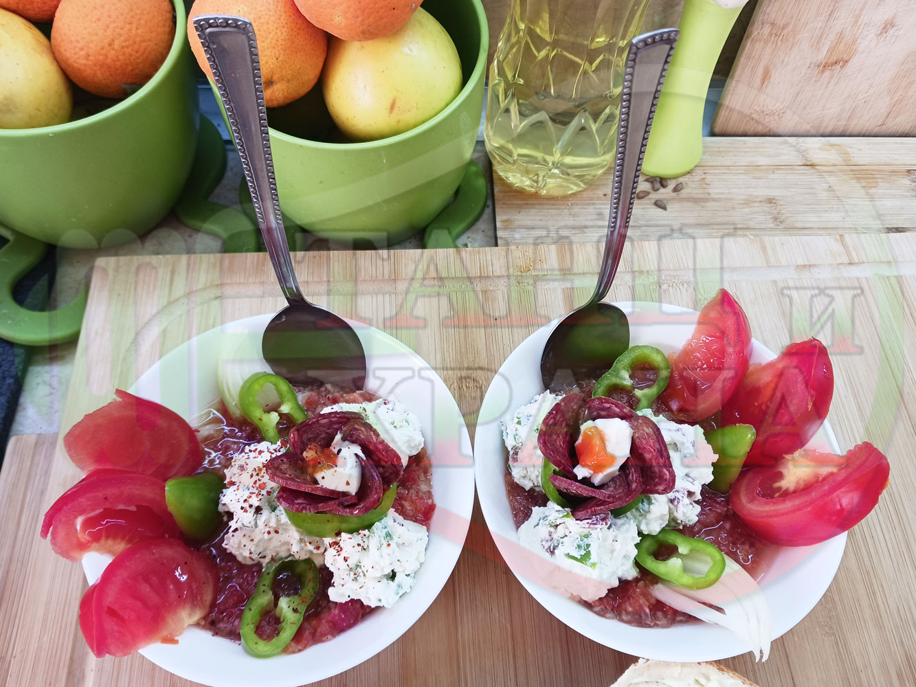 Българска доматена студена сурова супа "Доматенолучена суджуковозеленочушкова майонезена с БГсирене" приготвена с пресни домати и кромид лук гарнирана с топчета от сиренов крем от зелени чушки, суджук, майонеза и краве бяло сирене - двукомпонентна