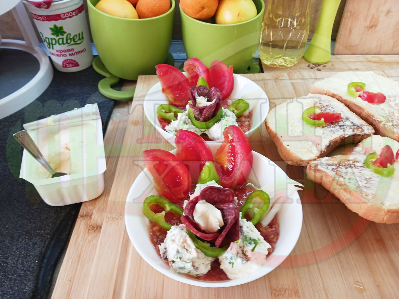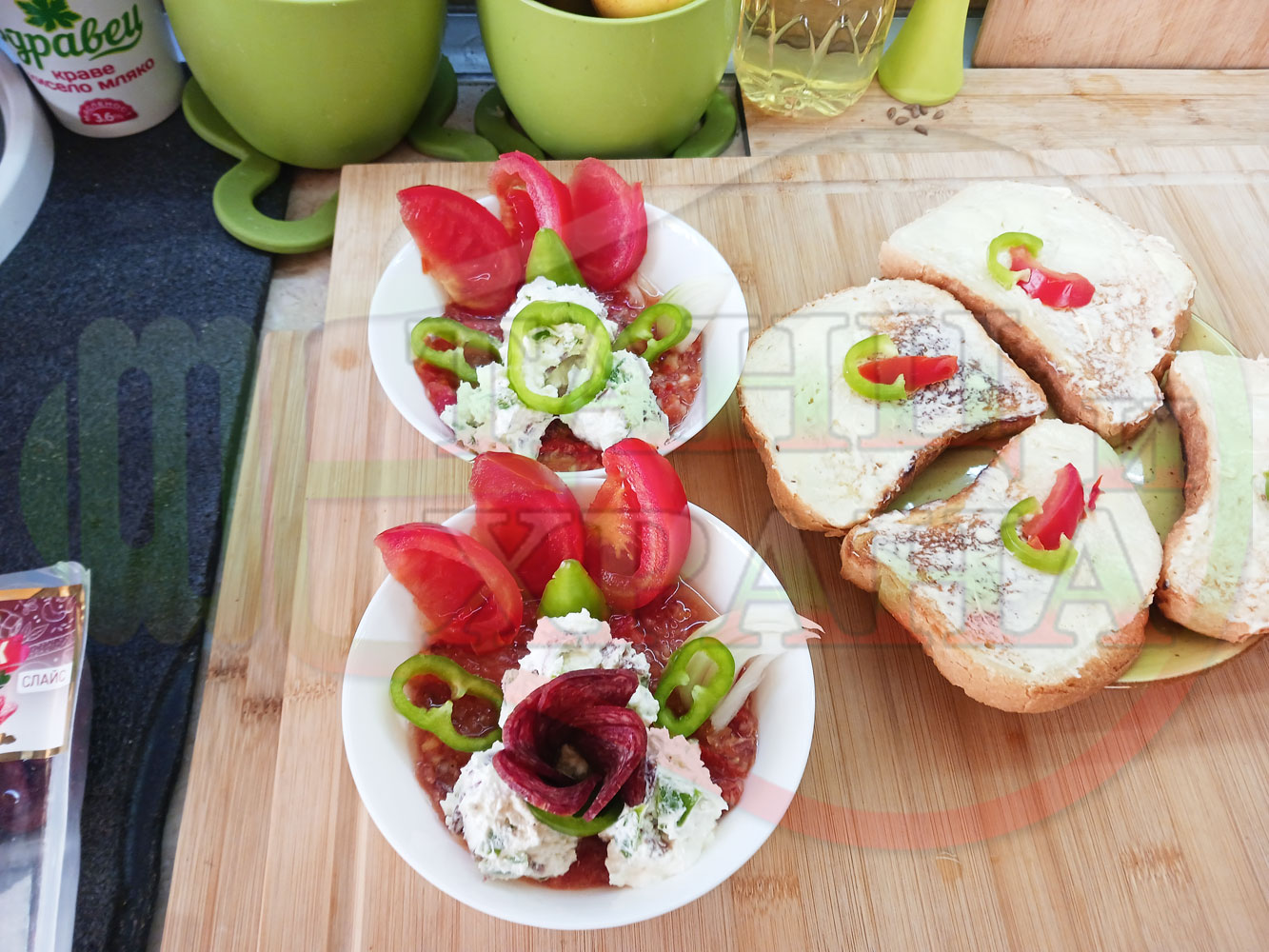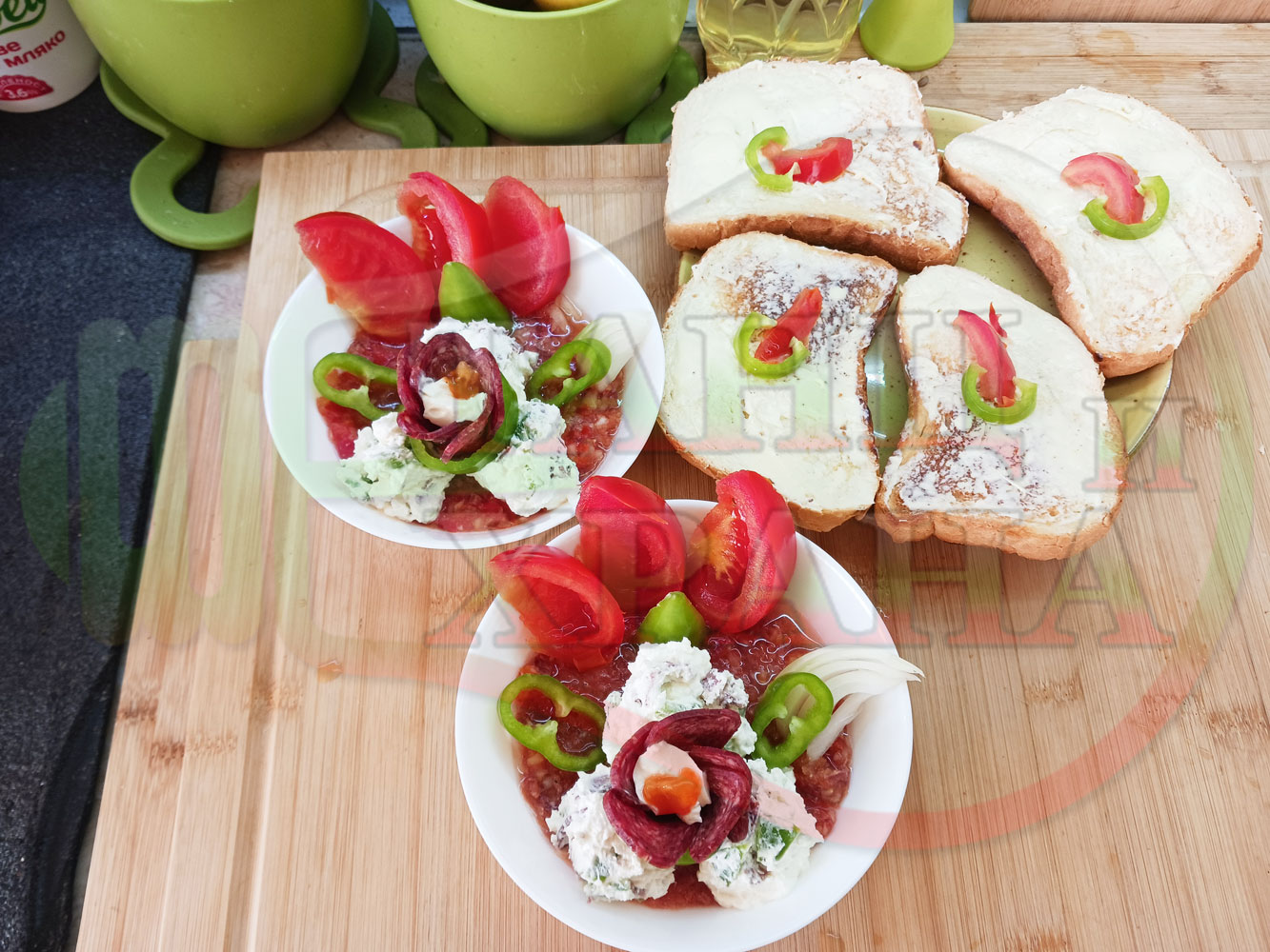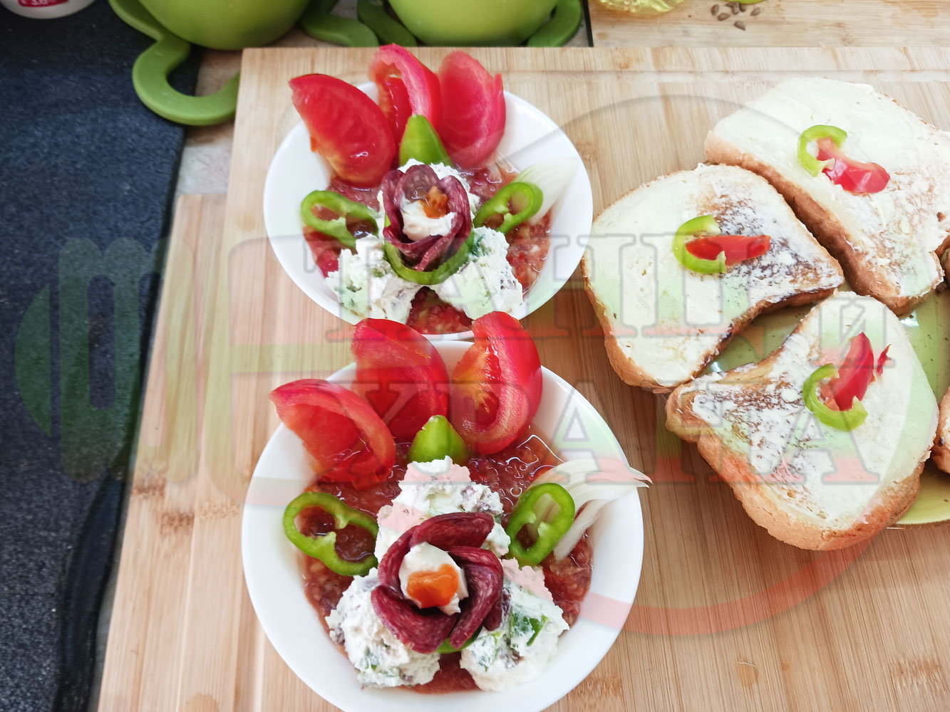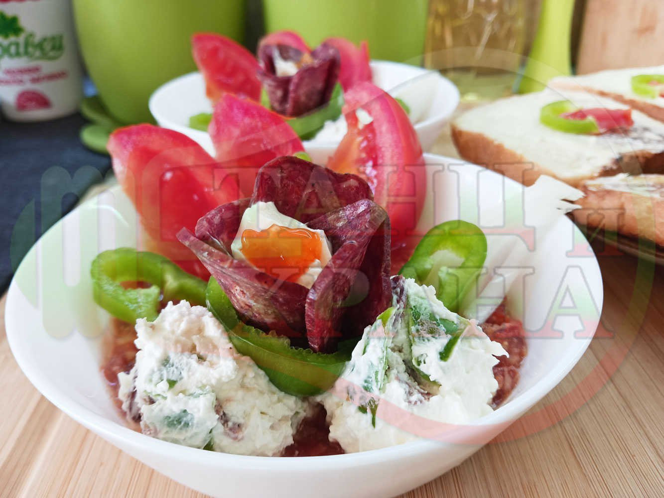 Българска доматена студена сурова супа "Доматенолучена суджуковозеленочушкова майонезена с БГсирене" приготвена с пресни домати и кромид лук гарнирана с топчета от сиренов крем от зелени чушки, суджук, майонеза и краве бяло сирене - двукомпонентна