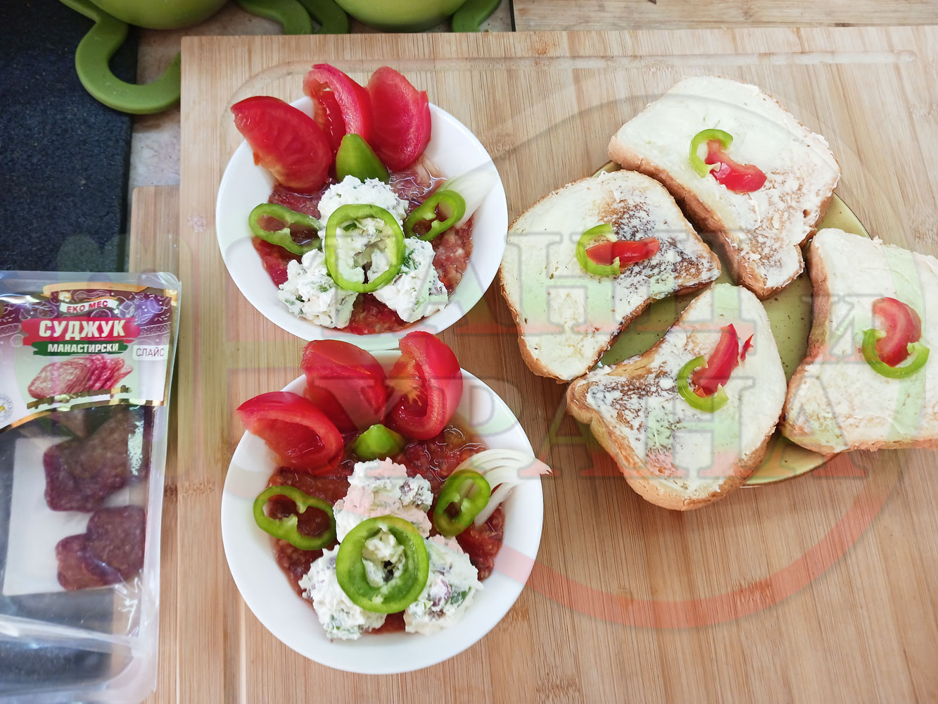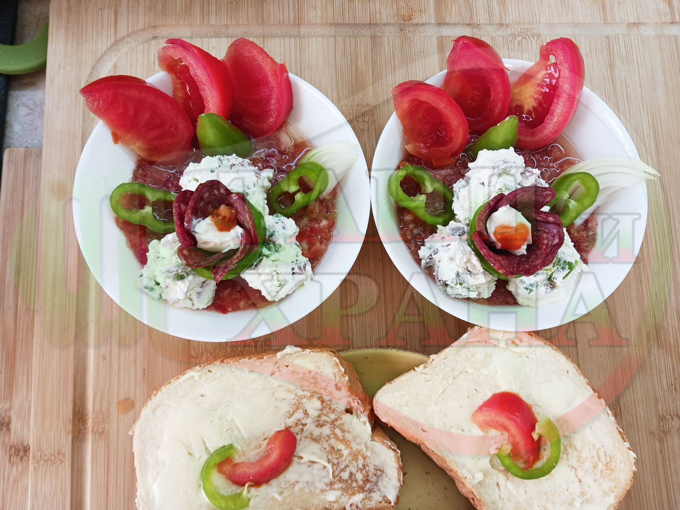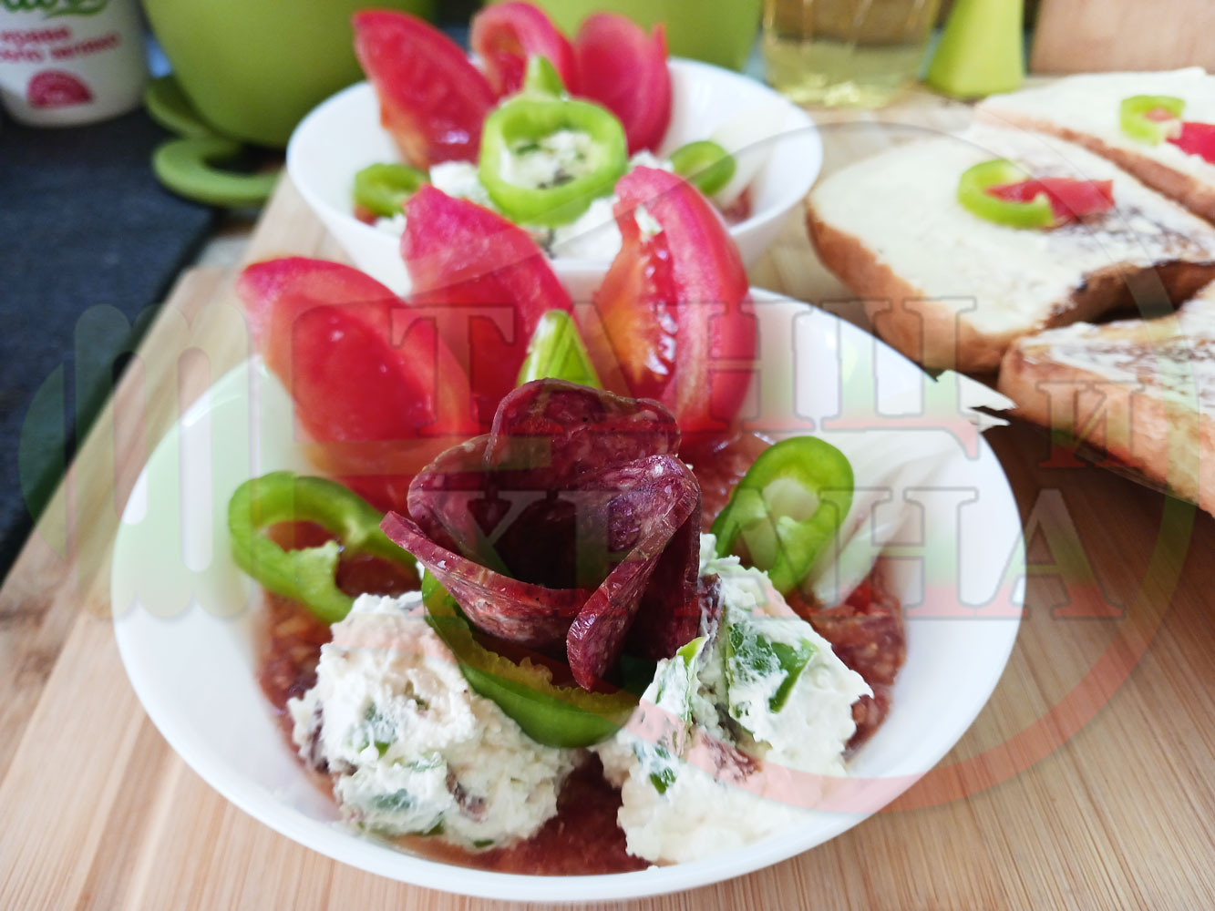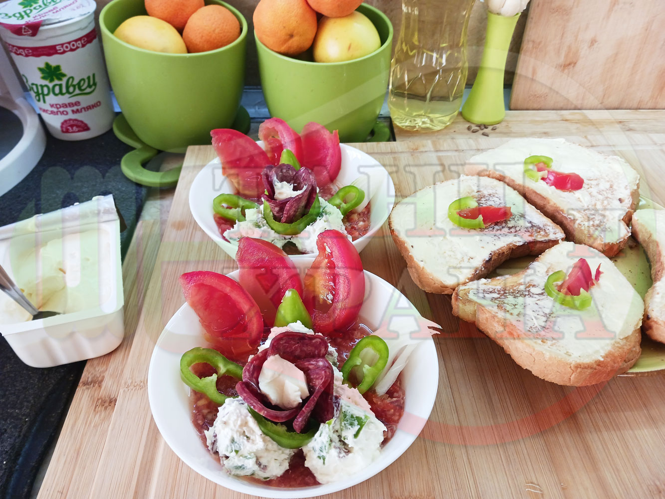 Българска доматена студена сурова супа "Доматенолучена суджуковозеленочушкова майонезена с БГсирене" приготвена с пресни домати и кромид лук гарнирана с топчета от сиренов крем от зелени чушки, суджук, майонеза и краве бяло сирене - двукомпонентна