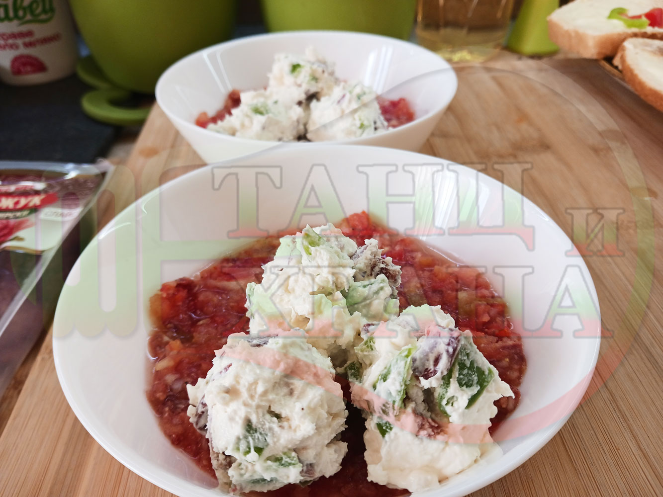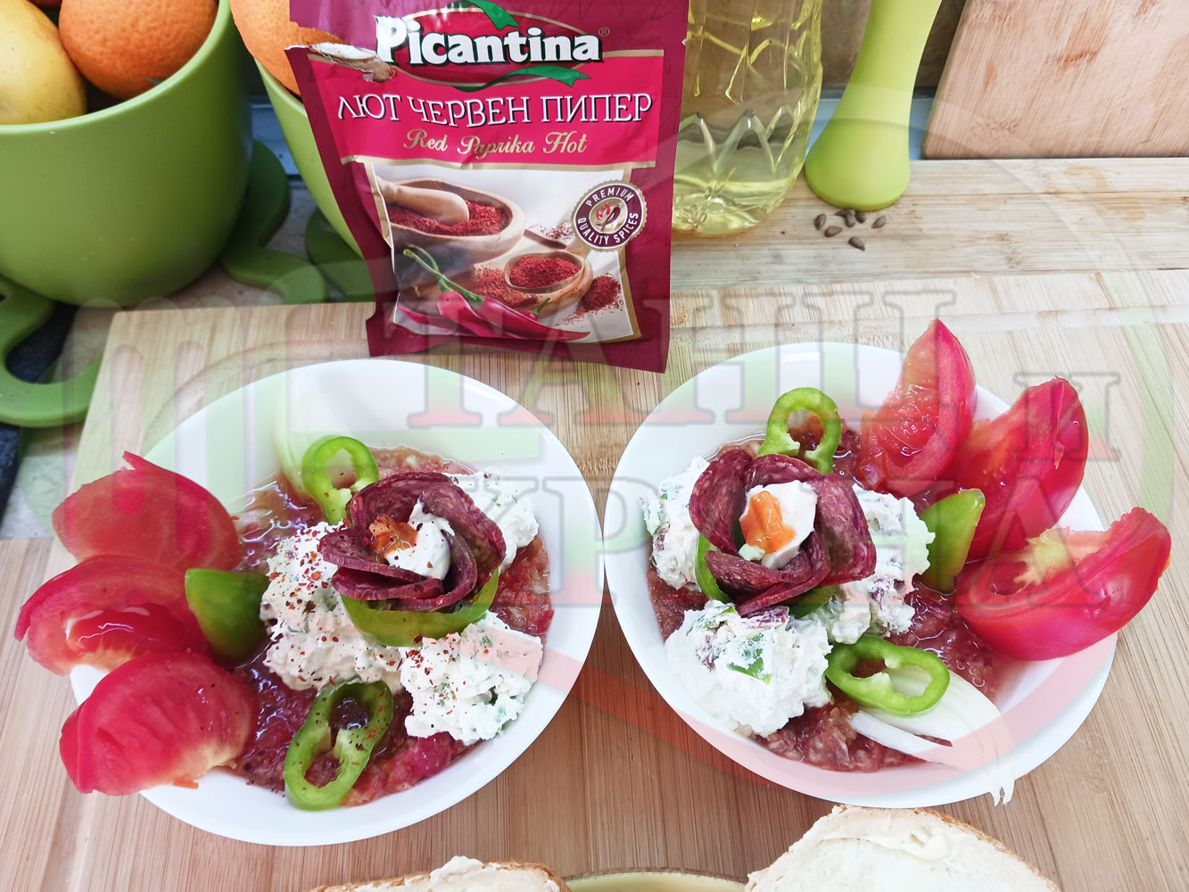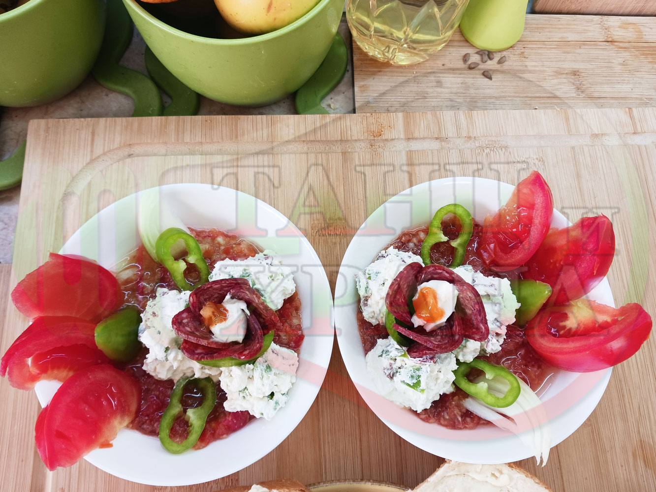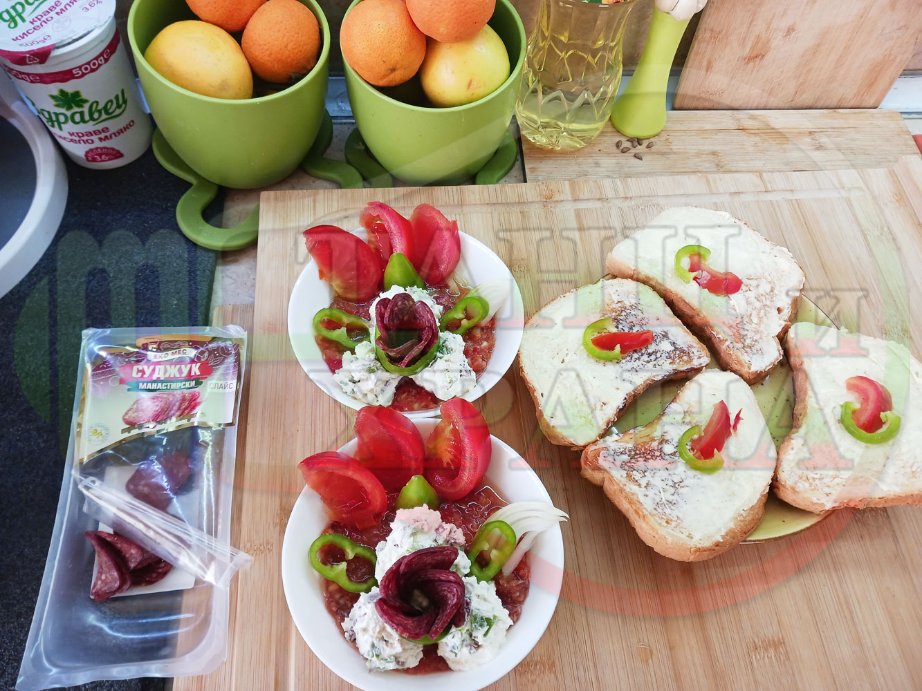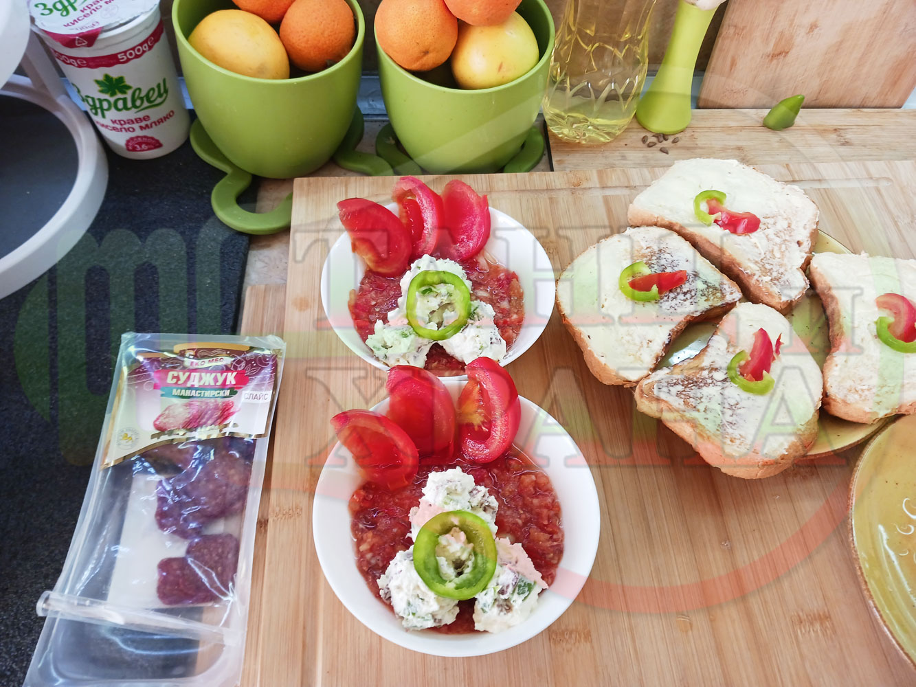 Българска доматена студена сурова супа "Доматенолучена суджуковозеленочушкова майонезена с БГсирене" приготвена с пресни домати и кромид лук гарнирана с топчета от сиренов крем от зелени чушки, суджук, майонеза и краве бяло сирене - двукомпонентна