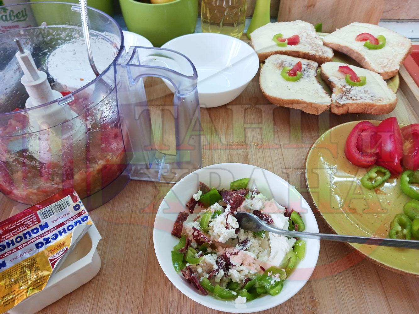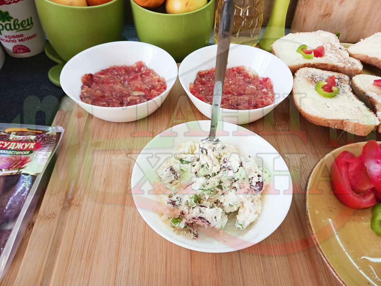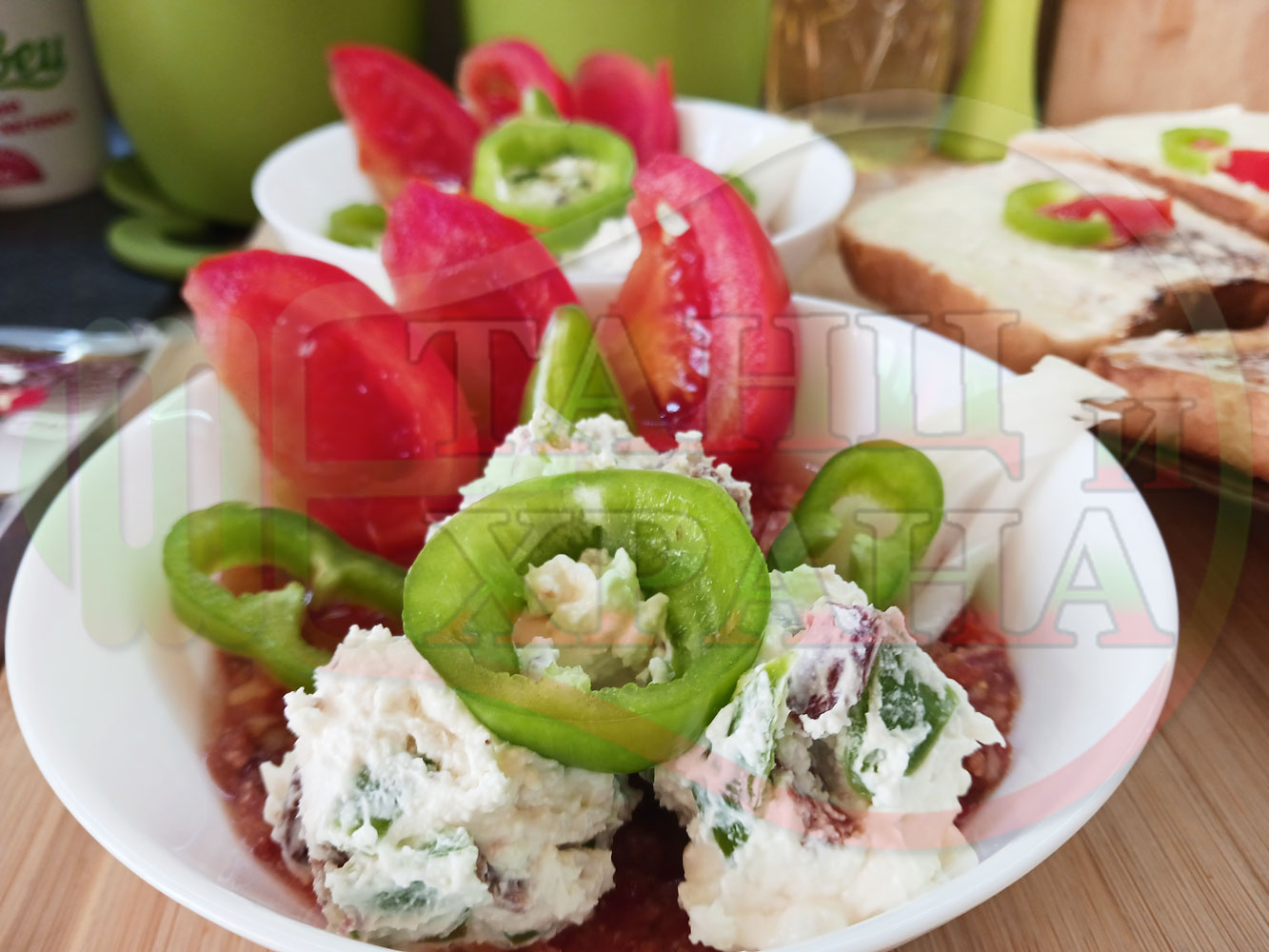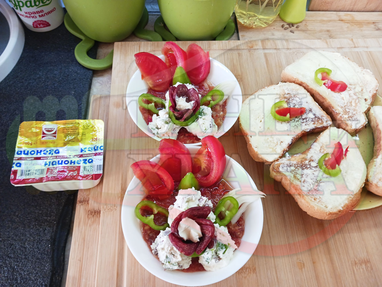 Българска доматена студена сурова супа "Доматенолучена суджуковозеленочушкова майонезена с БГсирене" приготвена с пресни домати и кромид лук гарнирана с топчета от сиренов крем от зелени чушки, суджук, майонеза и краве бяло сирене - двукомпонентна
