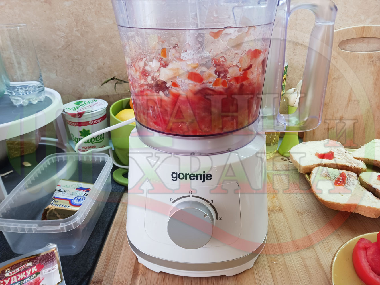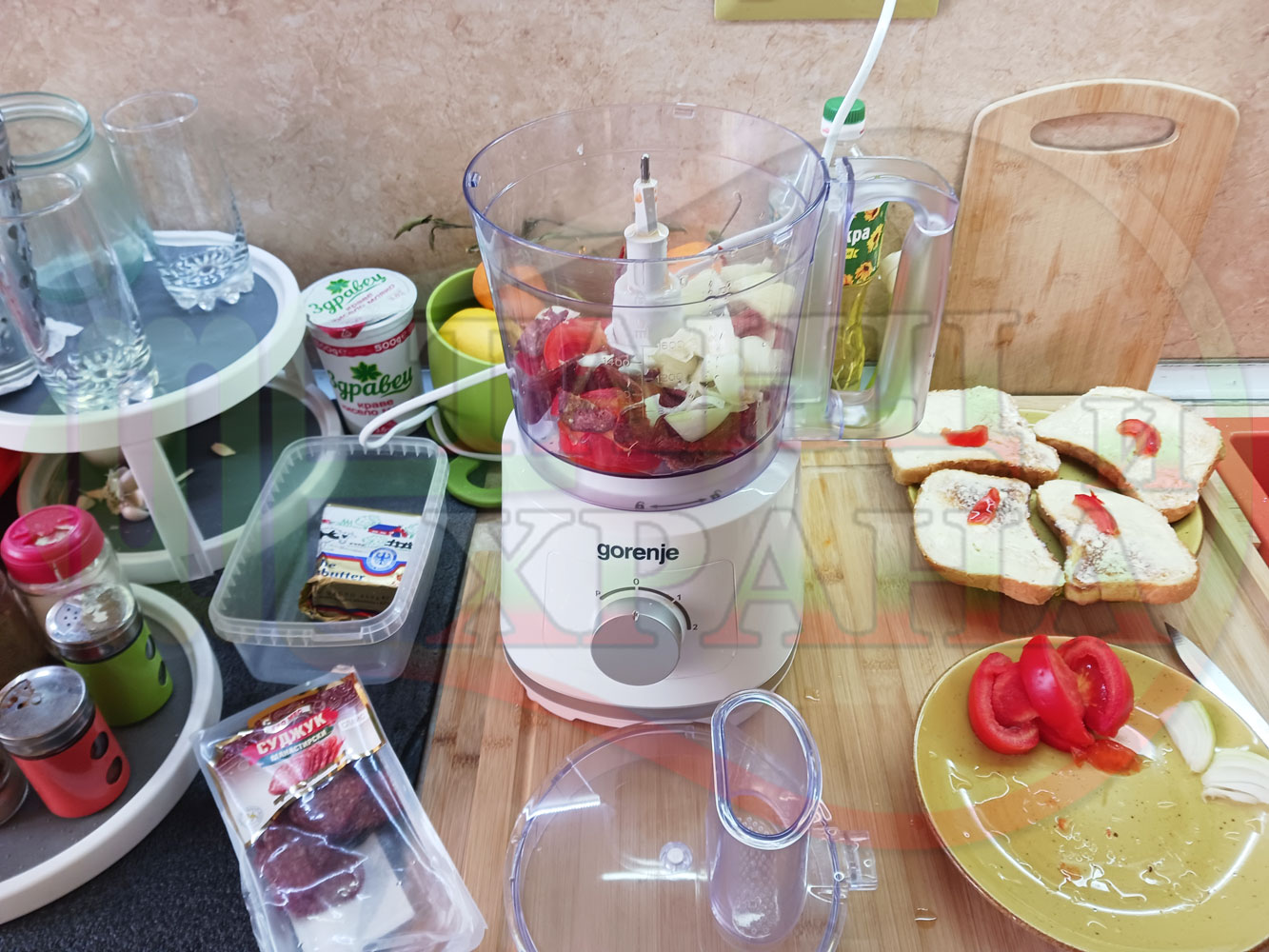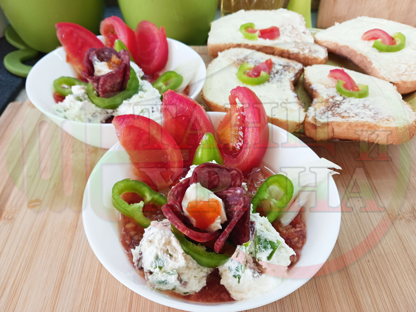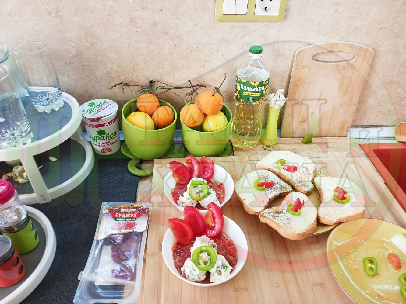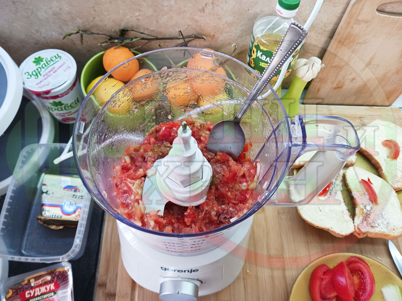 Българска доматена студена сурова супа "Доматенолучена суджуковозеленочушкова майонезена с БГсирене" приготвена с пресни домати и кромид лук гарнирана с топчета от сиренов крем от зелени чушки, суджук, майонеза и краве бяло сирене - двукомпонентна