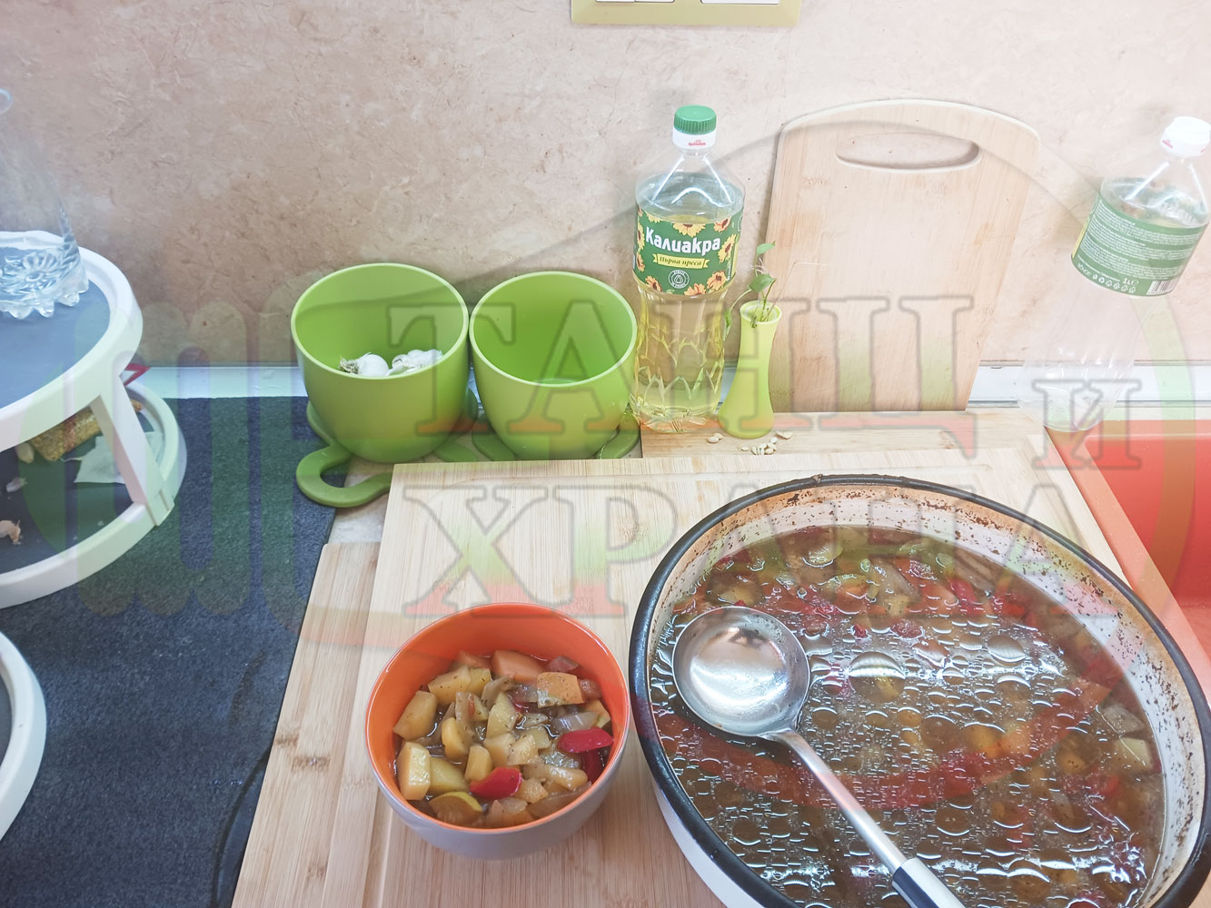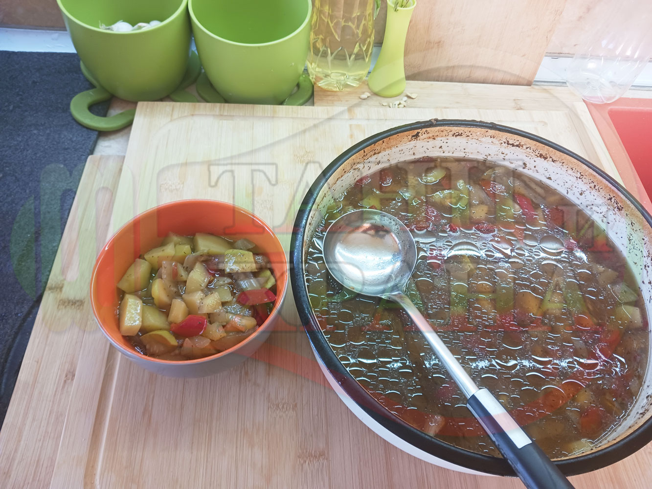 В "Свързани продукти" вижте рецептата на основно сварената картофена зеленчукова супа, рецептите на други видове картофени постни и непостни салати, супи, яхнии и техни"ТЕ" производни.