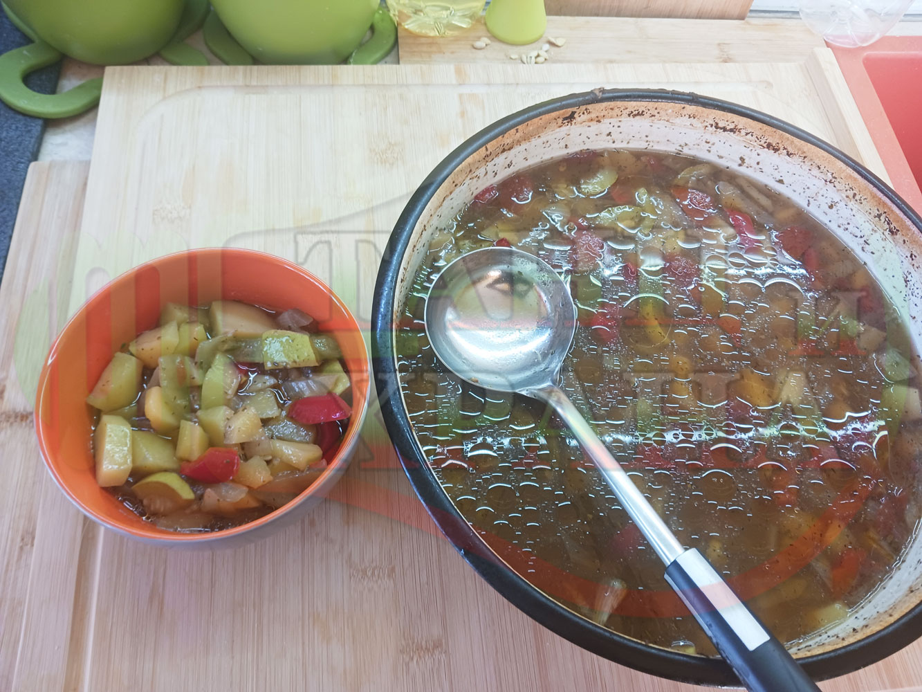ВНИМАНИЕ: Фурните са различни и съответно времето за сваряване и леко запичане е ориентировъчно. Наблюдавайте процеса на запичане и при необходимост, покрийте с капак или отстранете тавата от фурната. Разбърквайте често продуктите за да се хомогенизират и съвсем леко запекат.