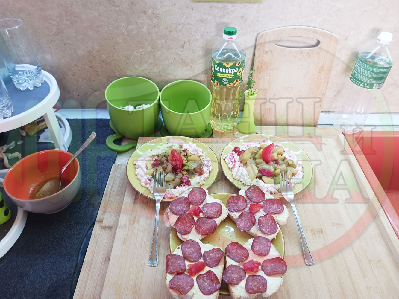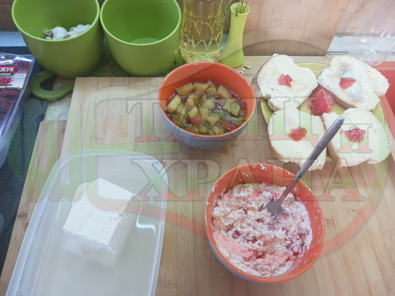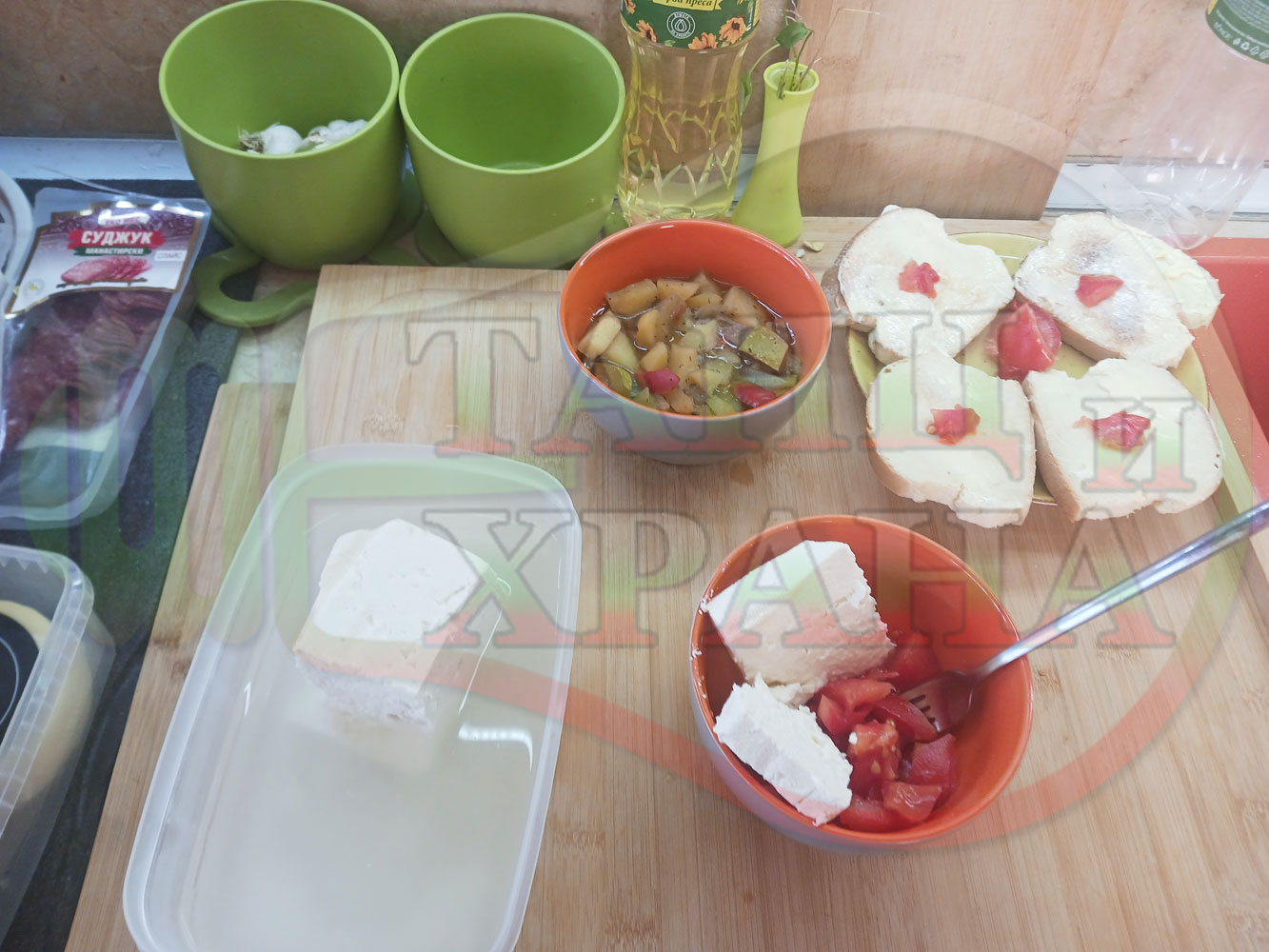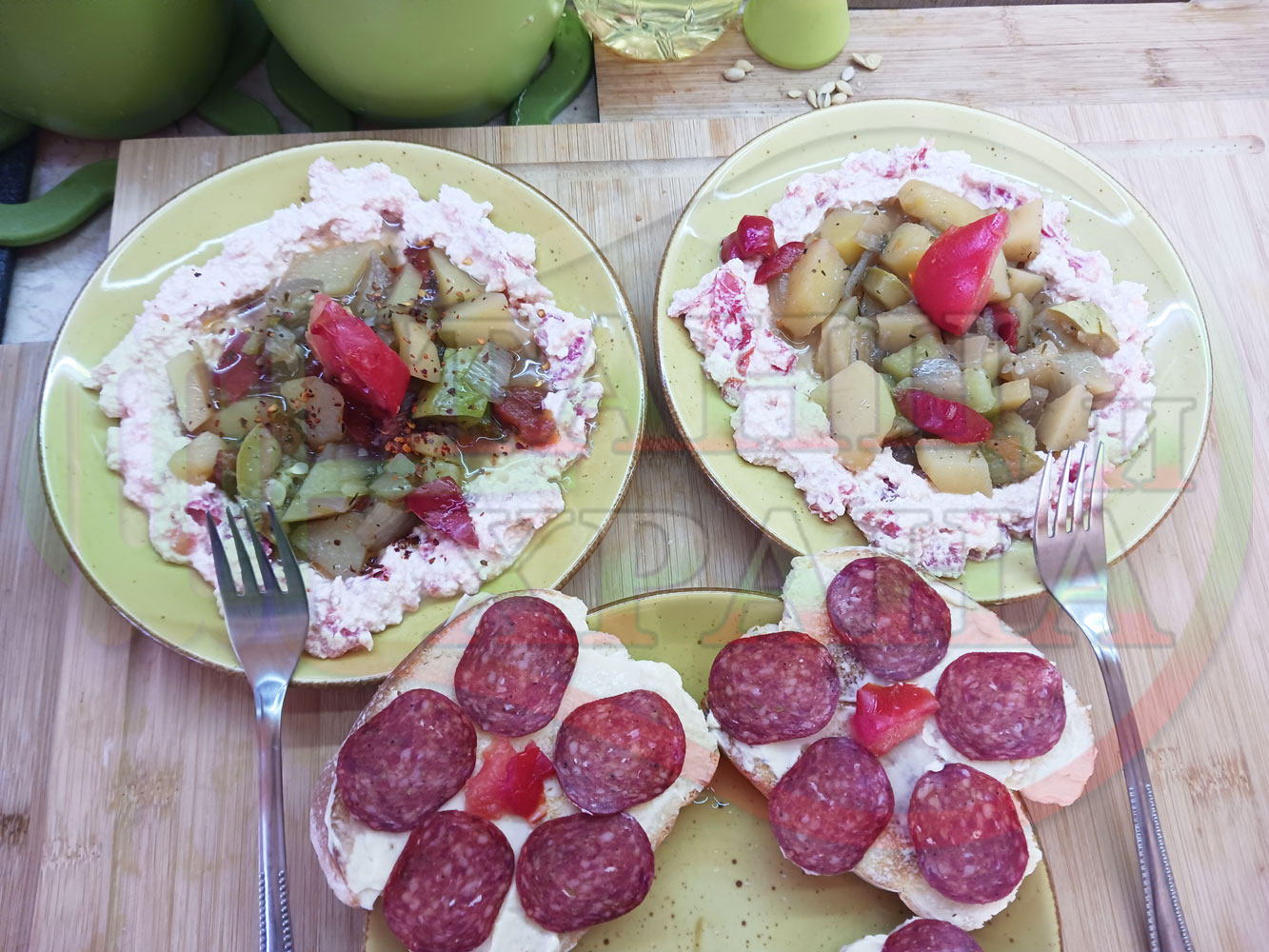 В случай, че сиреновият крем се получи прекалено гъст и солен, добавете част от нарязан домат за да го разредите или сгъстете прекалено редкия крем с краве бяло сирене (винаги имайте под ръка някакво малко парченце (количество) от дадения продукт за доовкусяване и прецезиране на гъстотата). Разбърквайте и намачквайте с вилица след добавянето на съответния продукт (за сгъстяване или разреждане) за да прецените гъстотата и вкуса на крема (зависи от големината и водното съдържание на домата/ите и солеността на сиренето). Съобразявайте и според вида на продукта за гарниране и неговото водно съдържание и особености (в случая са картофите, сварени със зеленчуци и български мерудии).