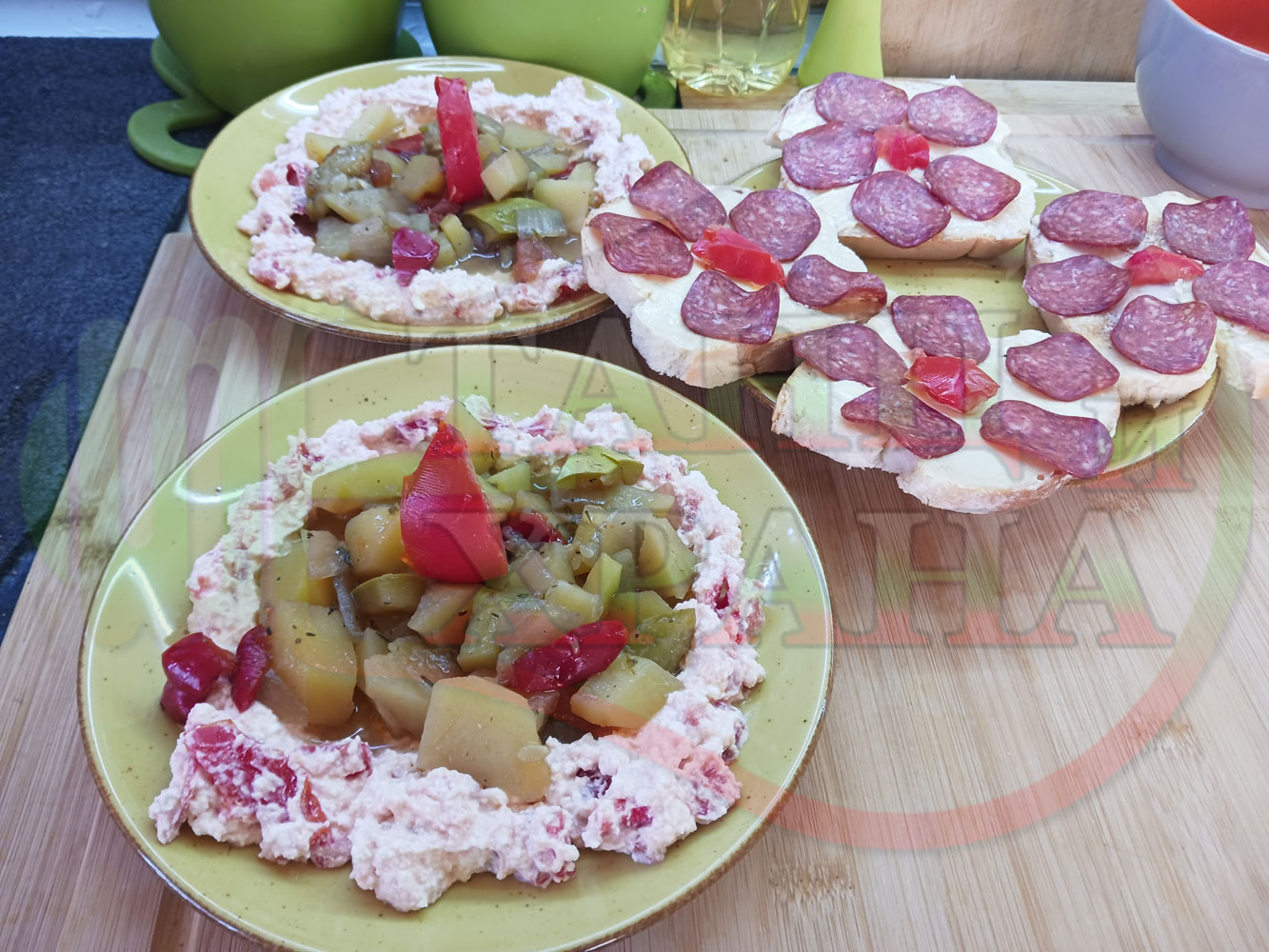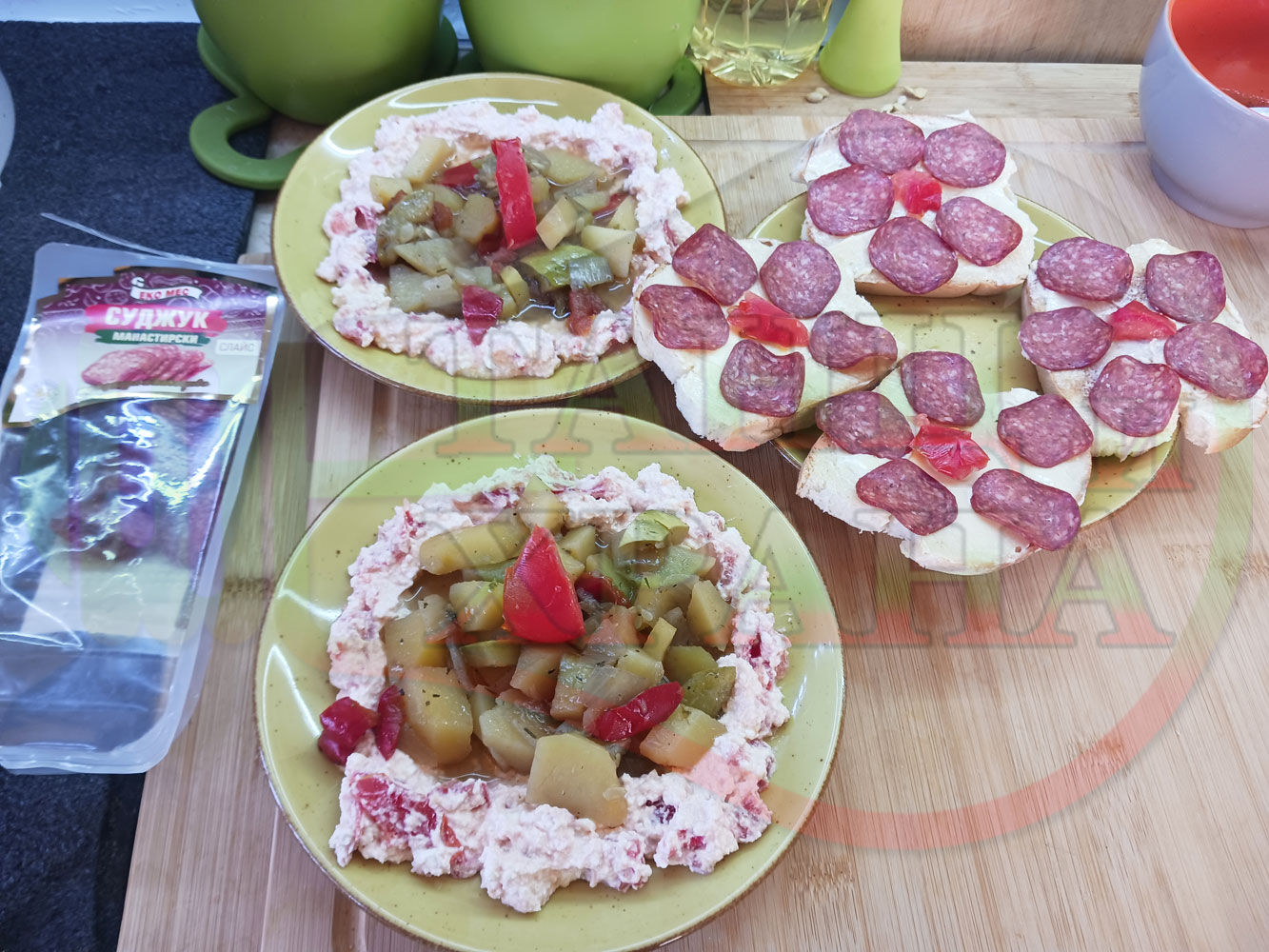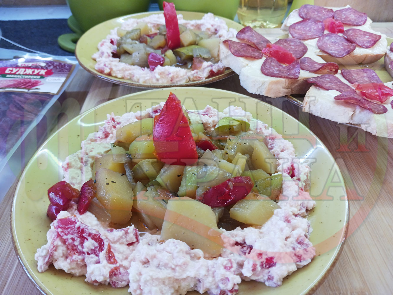 Българска картофена зеленчукова салата "Тиквичководоматена червеночушкова с БГсирене и мерудии" сварена на фурна с картофи, червени чушки, тиквички, кромид лук и домати напълнена в кладенчета от сиреново доматен крем - двукомпонентна (производна)