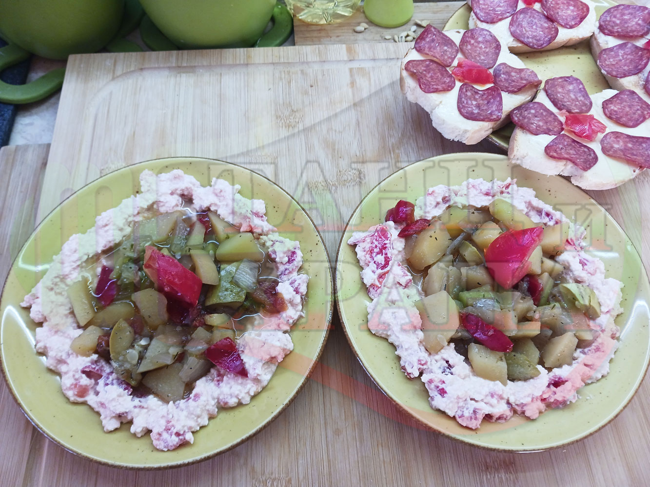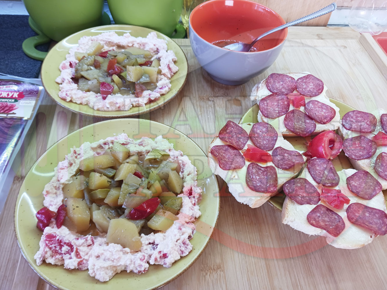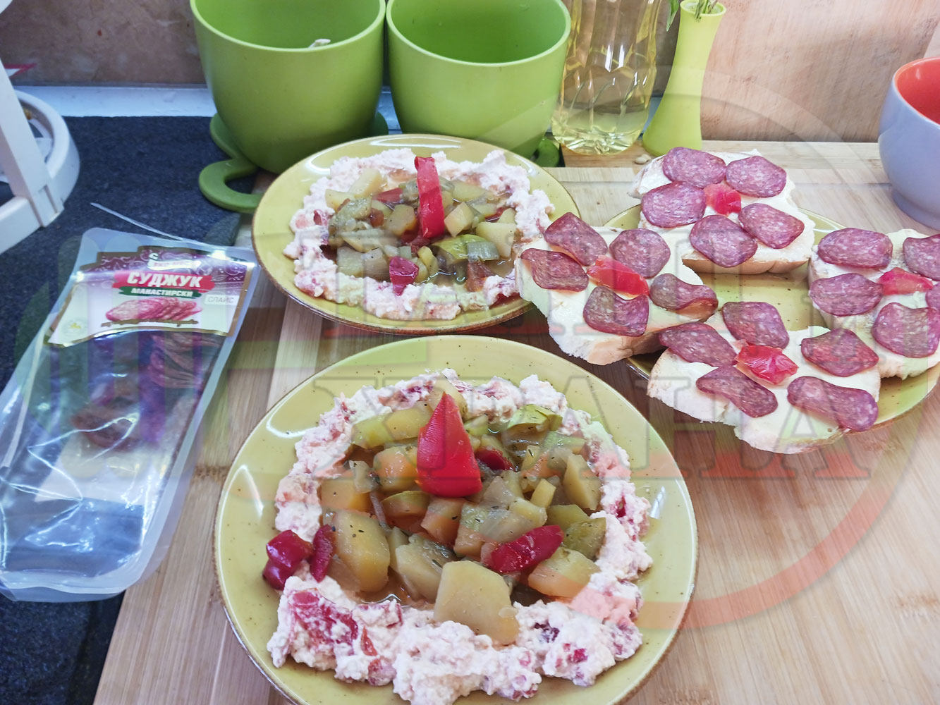 Българска картофена зеленчукова салата "Тиквичководоматена червеночушкова с БГсирене и мерудии" сварена на фурна с картофи, червени чушки, тиквички, кромид лук и домати напълнена в кладенчета от сиреново доматен крем - двукомпонентна (производна)