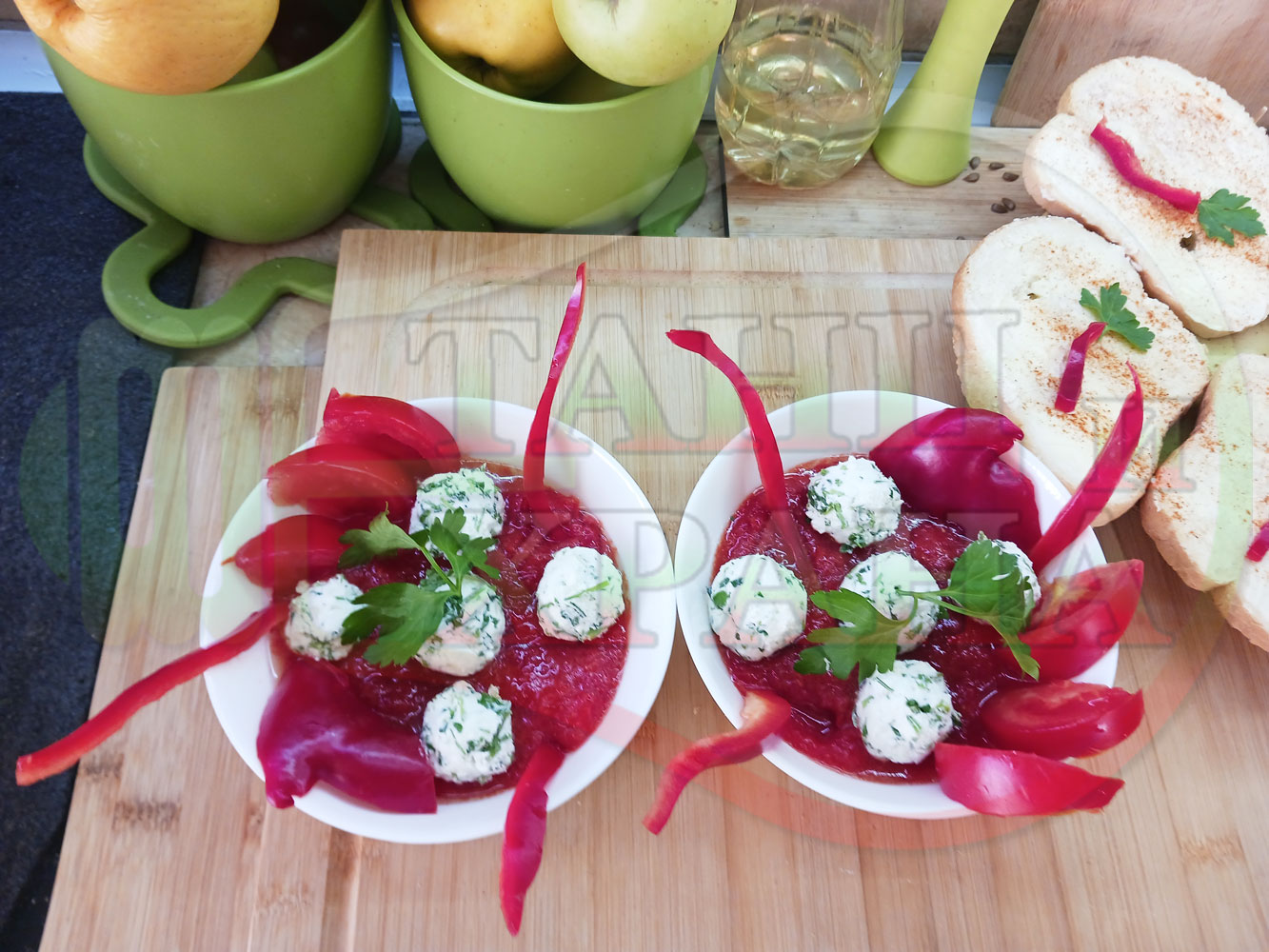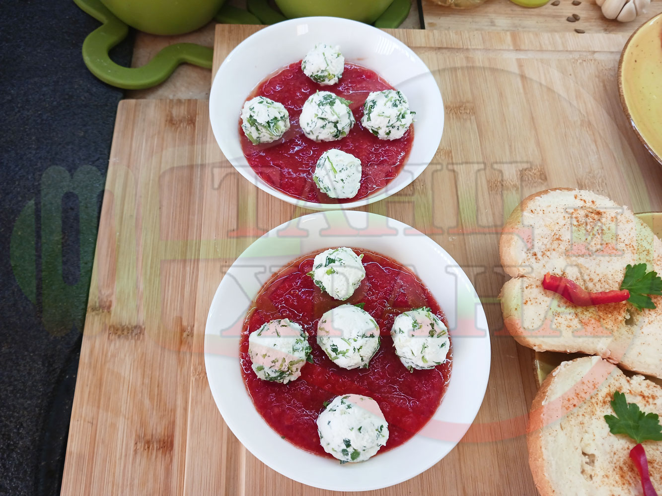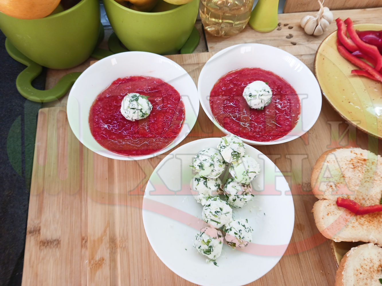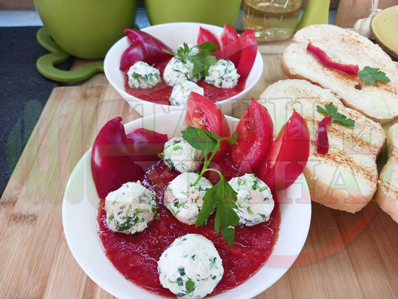 Българска сурова супа "Доматеночервеночушкова магданозеночеснова с БГсирене" приготвена от домати и червени пресни чушки гарнирана с топчета от сиреново магданозен крем с магданоз, чесън и краве бяло сирене (българско, саламурено) - двукомпонентна