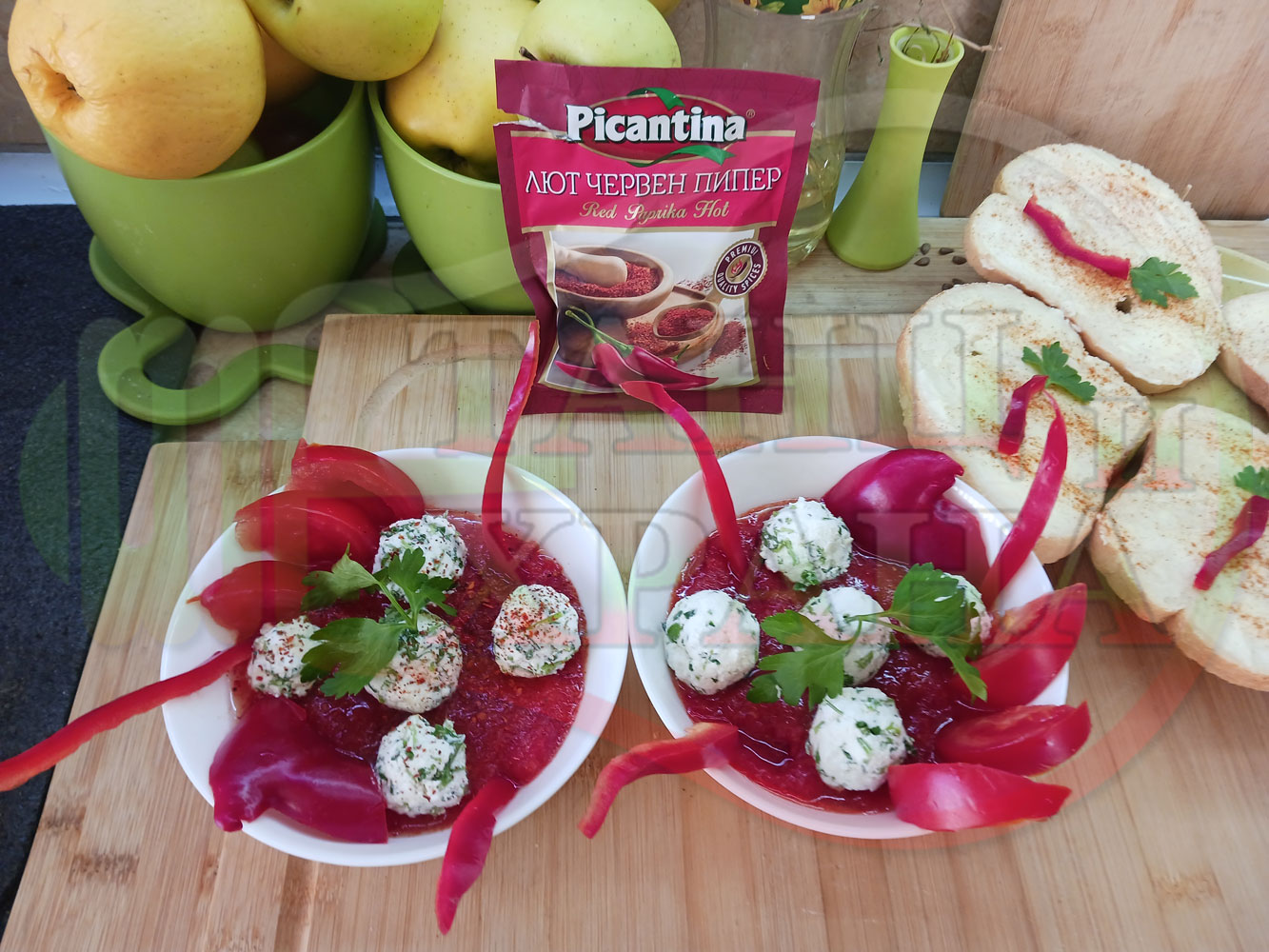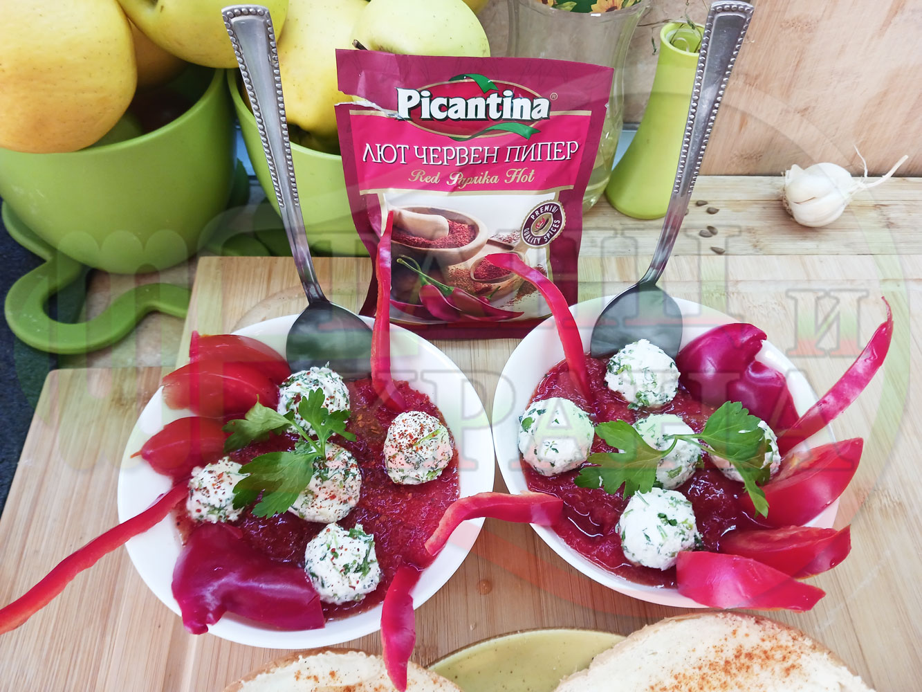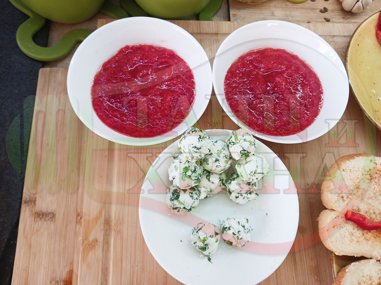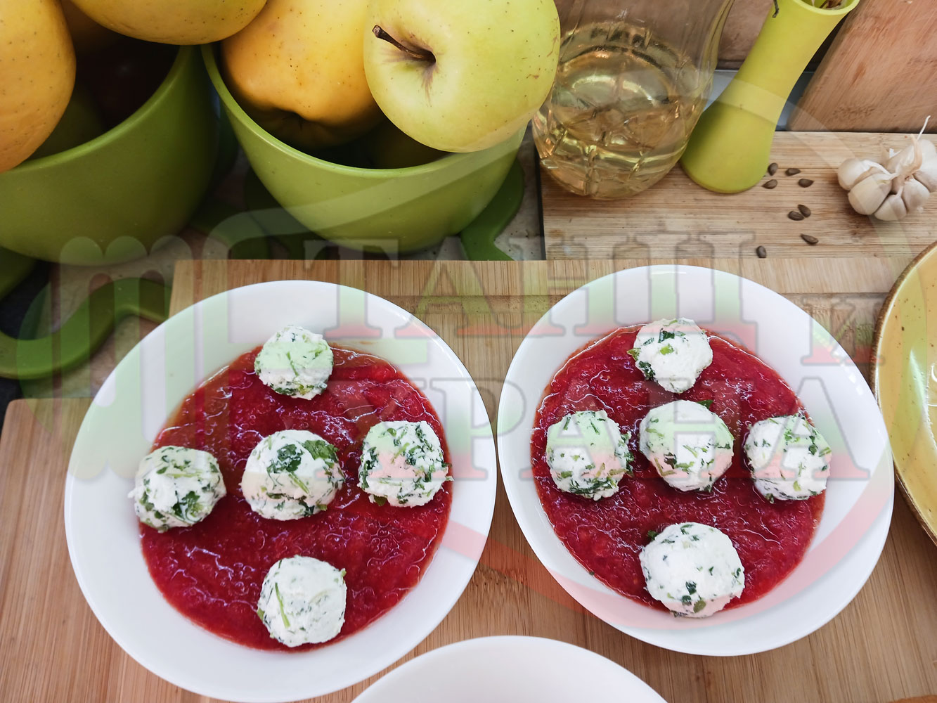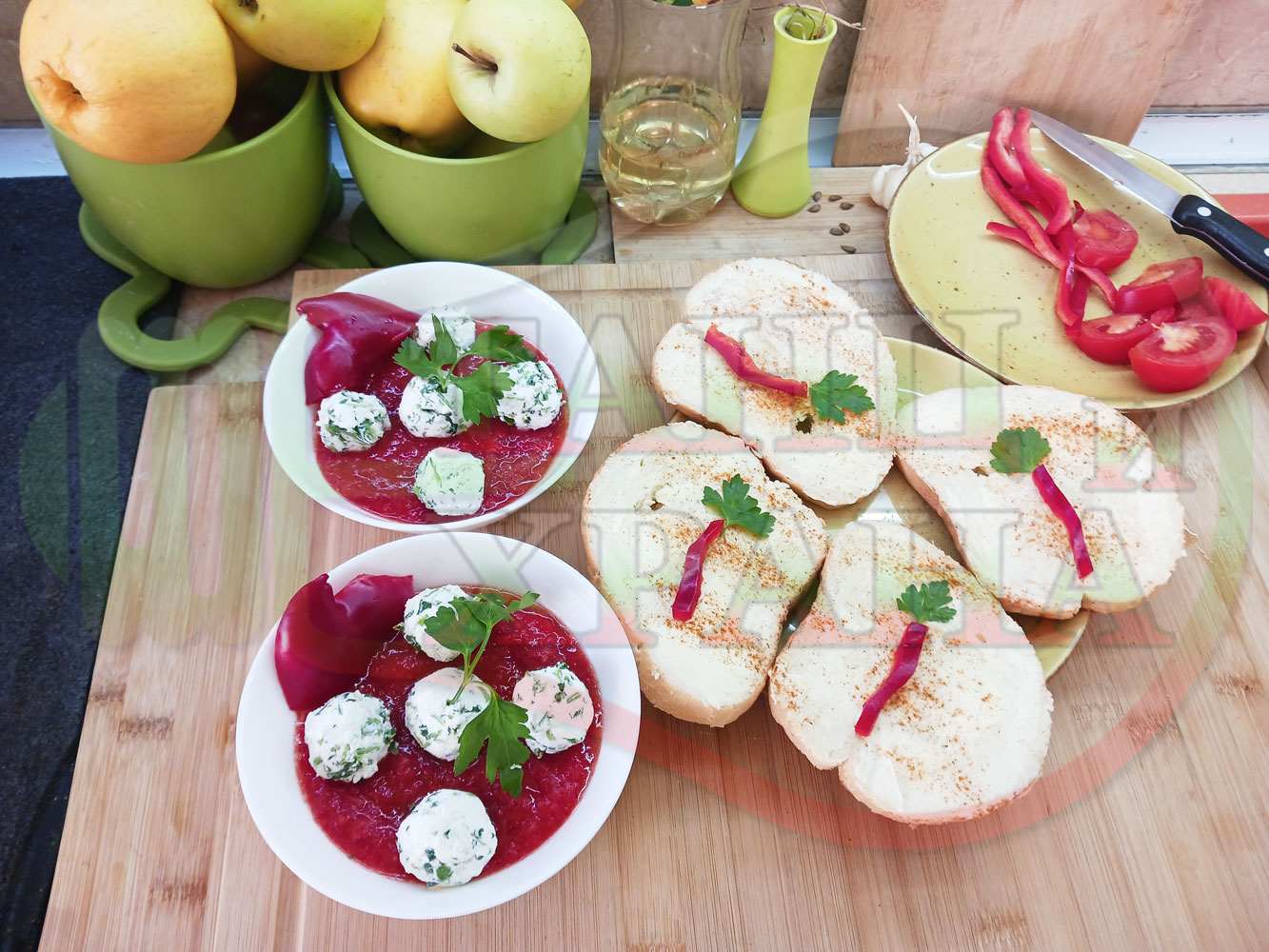Българска сурова супа "Доматеночервеночушкова магданозеночеснова с БГсирене" приготвена от домати и червени пресни чушки гарнирана с топчета от сиреново магданозен крем с магданоз, чесън и краве бяло сирене (българско, саламурено) - двукомпонентна
