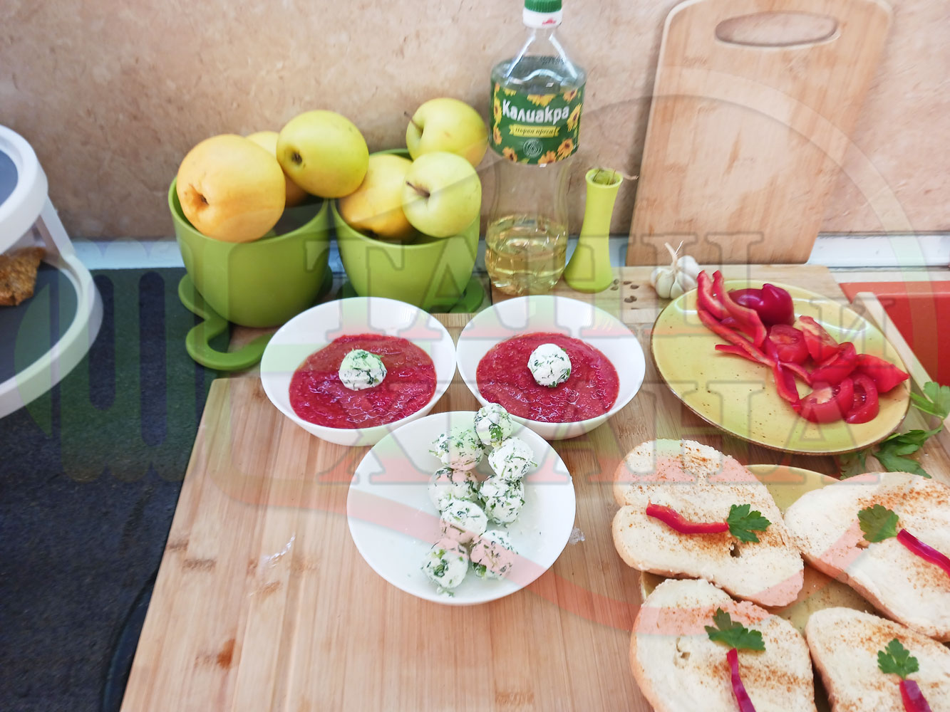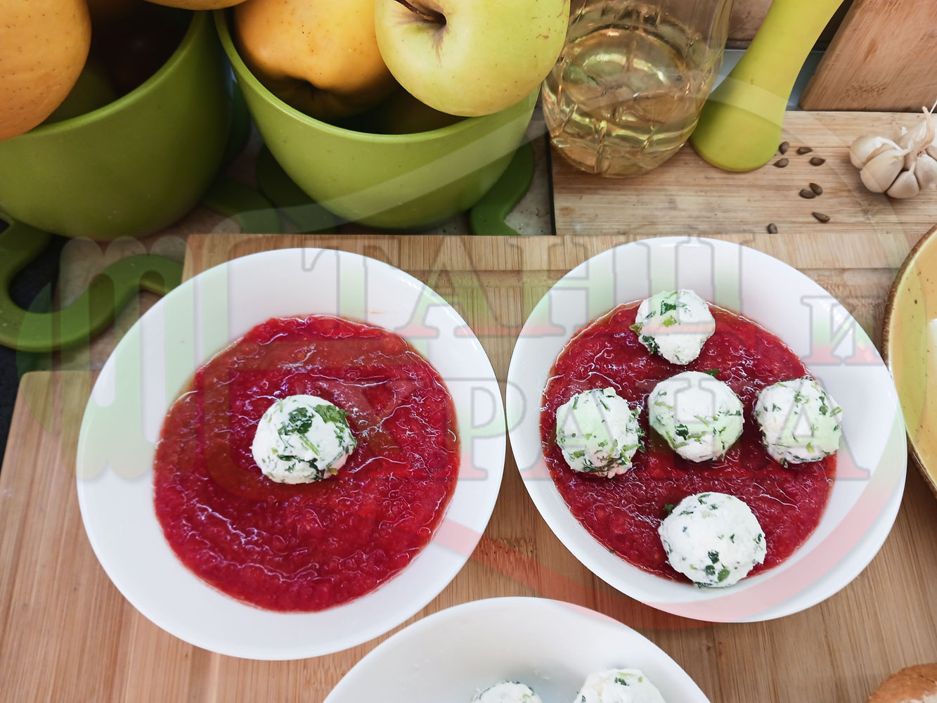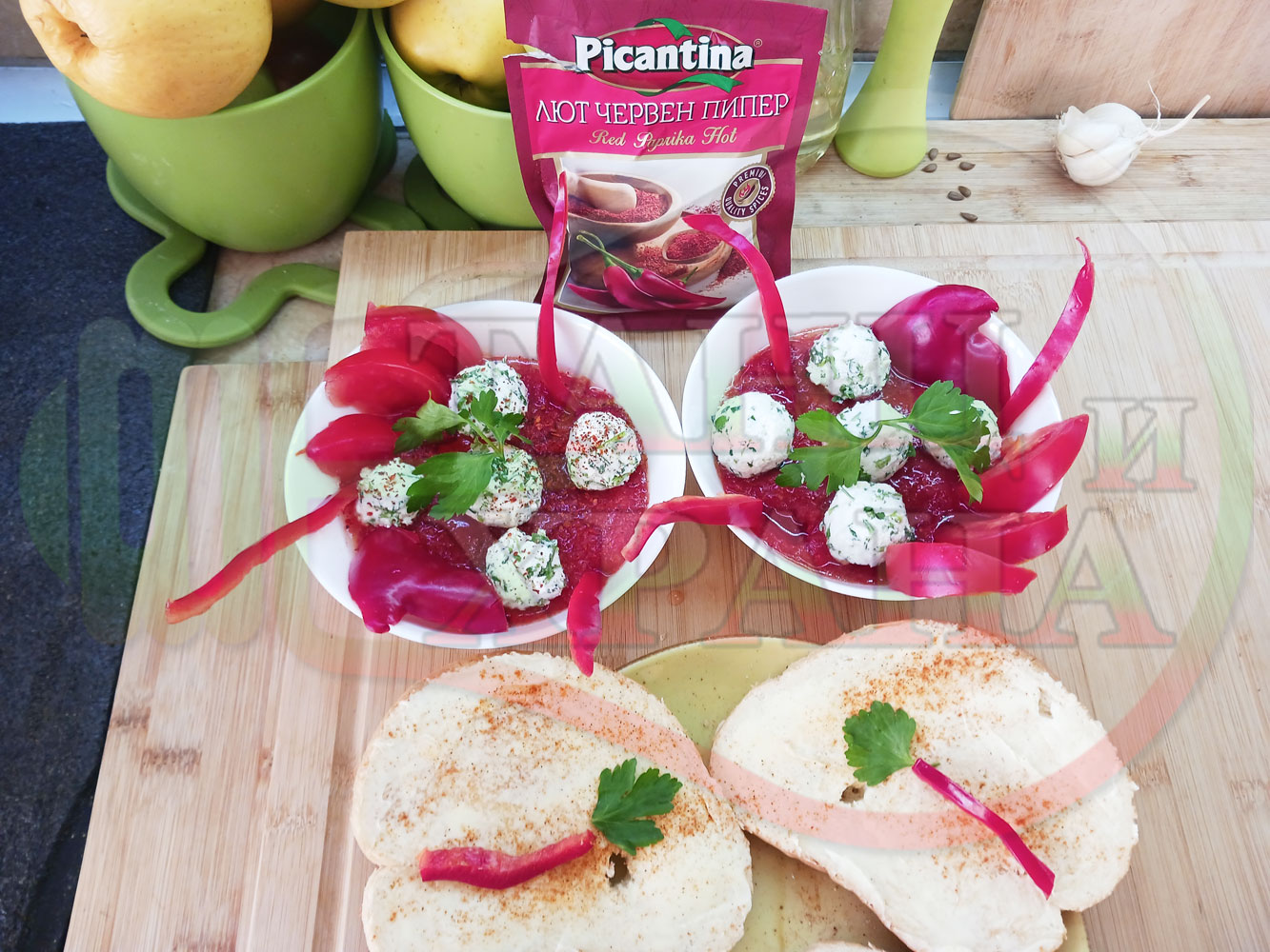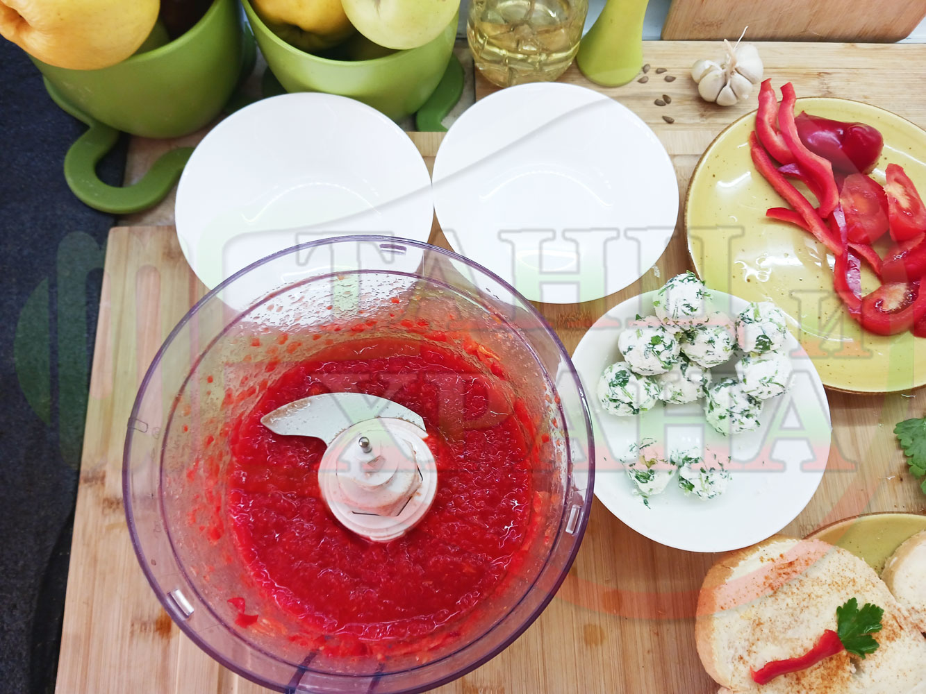 Българска сурова супа "Доматеночервеночушкова магданозеночеснова с БГсирене" приготвена от домати и червени пресни чушки гарнирана с топчета от сиреново магданозен крем с магданоз, чесън и краве бяло сирене (българско, саламурено) - двукомпонентна