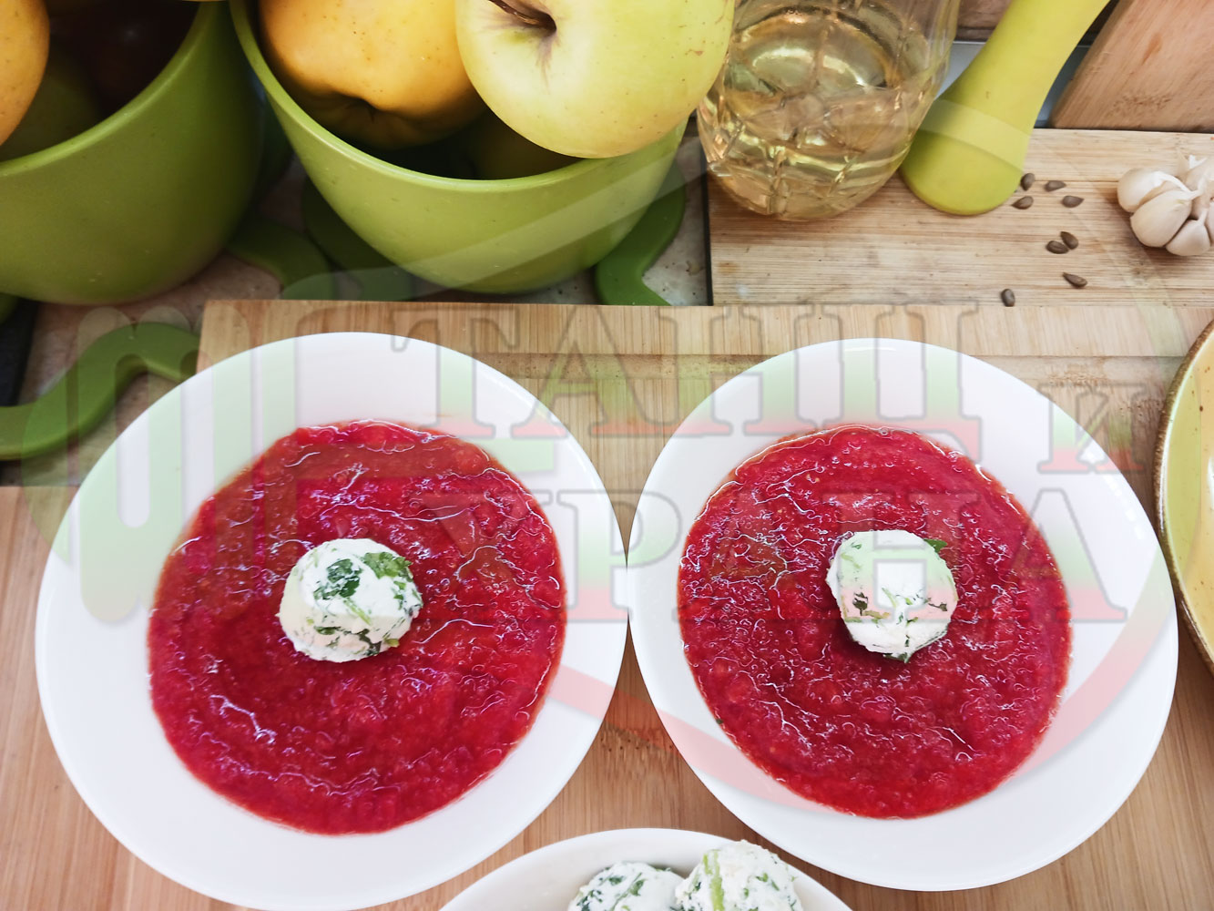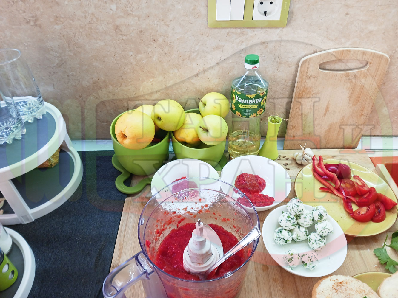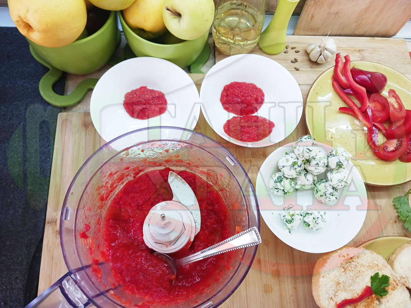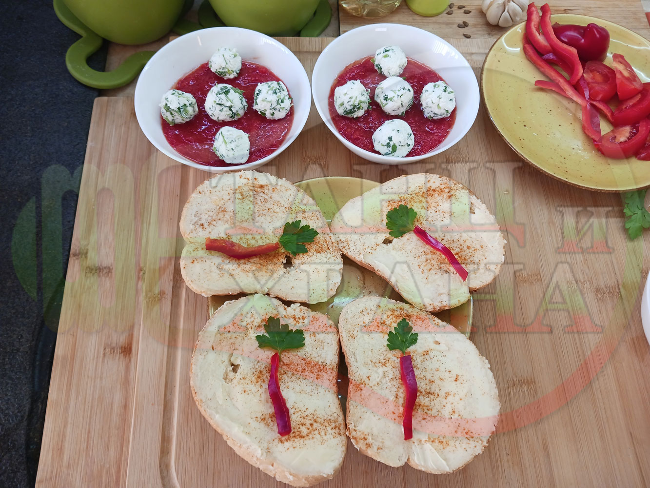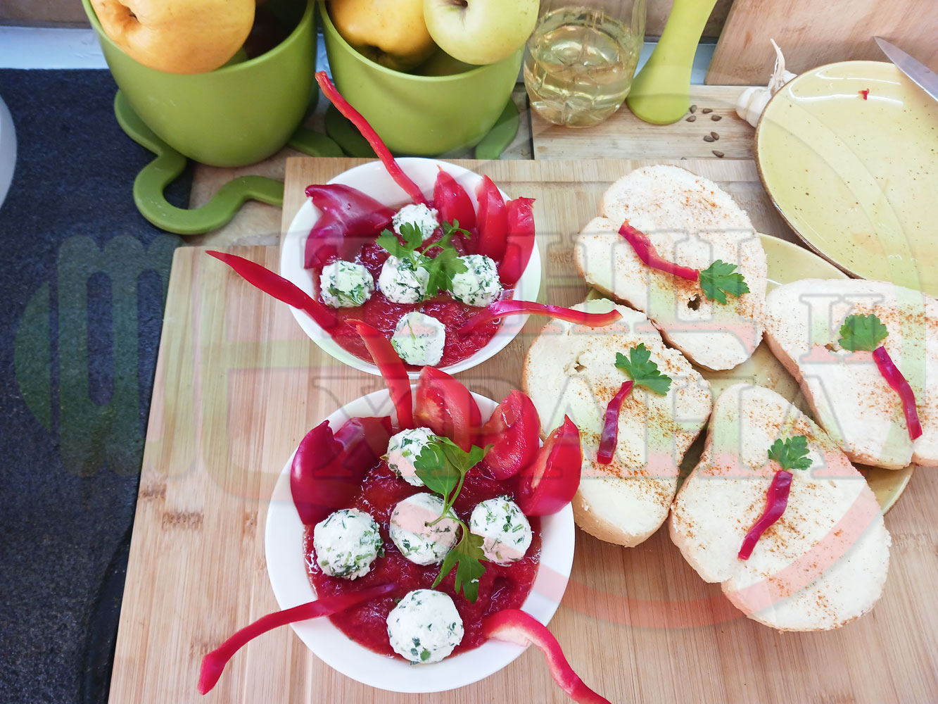Българска сурова супа "Доматеночервеночушкова магданозеночеснова с БГсирене" приготвена от домати и червени пресни чушки гарнирана с топчета от сиреново магданозен крем с магданоз, чесън и краве бяло сирене (българско, саламурено) - двукомпонентна
