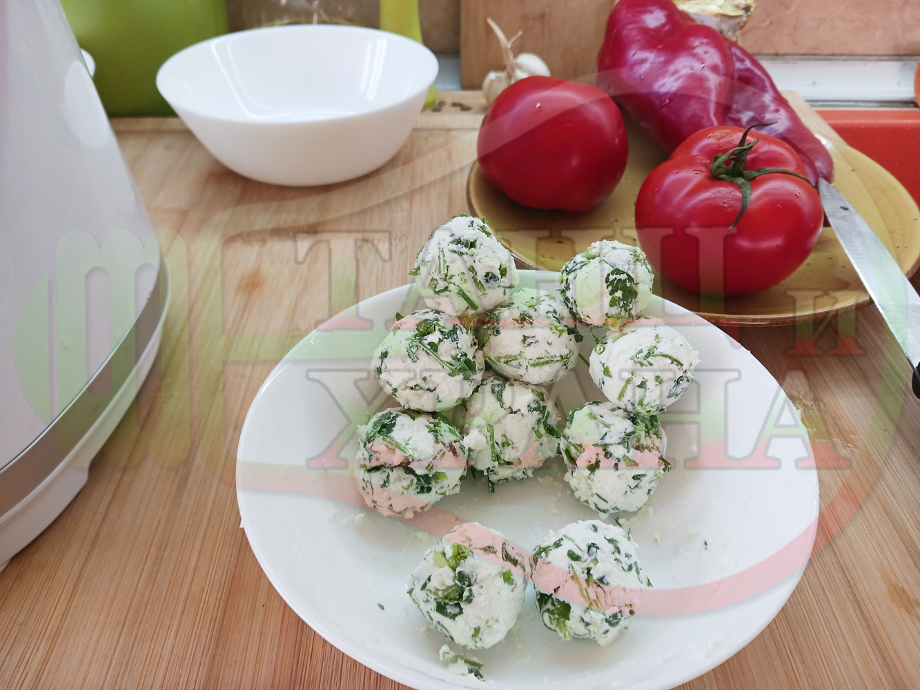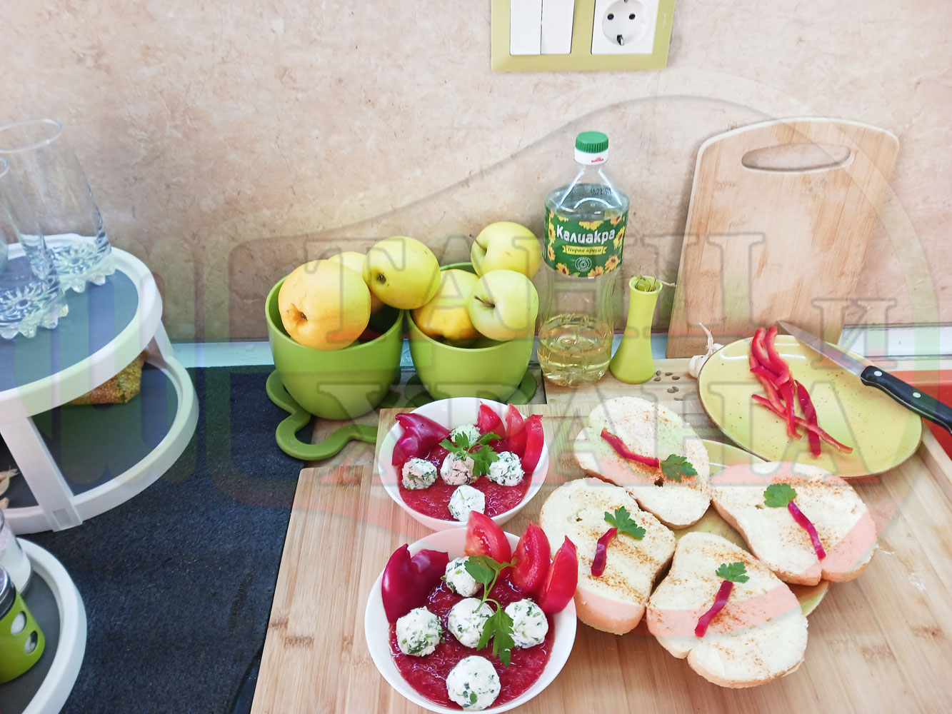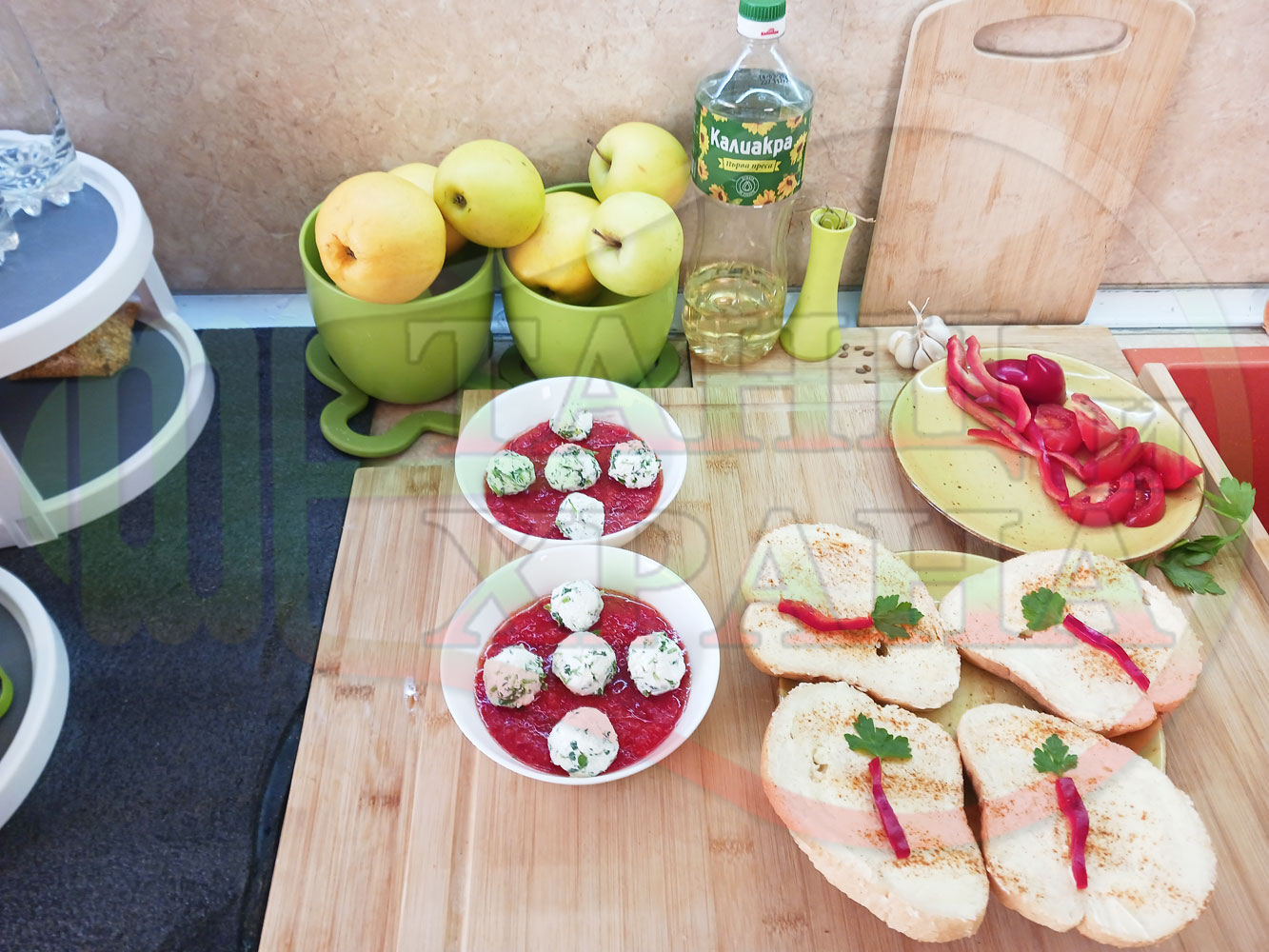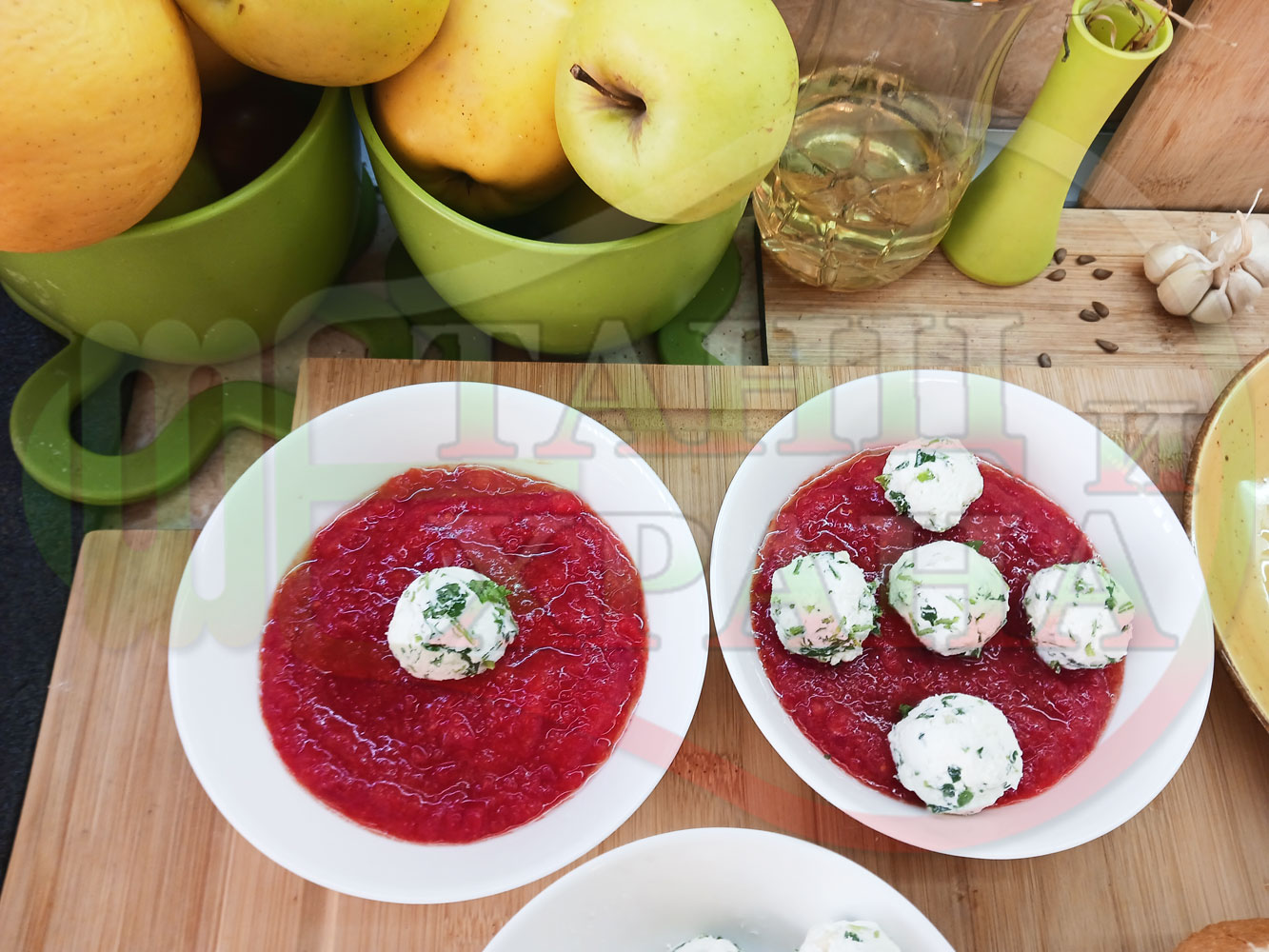 Българска сурова супа "Доматеночервеночушкова магданозеночеснова с БГсирене" приготвена от домати и червени пресни чушки гарнирана с топчета от сиреново магданозен крем с магданоз, чесън и краве бяло сирене (българско, саламурено) - двукомпонентна