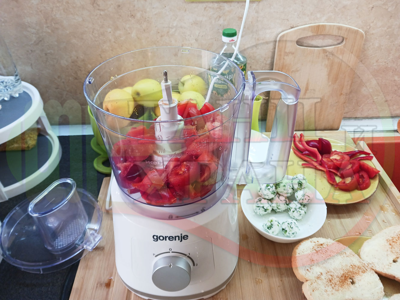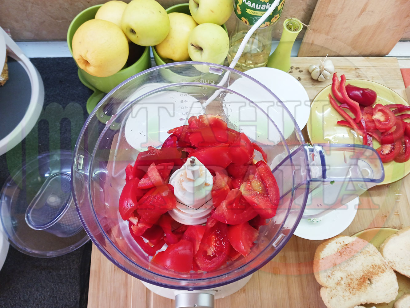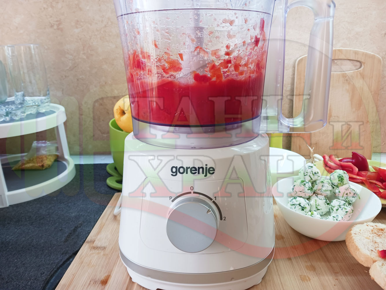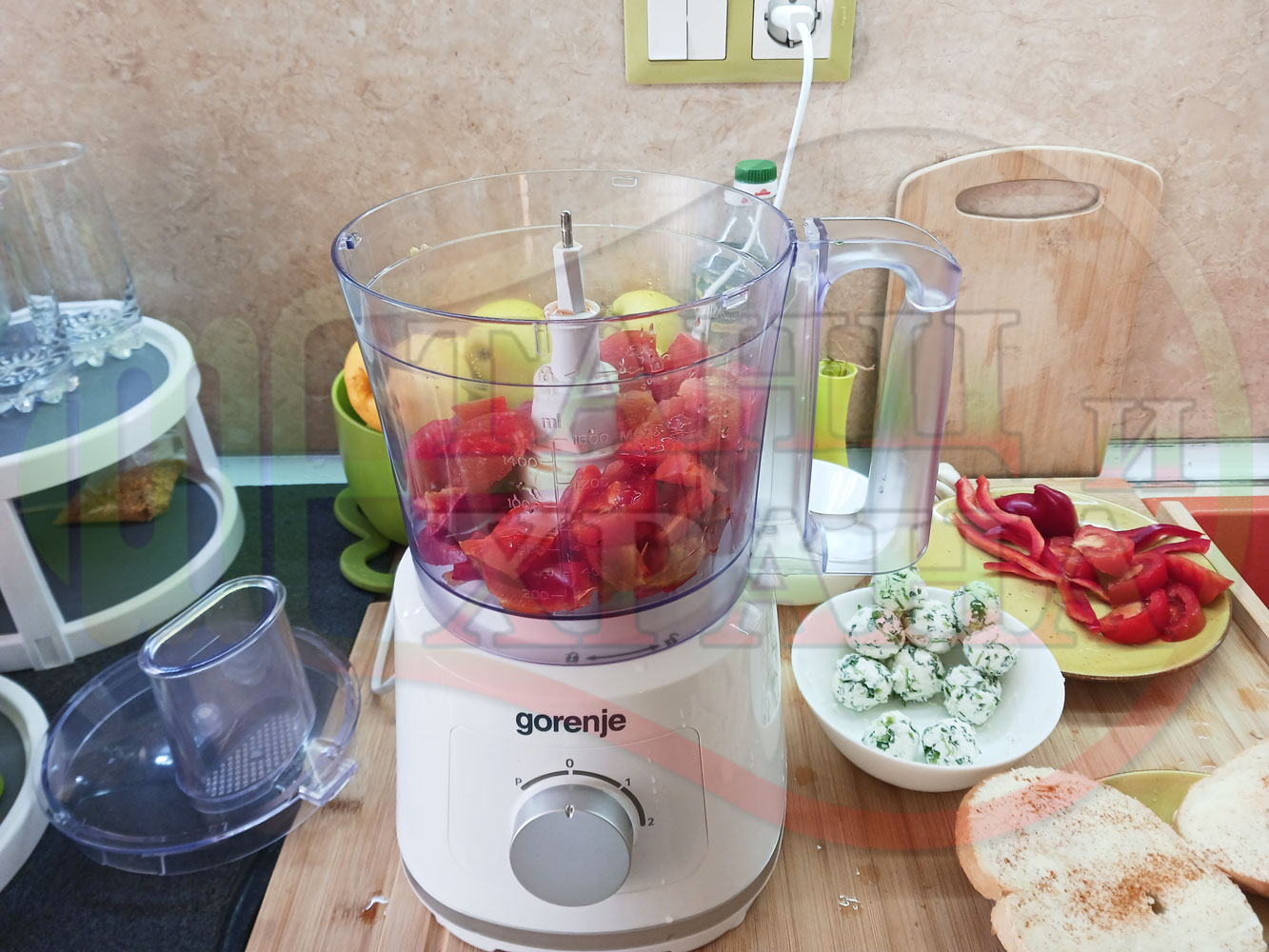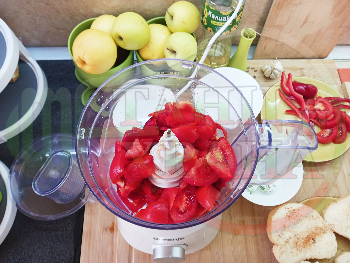 Измийте доматите и чушките, почистете ги от семките, нарежете ги на едро и ги сипете в чопър (нарежете част от доматите на резени, чушките на ивички и заделете чушковите връхчета за украса). Разбийте с чопъра продуктите за да се овкусят взаимно до образуване на средно гъста доматеночервеночушкова, хомогенизирана супа (доматена супа).