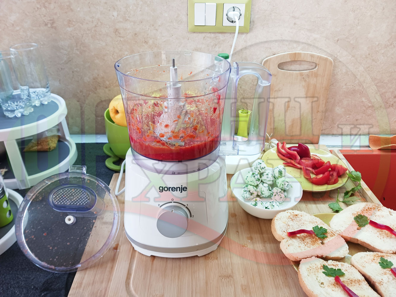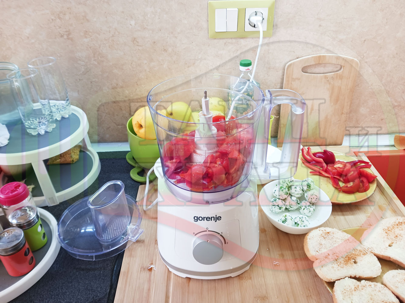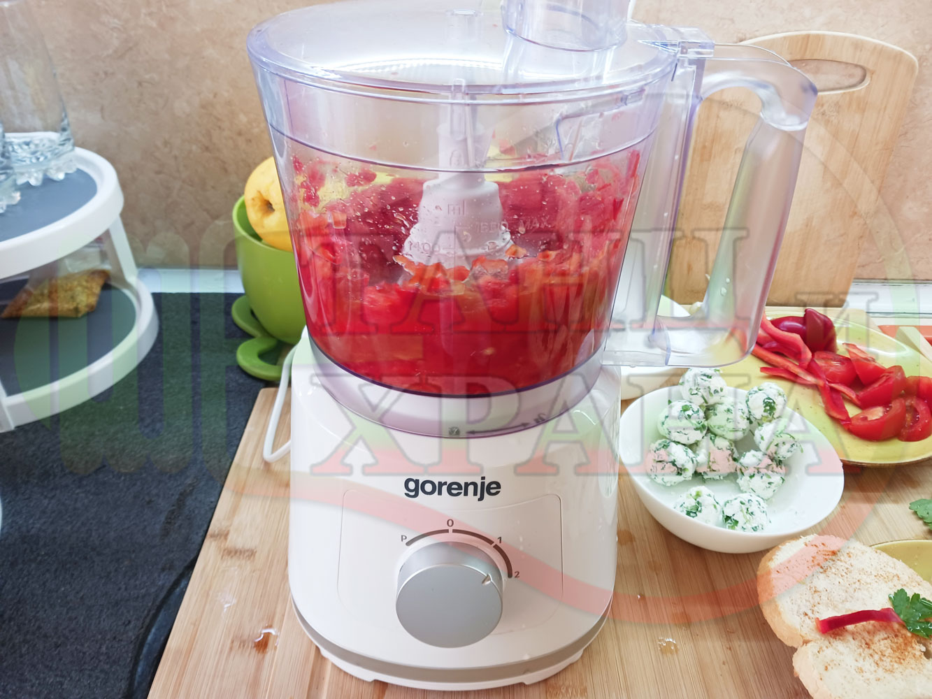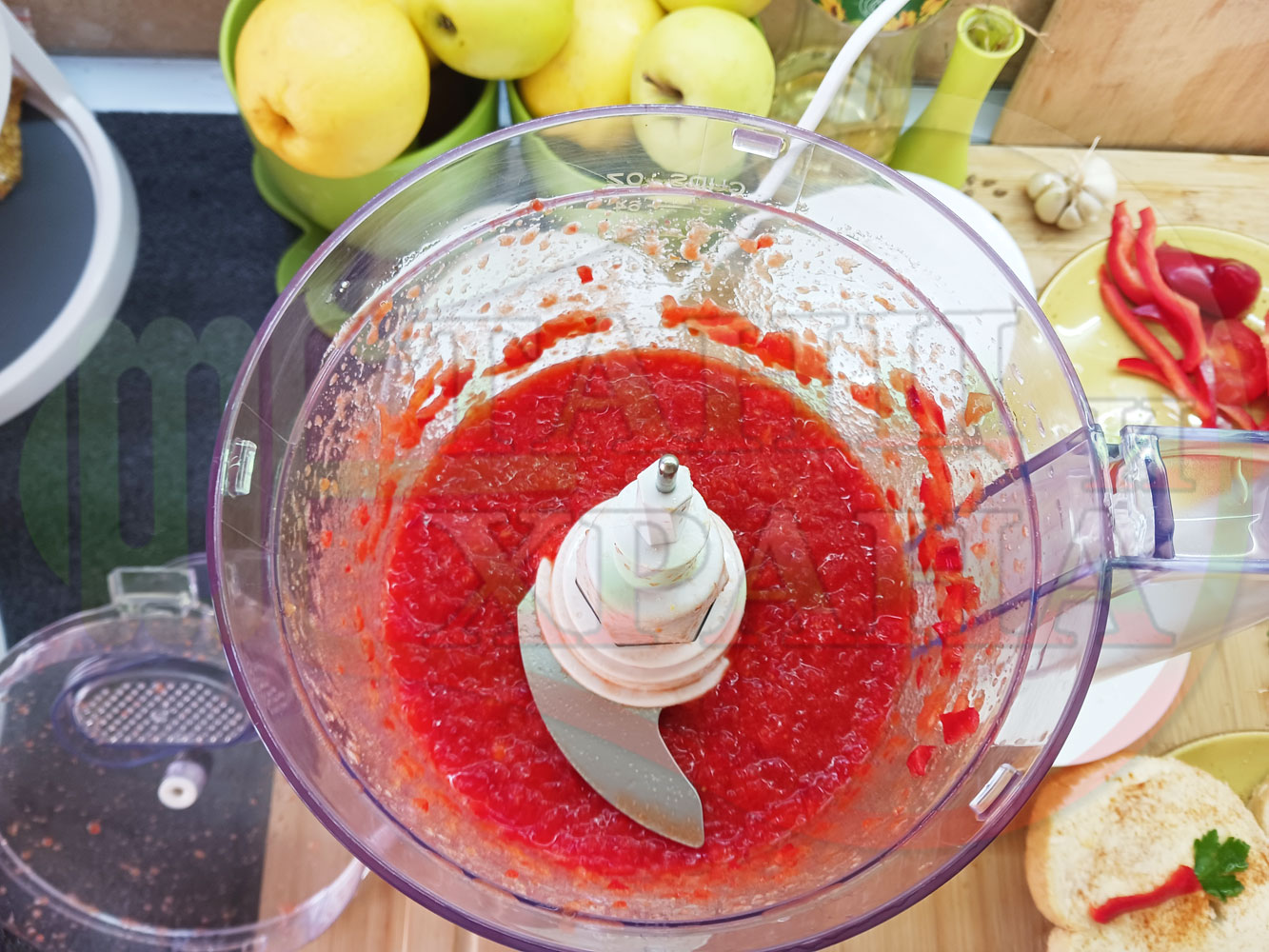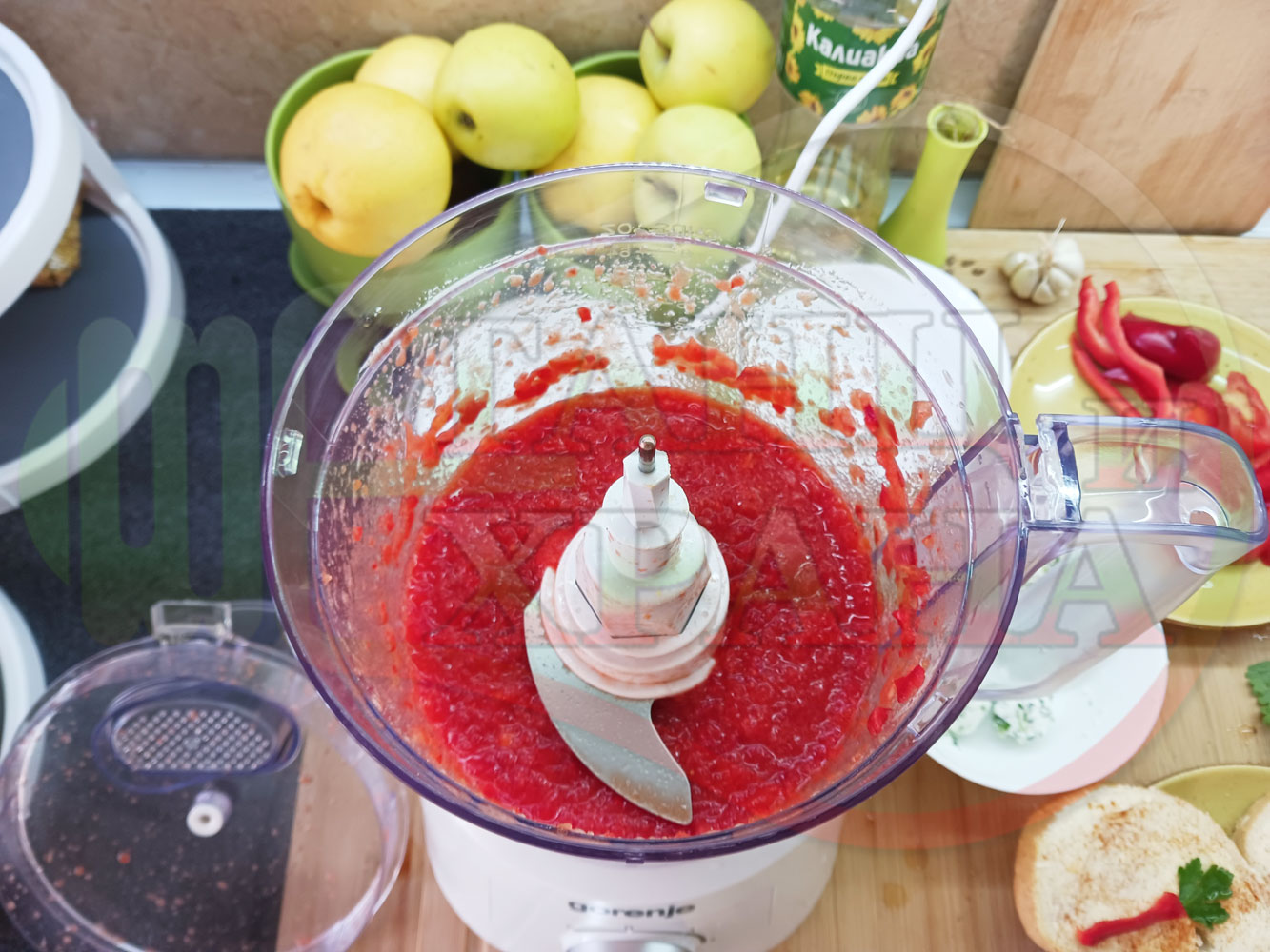 Измийте доматите и чушките, почистете ги от семките, нарежете ги на едро и ги сипете в чопър (нарежете част от доматите на резени, чушките на ивички и заделете чушковите връхчета за украса). Разбийте с чопъра продуктите за да се овкусят взаимно до образуване на средно гъста доматеночервеночушкова, хомогенизирана супа (доматена супа).