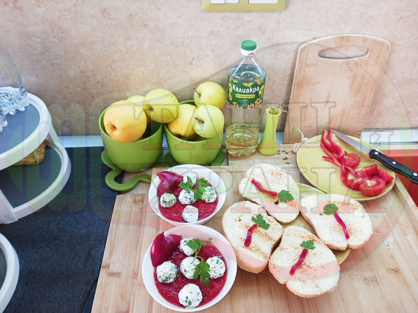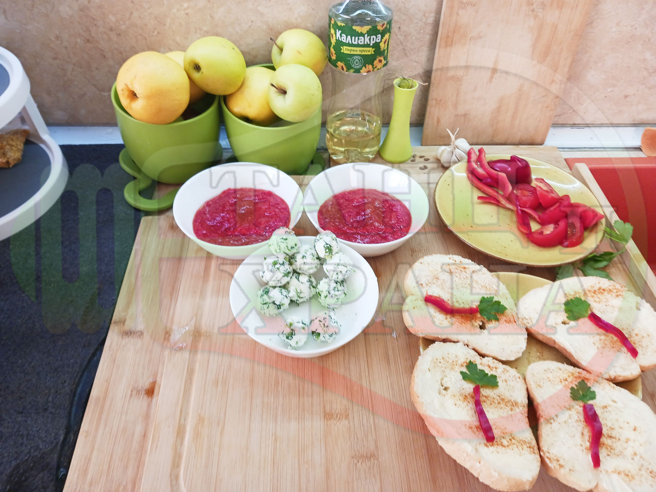 Българската доматена сурова, студена супа, която сътворих се оказа доста вкусна и се спретва буквално за "нула" време с чопър. Гарнирах супата с топчета от сиреново магданозен крем приготвени с българско краве бяло саламурено сирене, стар чесън и свеж магданоз и се получи най-вкусната сурова супа, която сме хапвали (поредната най-вкусна сурова супа (всичките сурови супи са вкусни по свой си начин според продуктите, които са включени в тях)). Двукомпонентността на супите (в голямата си част са авторски с иновативен метод на представяне и комбиниране на продуктите (прилагам метода на двукомпонентността в почти всички видове ястия, които приготвям)), позволява да се комбинират различни сурови и/или запечени продукти, с което осъвременявам и обогатявам традиционни български вкусове за приготвянето на супи, ястия, печива и различни гозби. Сиреновите топчета овкусяват супата с неповторимия вкус, който носят в идеална хармония с доматеночушковата и отново се получи голяма вкусно, вкусна, вкусотия (вкуснотия), която е изключително полезна, обединяваща млечните протеини от българското краве бяло сирене, минерали и микроелементи с богатството от полезни съставки на доматите, чушките, чесъна и свежия магданоз. ![]()