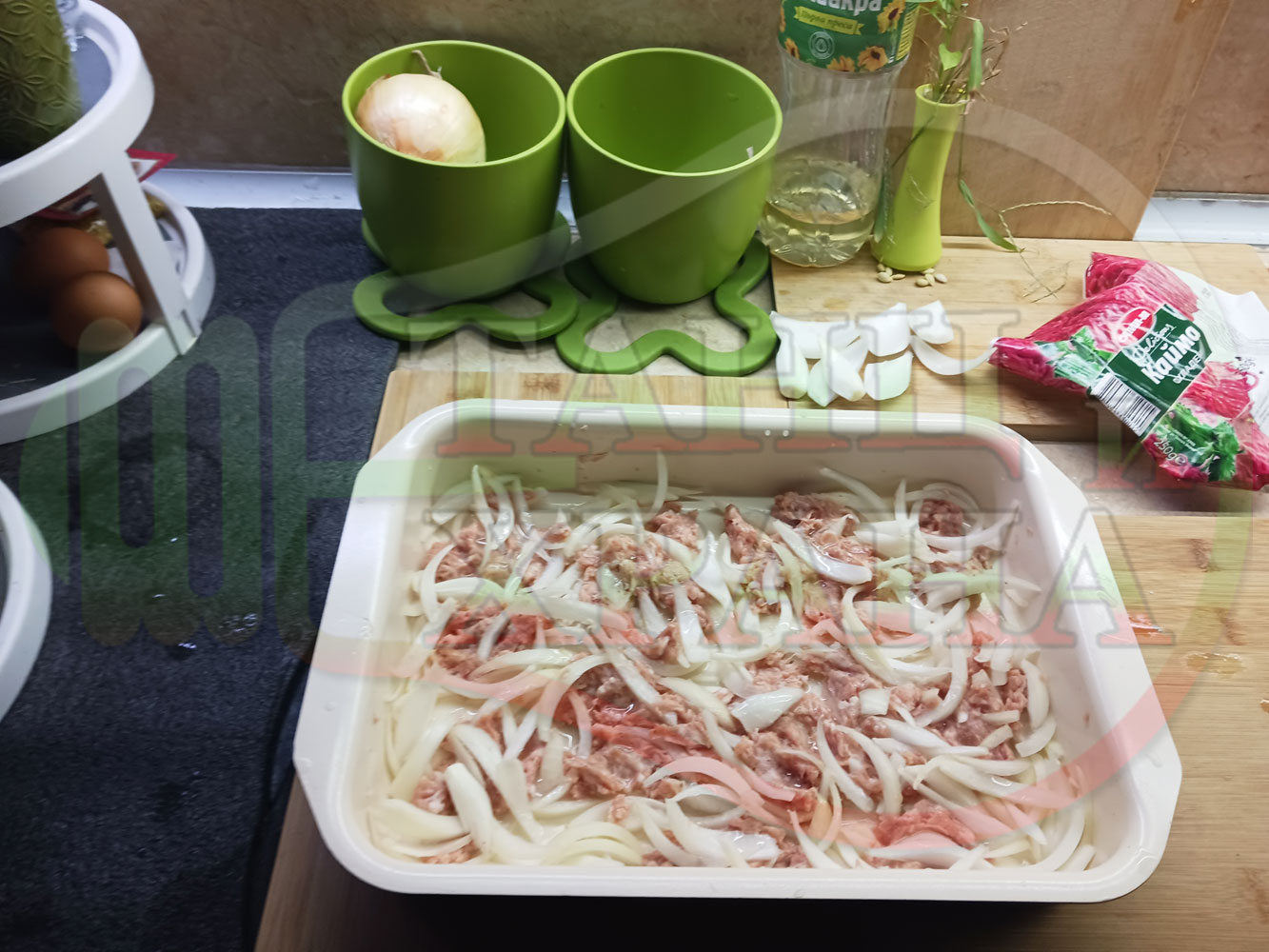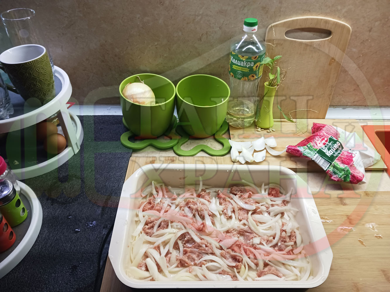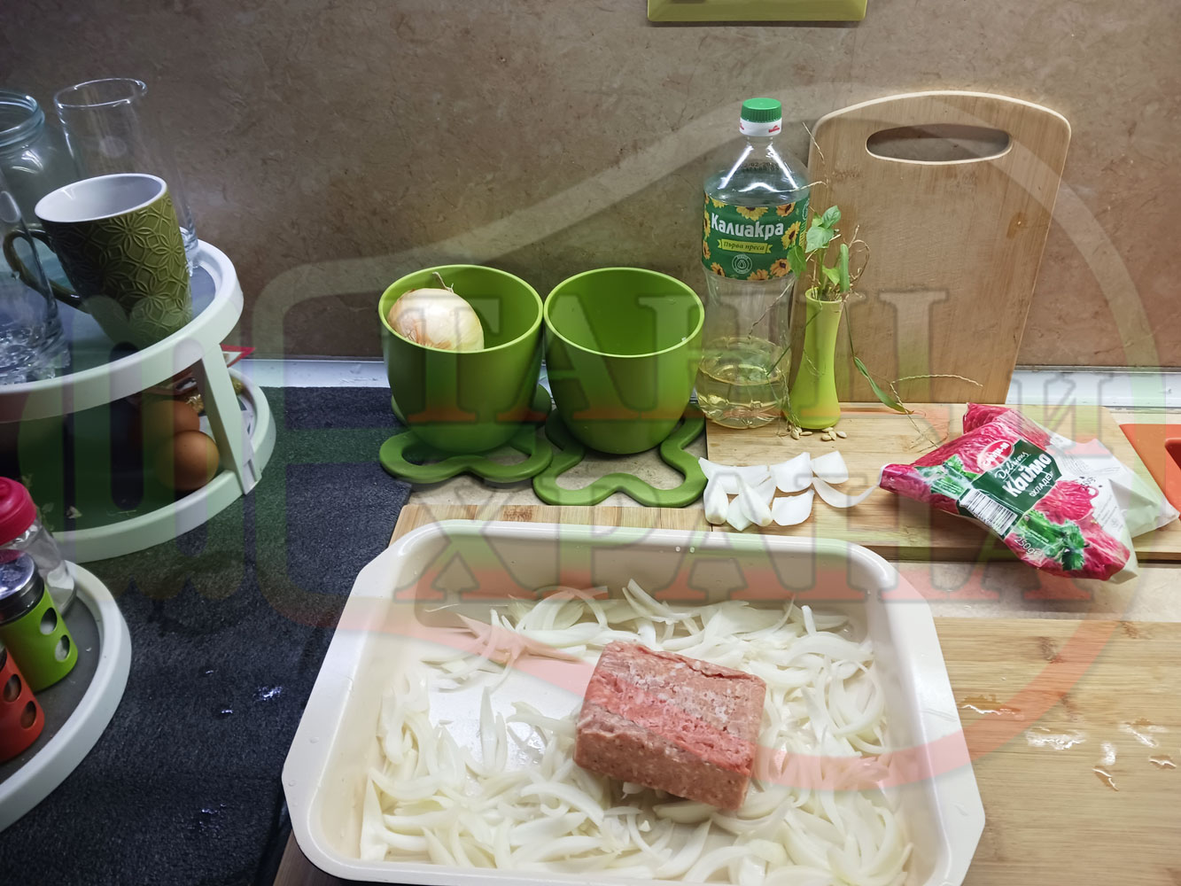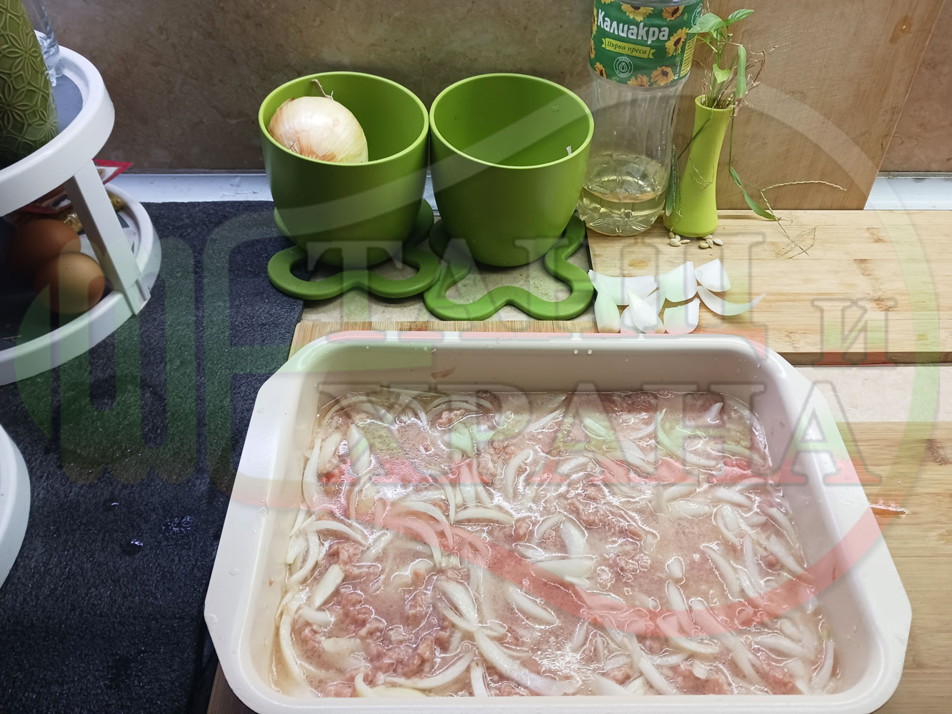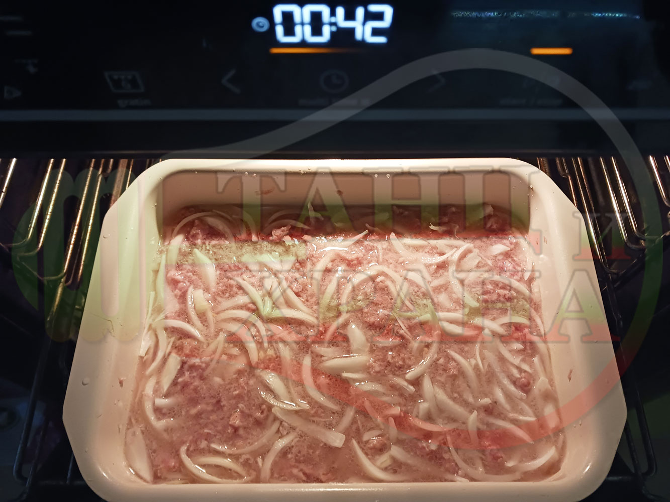 Обелeте, измийте, нарежете лука на ивички и го сипете в тава за печене (запазете вътрешната част на лука за украса). Добавете каймата, размесете я с лука, сипете слънчогледовото олио и солта и налейте топла към гореща вода от чешмата. Разбъркайте и поставете тавата в предварително загрятата фурна (загрейте я за поне 5 минути). Сварете и запечете на фурна без вентилатор на 180 градуса за около 60 минути.