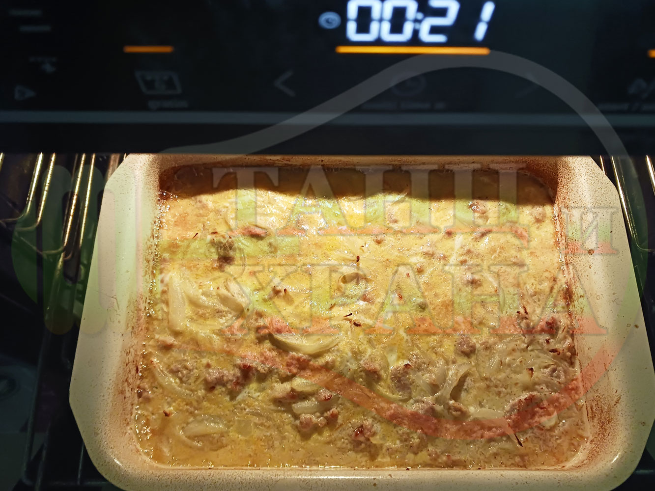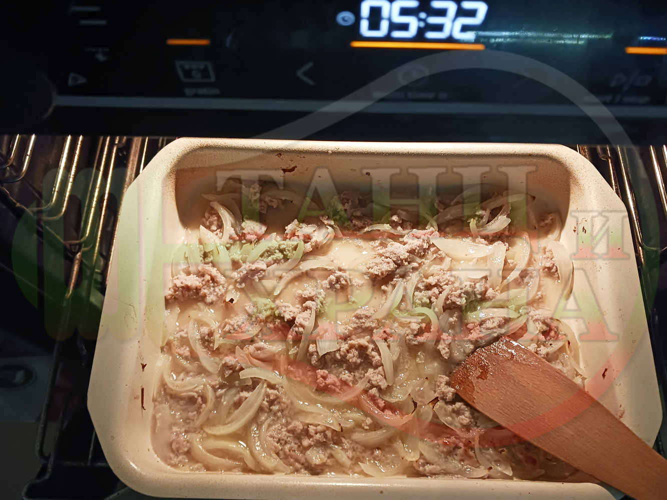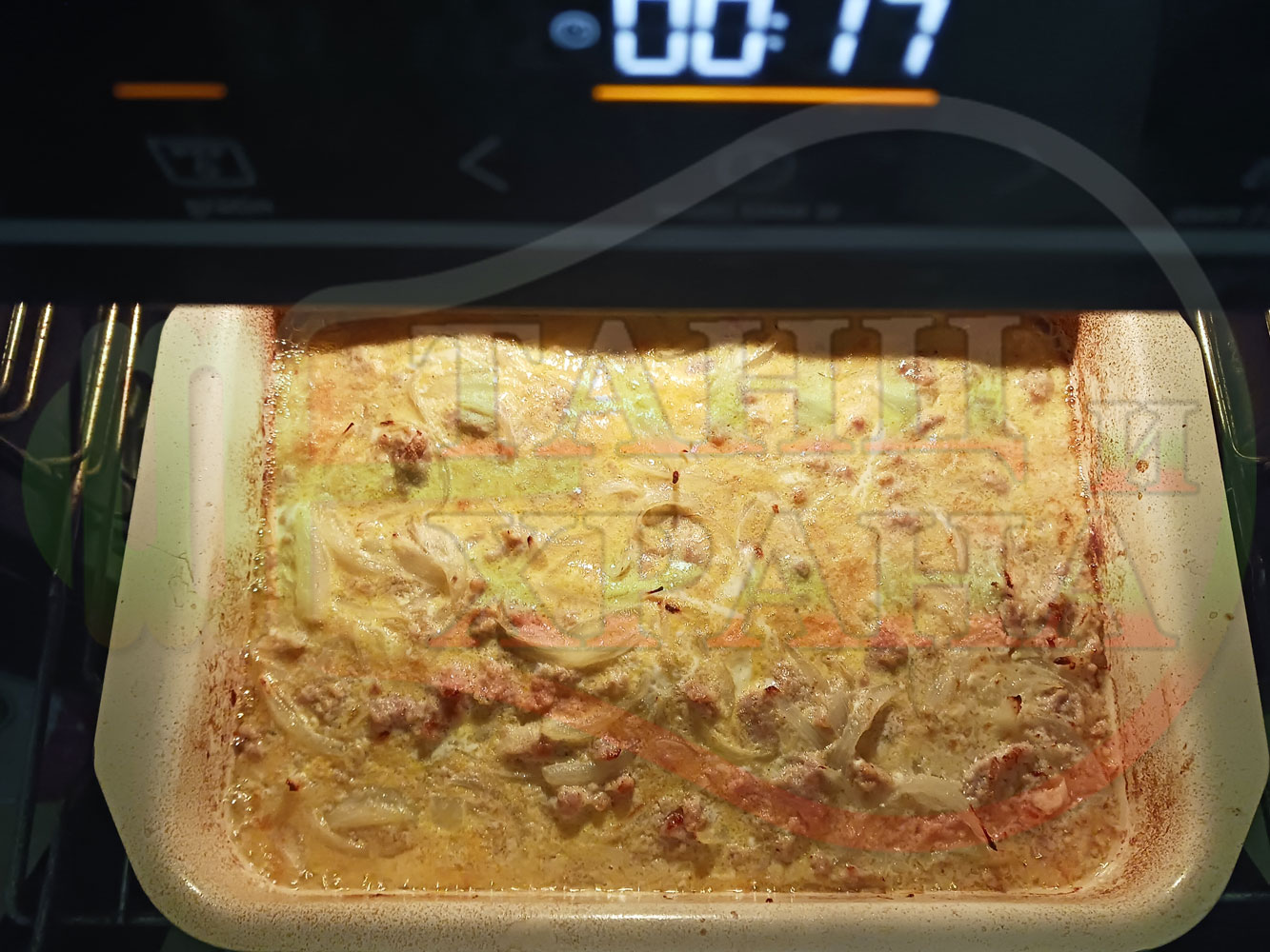 Добавете яйцата около 15 минути преди края на зададеното време и дозапечете до желаната от вас степен (златисто запечени или по-препечени лук, кайма и яйца).