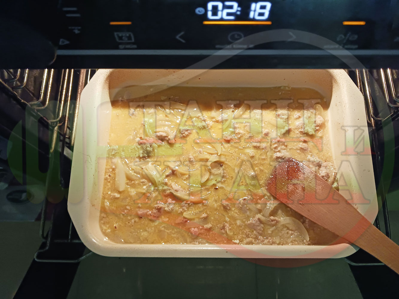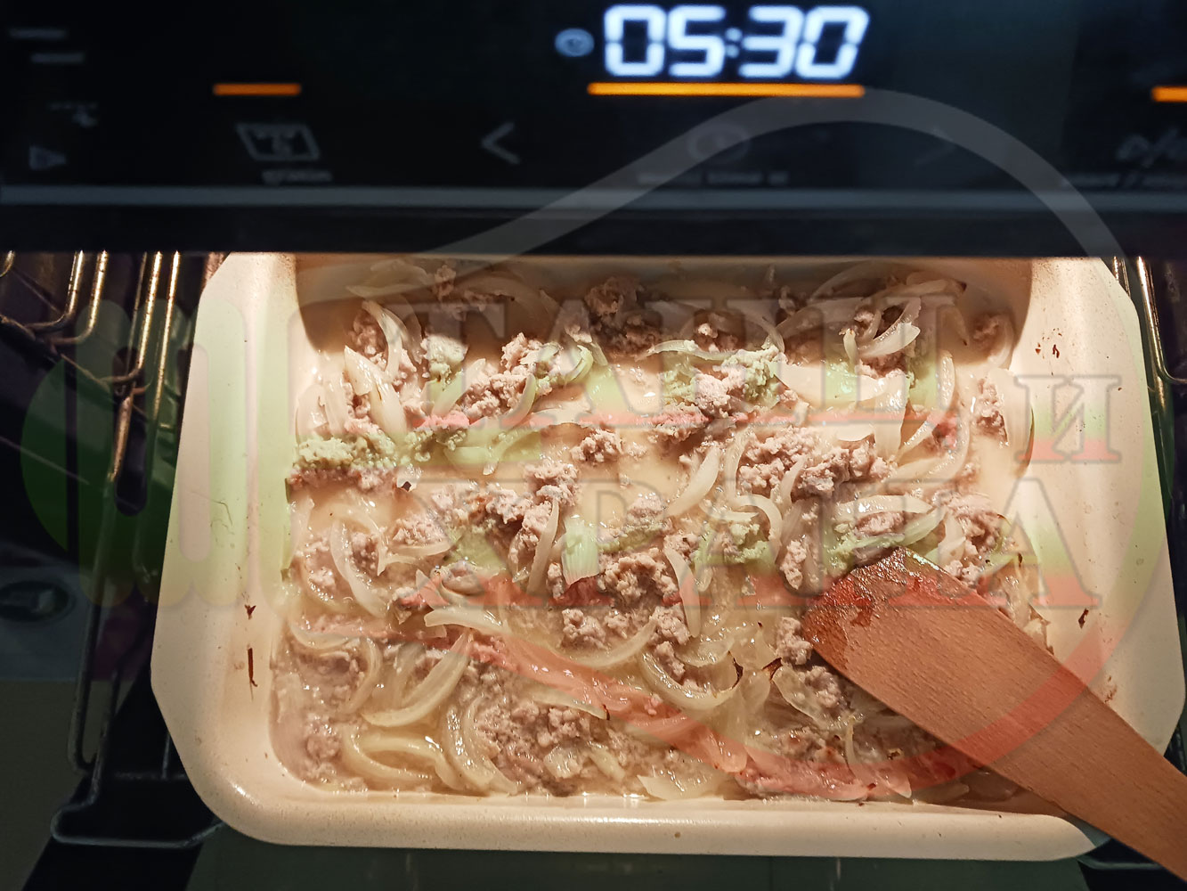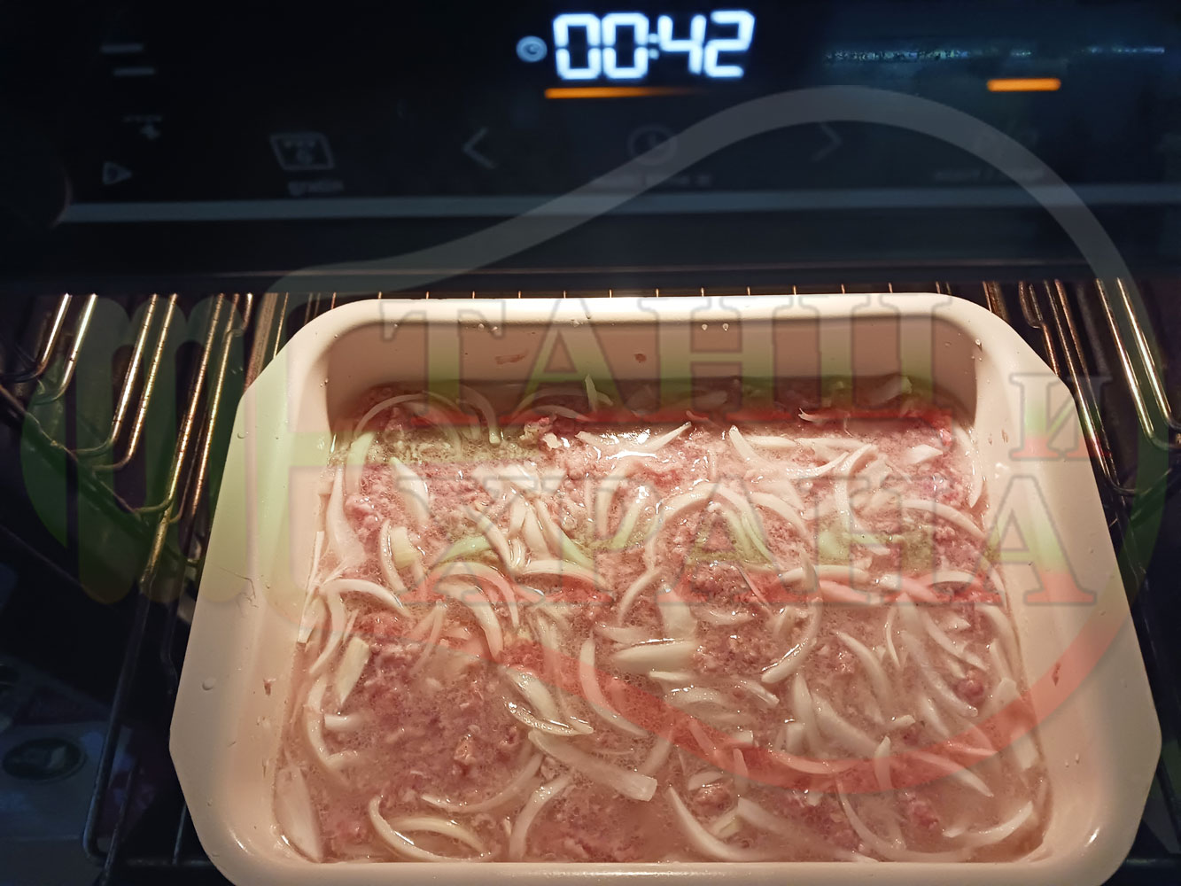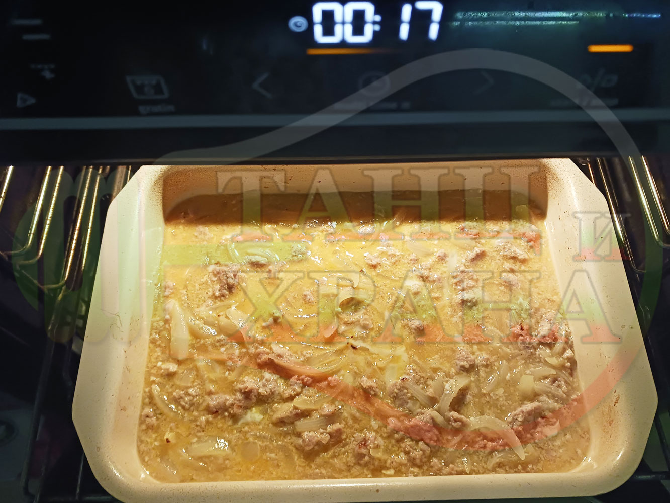 Добавете яйцата около 15 минути преди края на зададеното време и дозапечете до желаната от вас степен (златисто запечени или по-препечени лук, кайма и яйца).
