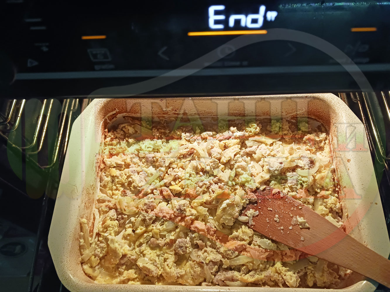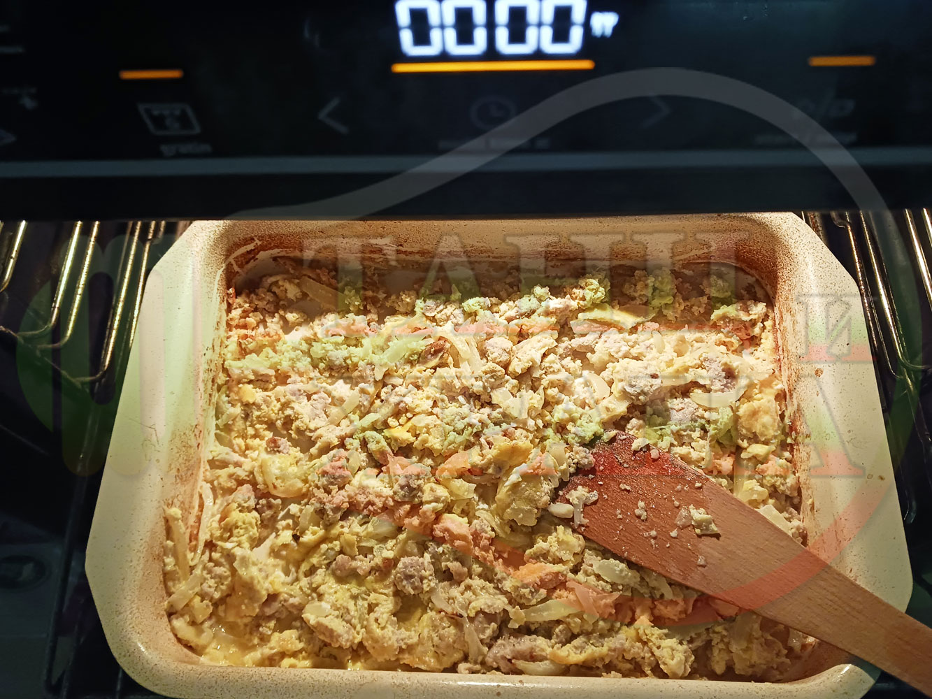 ВНИМАНИЕ: Фурните са различни и съответно времето за запичане е ориентировъчно. Наблюдавайте процеса на запичане и при необходимост, покрийте с хартия или фолио за печене. Разбърквайте често яйцата след като ги добавите за да не се "споят" и да станат на яйчена пита.