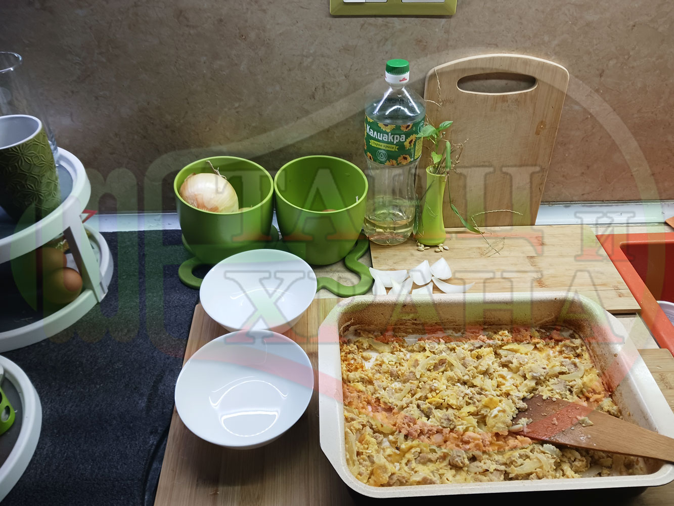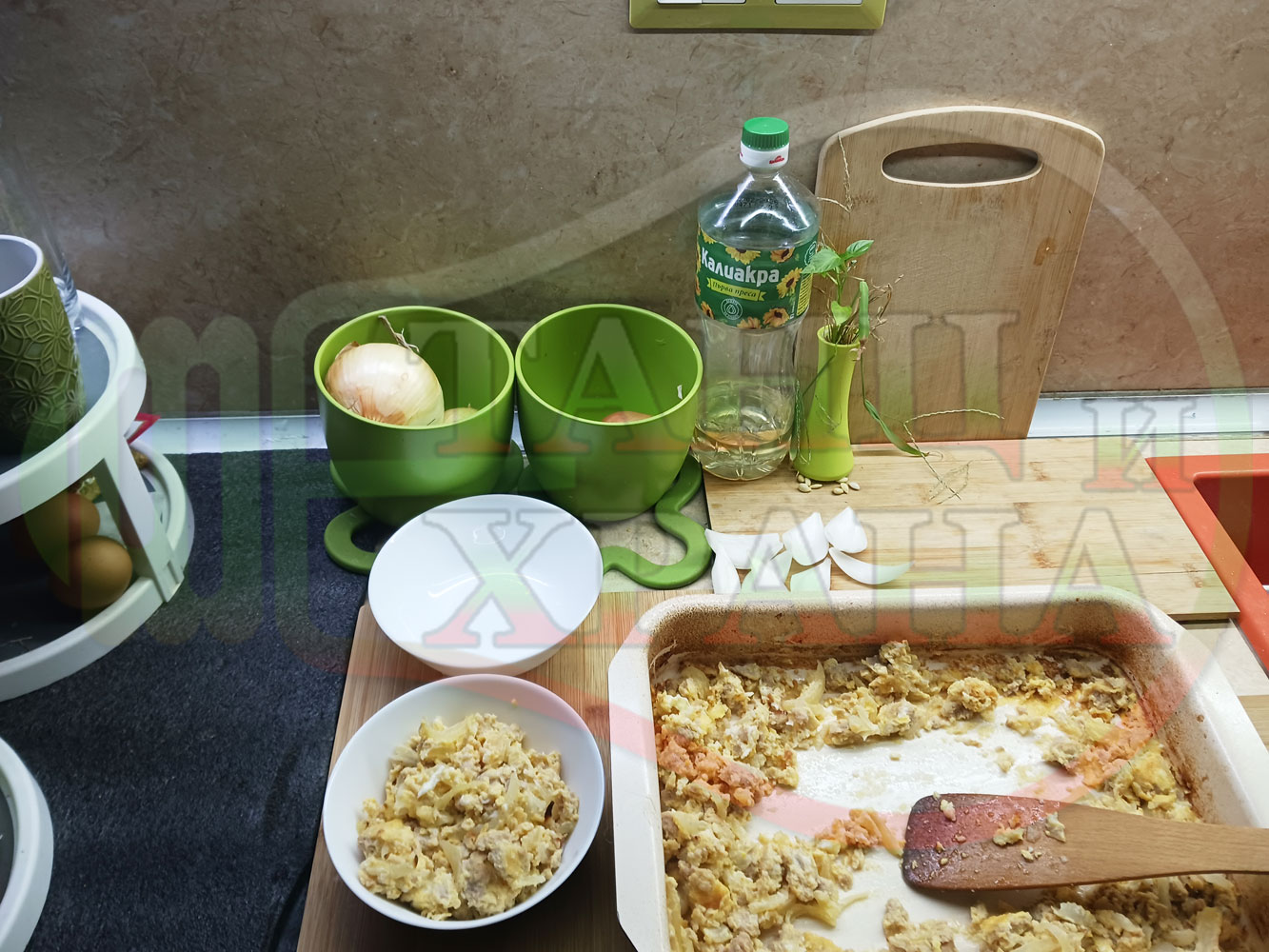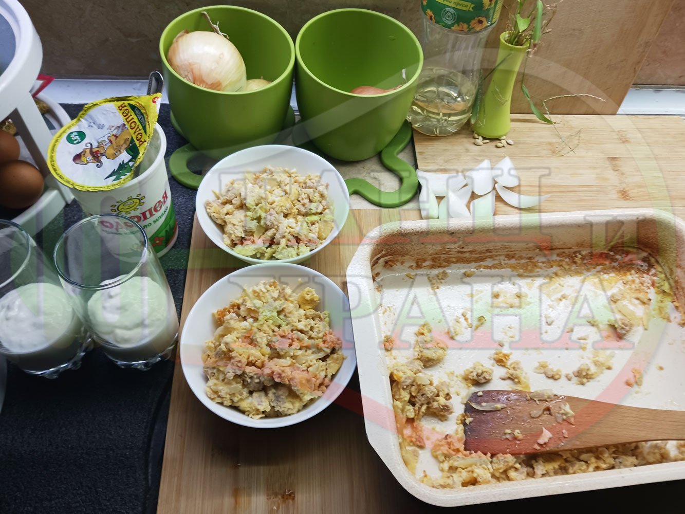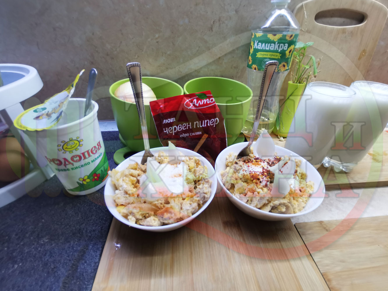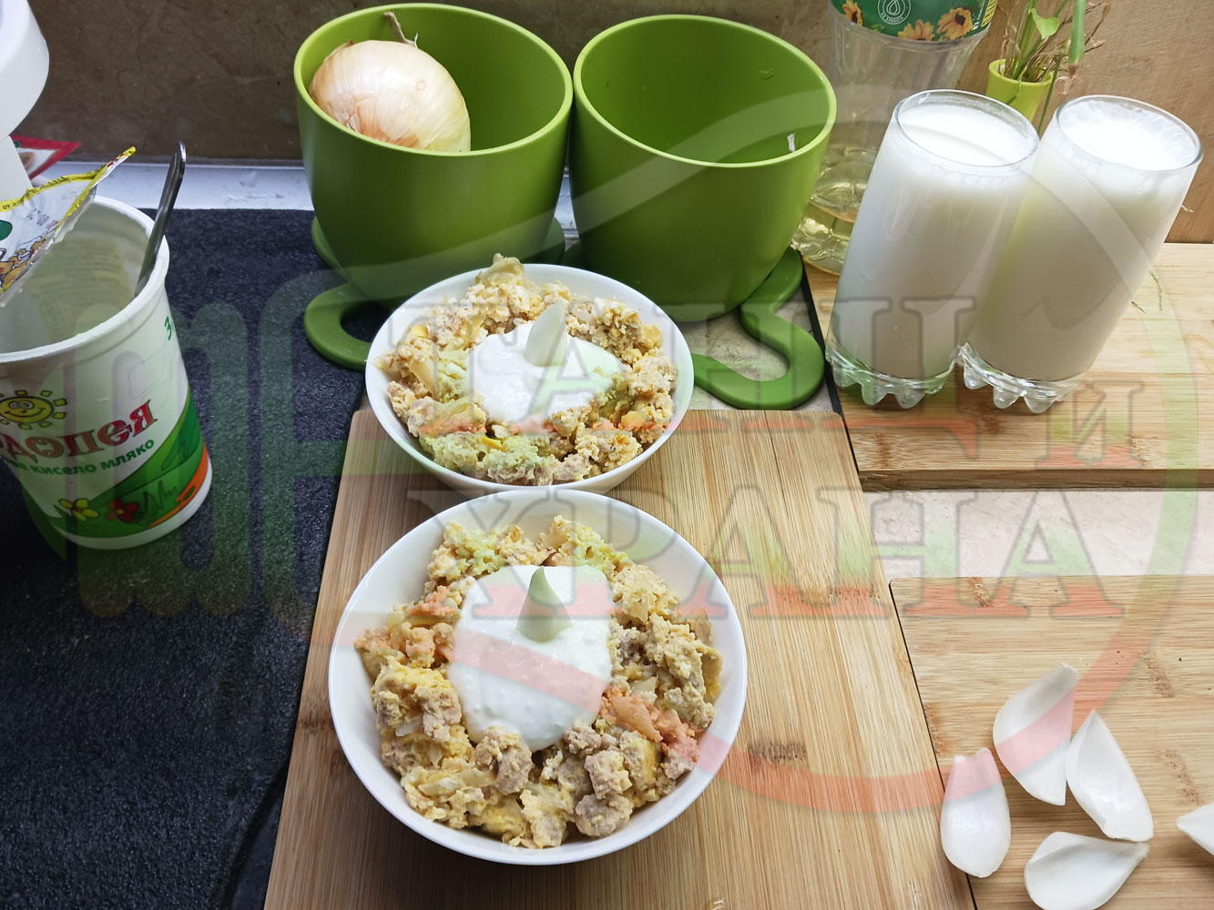Български бъркани яйца "Каймянояйчена киселомлечна бърканица" сварена и запечена на фурна с кромид лук и неовкусена кайма (смес) гарнирани с кисело мляко от България