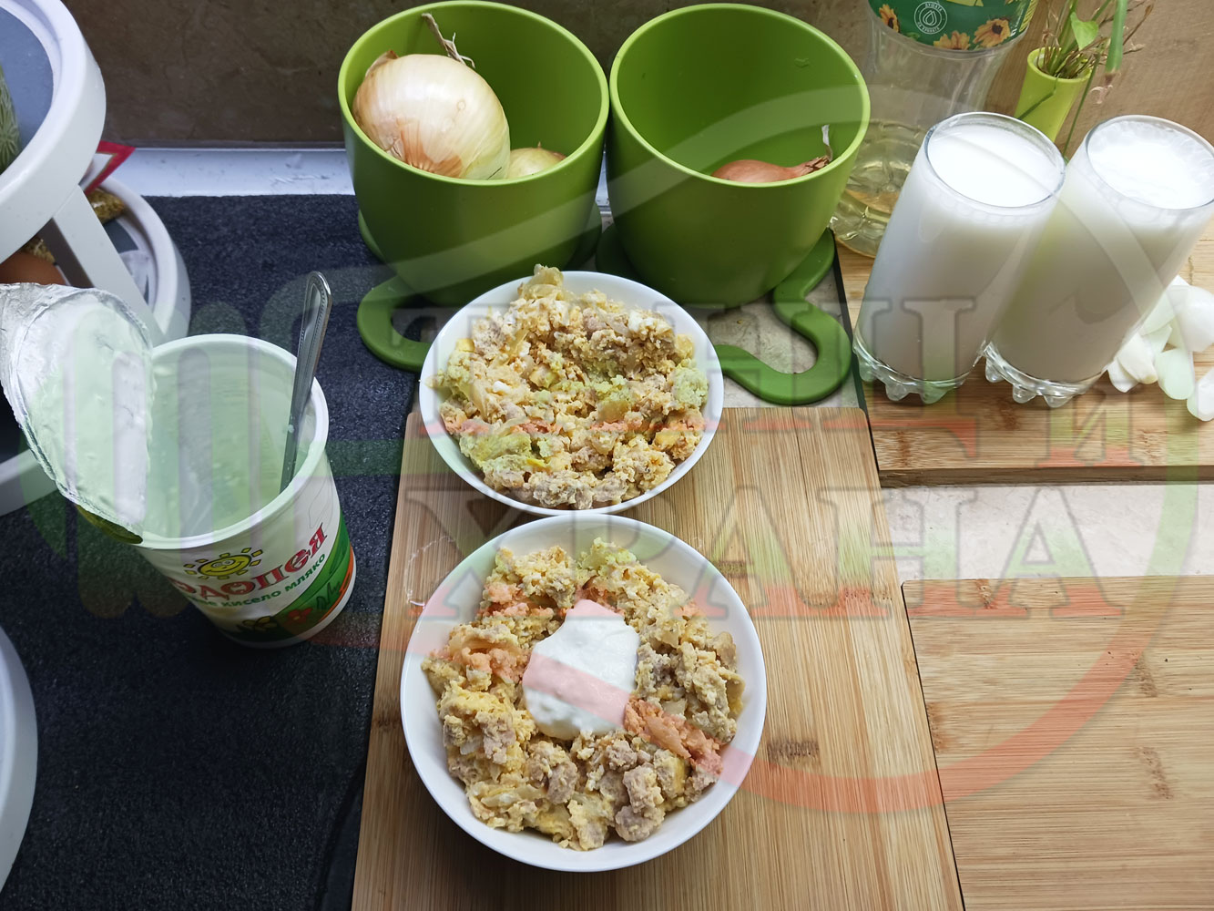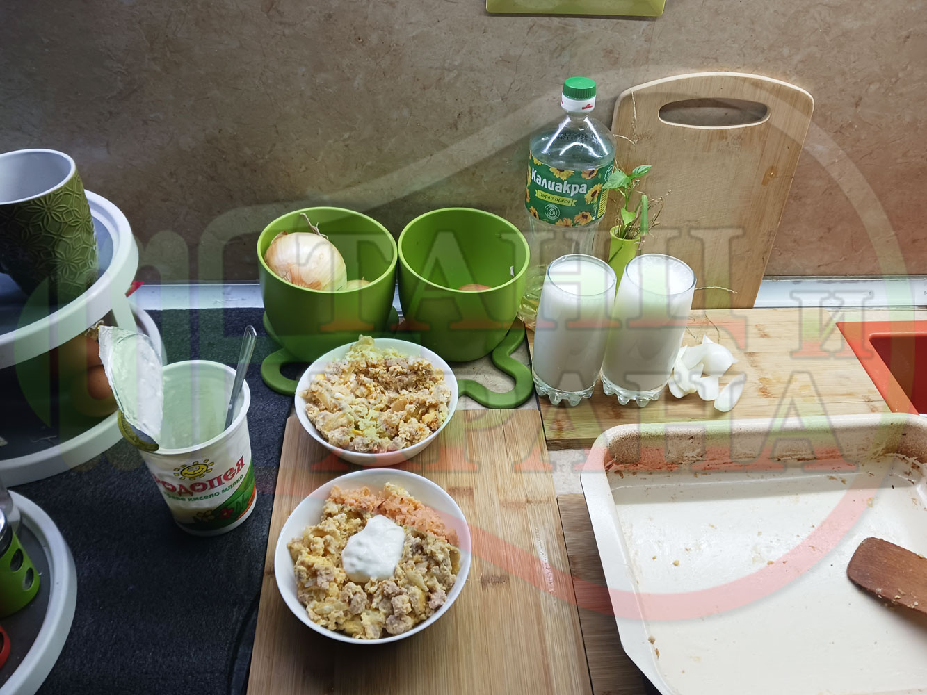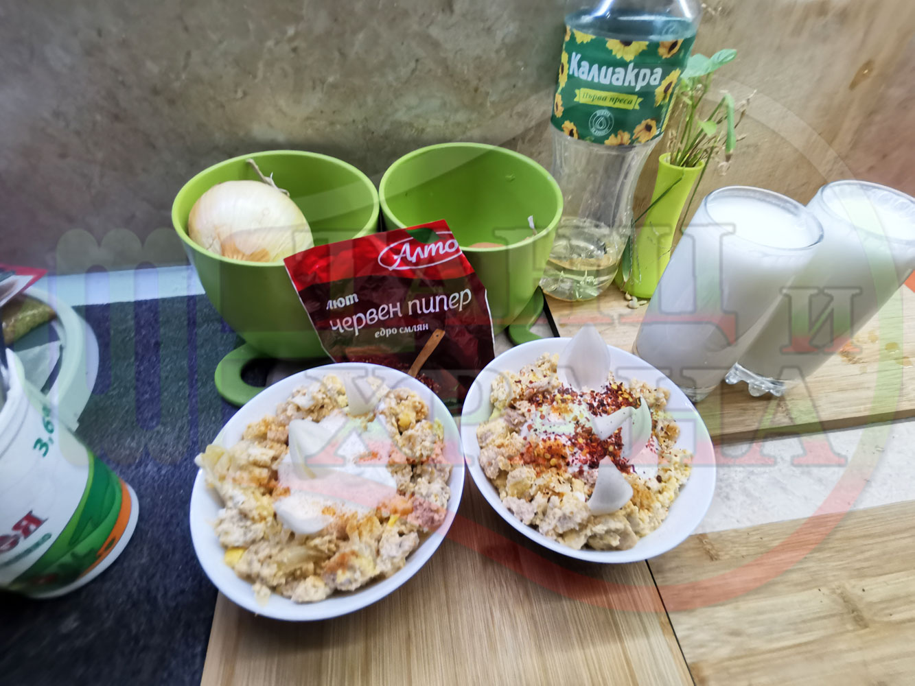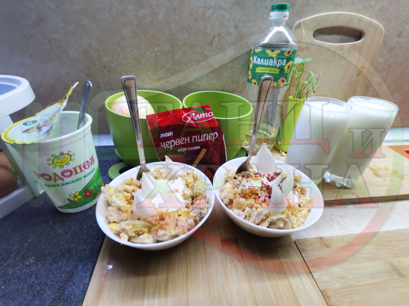 ПРОДУКТИ: Приблизителни количества за български бъркани яйца "Каймянояйчена киселомлечна бърканица" сварена и запечена на фурна с кромид лук и неовкусена кайма (смес) гарнирани с кисело мляко от България