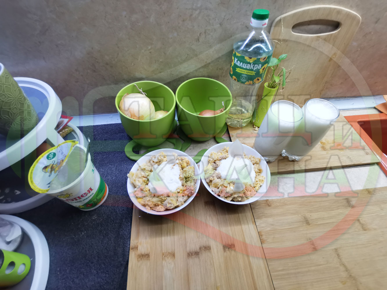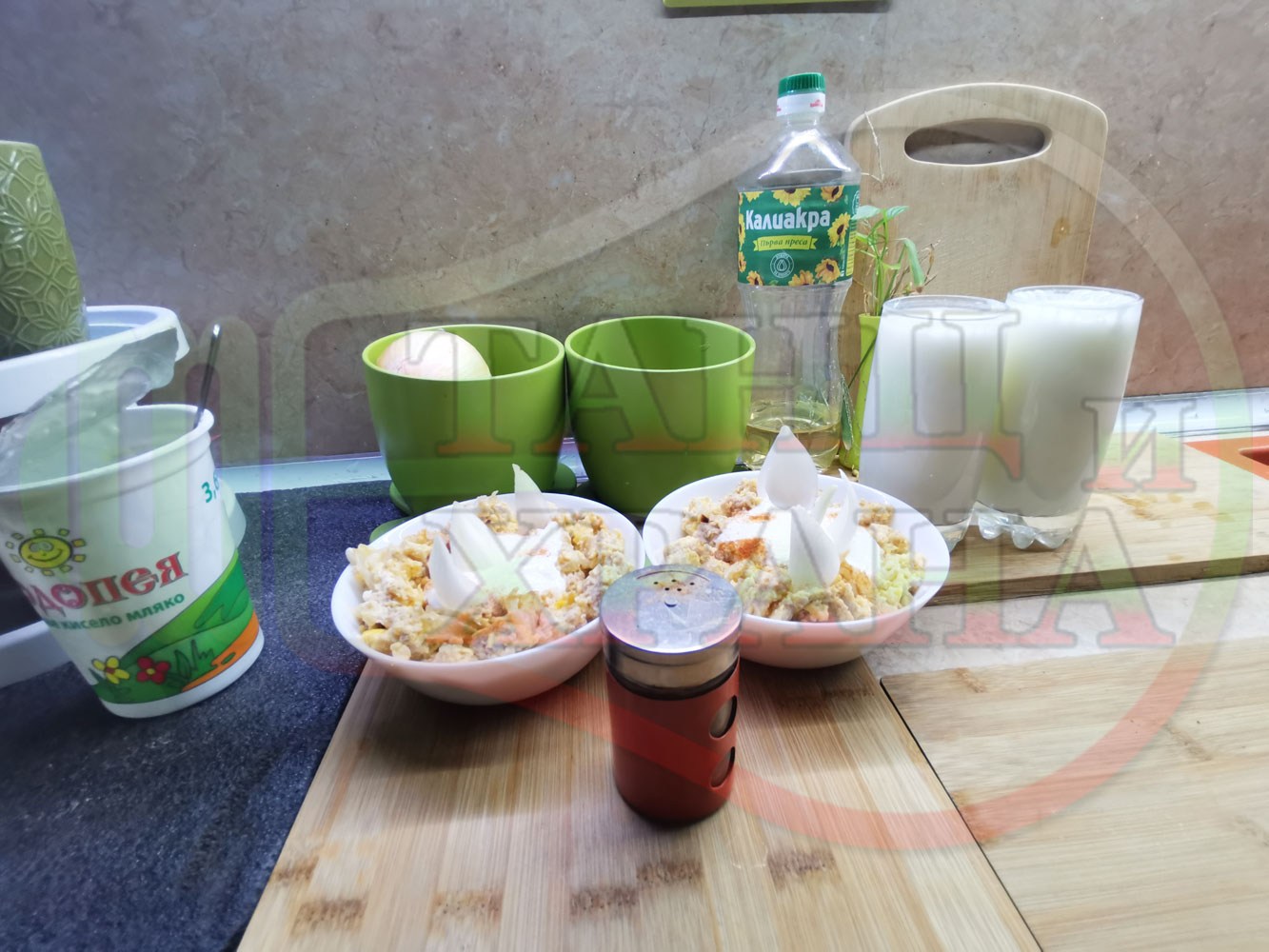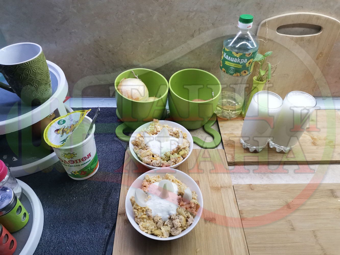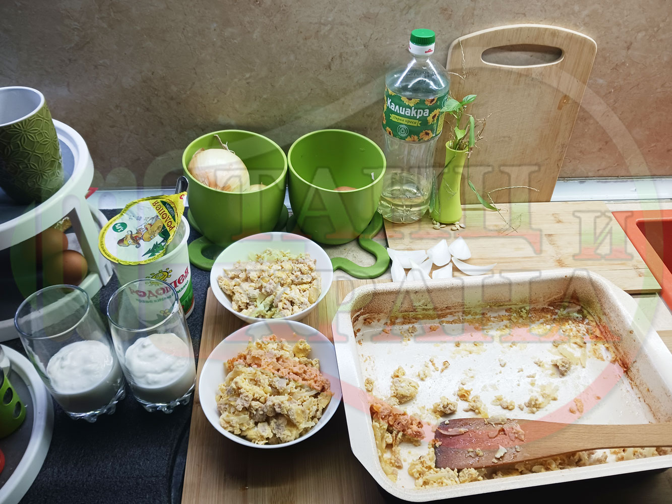 ПРОДУКТИ: Приблизителни количества за български бъркани яйца "Каймянояйчена киселомлечна бърканица" сварена и запечена на фурна с кромид лук и неовкусена кайма (смес) гарнирани с кисело мляко от България