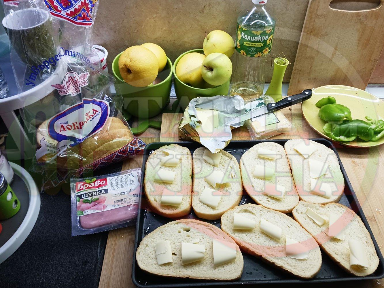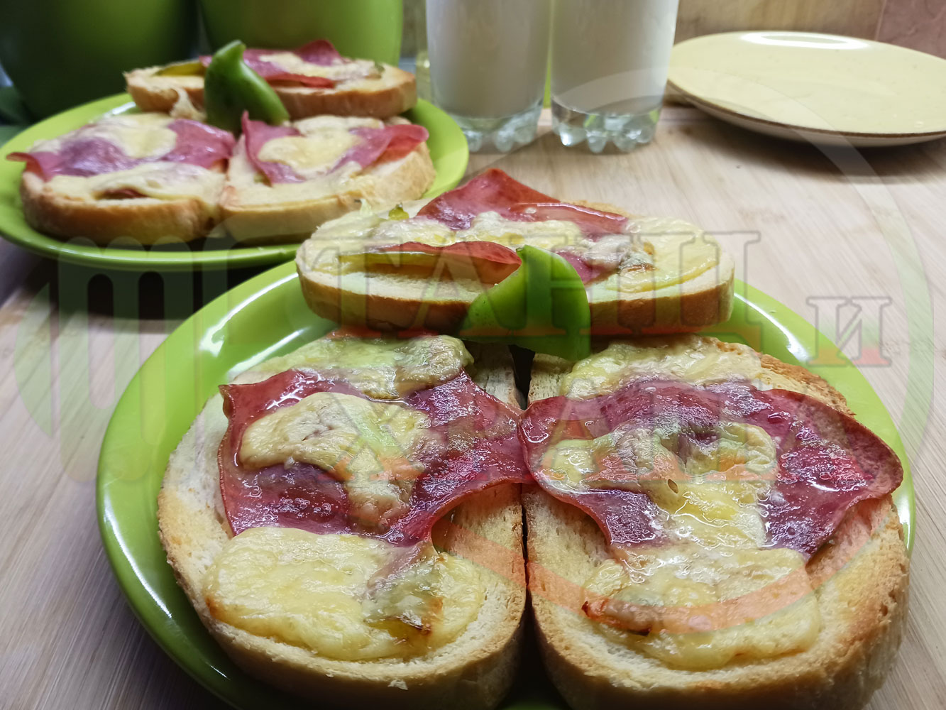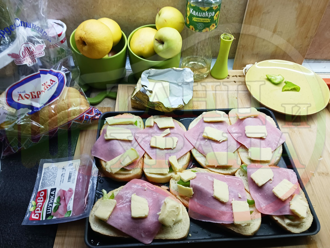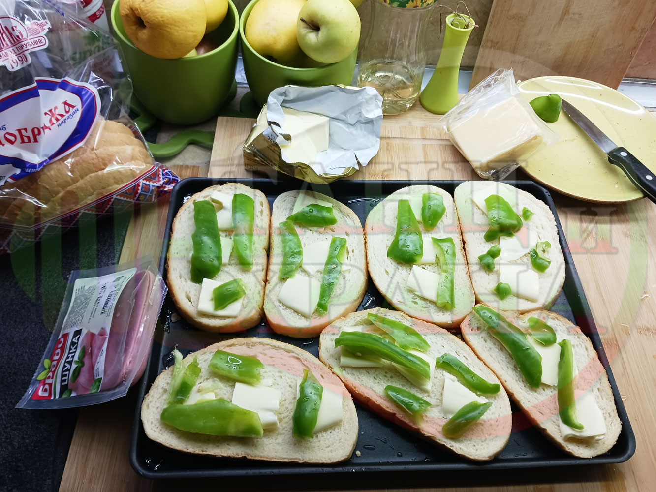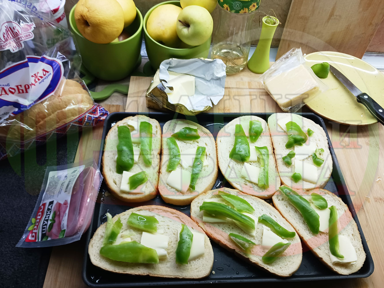 Български филийки "Шункови зеленочушкови кашкавалени" запечени на фурна с краве масло, зелени пресни чушки, шунка и млечен кашкавал
