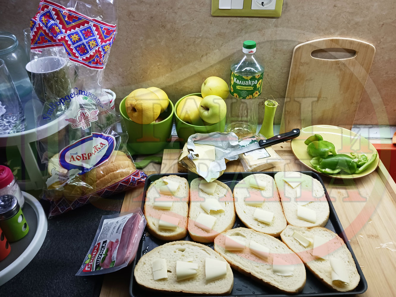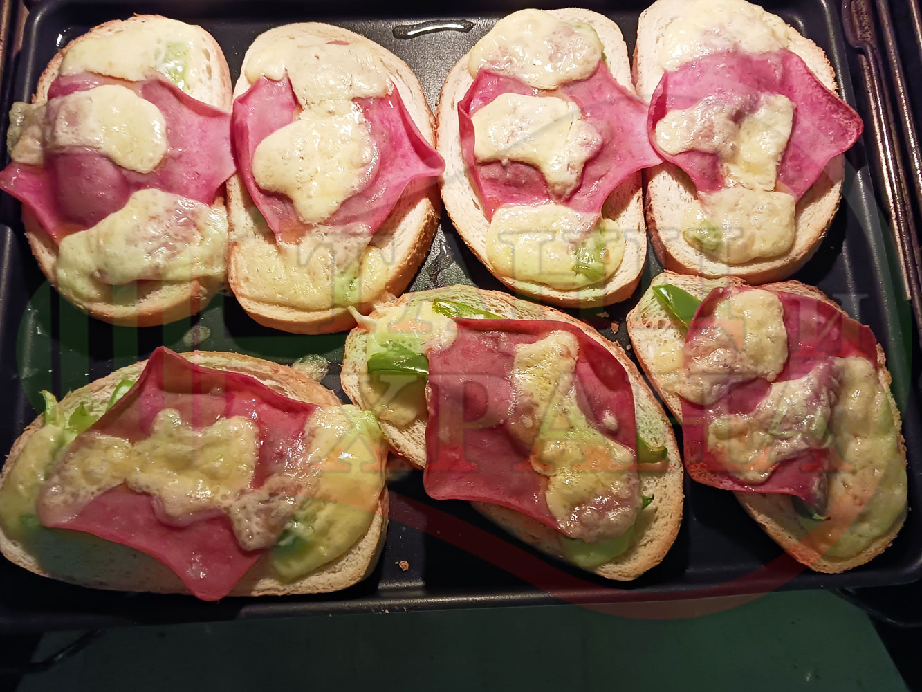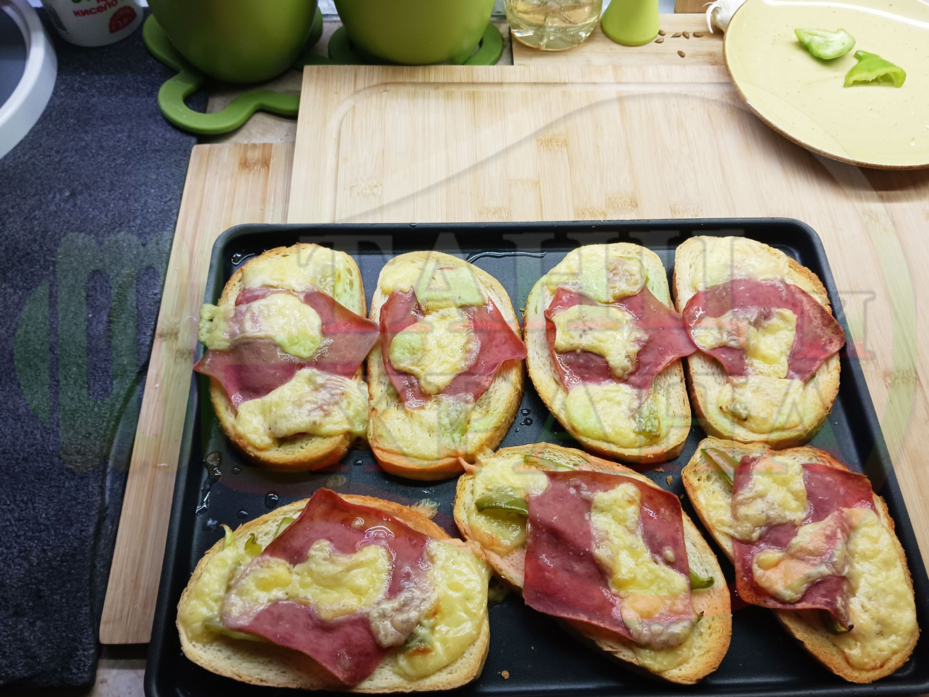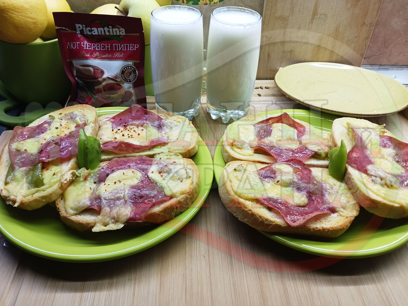Български филийки "Шункови зеленочушкови кашкавалени" запечени на фурна с краве масло, зелени пресни чушки, шунка и млечен кашкавал