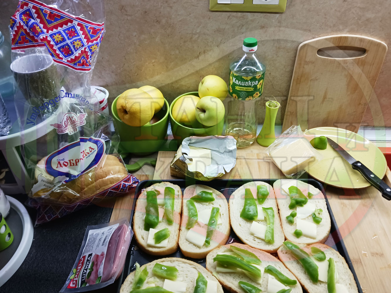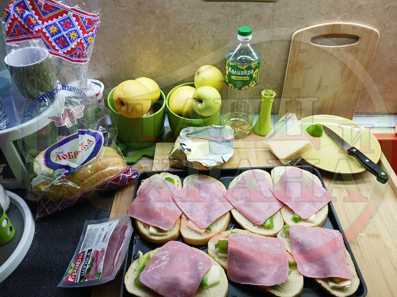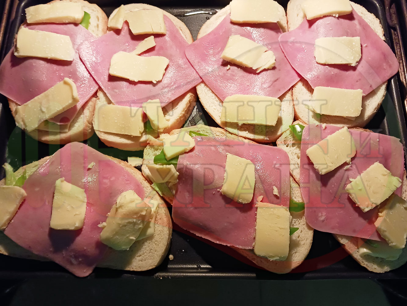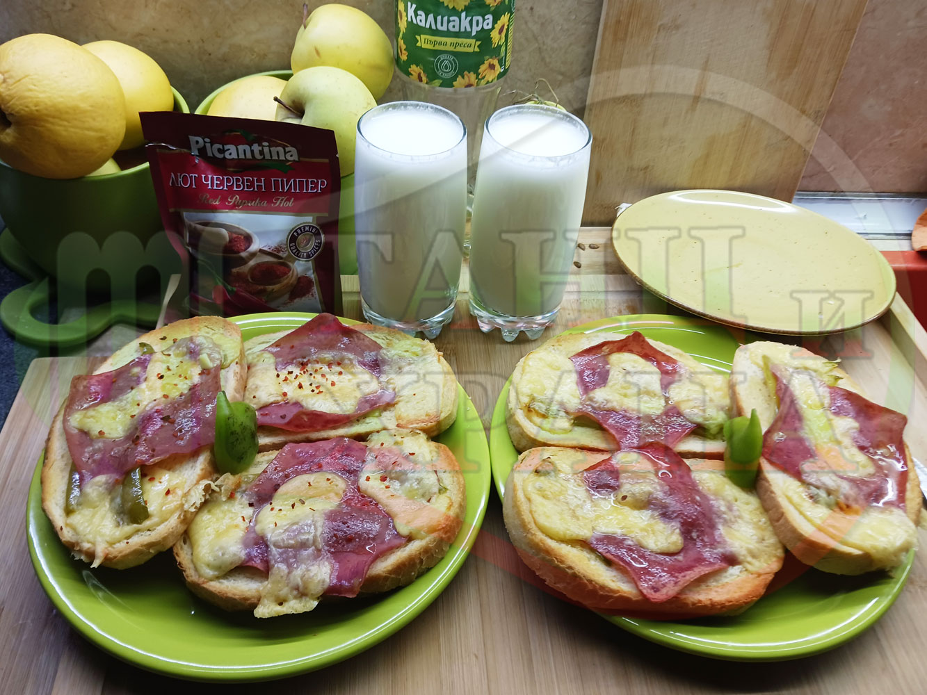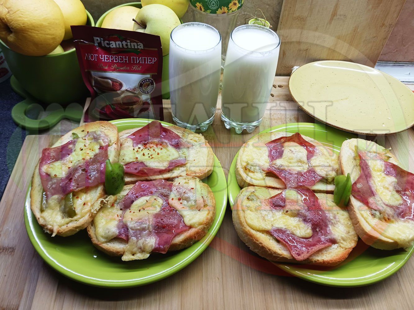 Български филийки "Шункови зеленочушкови кашкавалени" запечени на фурна с краве масло, зелени пресни чушки, шунка и млечен кашкавал