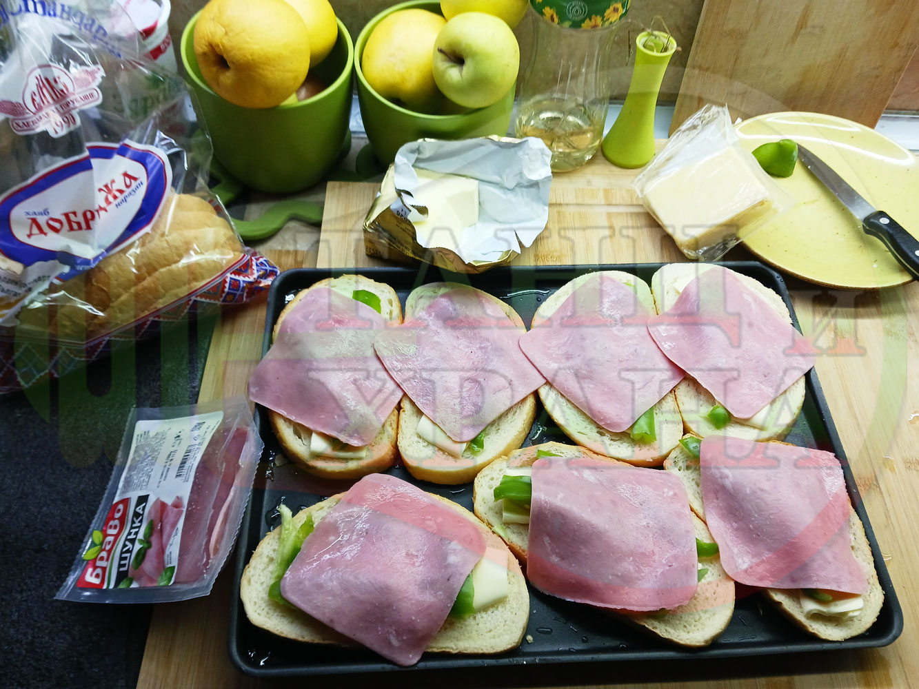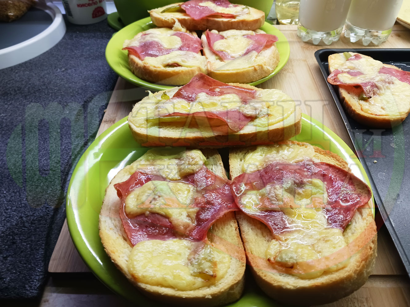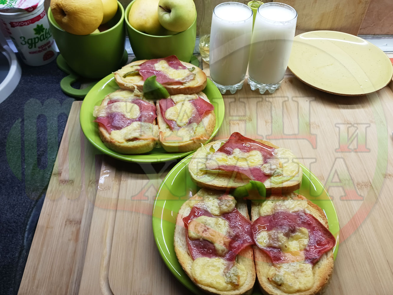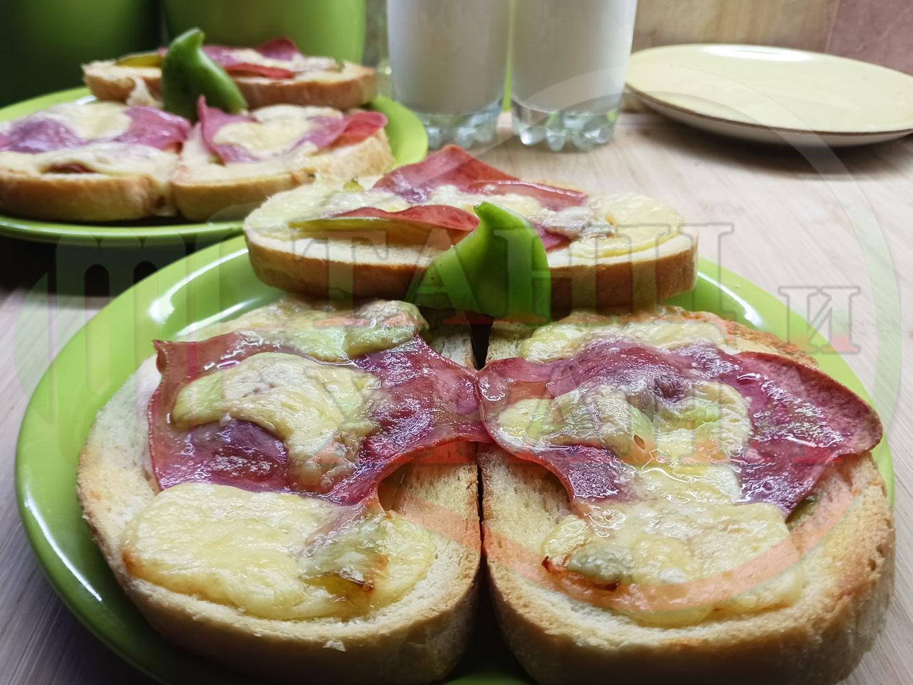 Български филийки "Шункови зеленочушкови кашкавалени" запечени на фурна с краве масло, зелени пресни чушки, шунка и млечен кашкавал